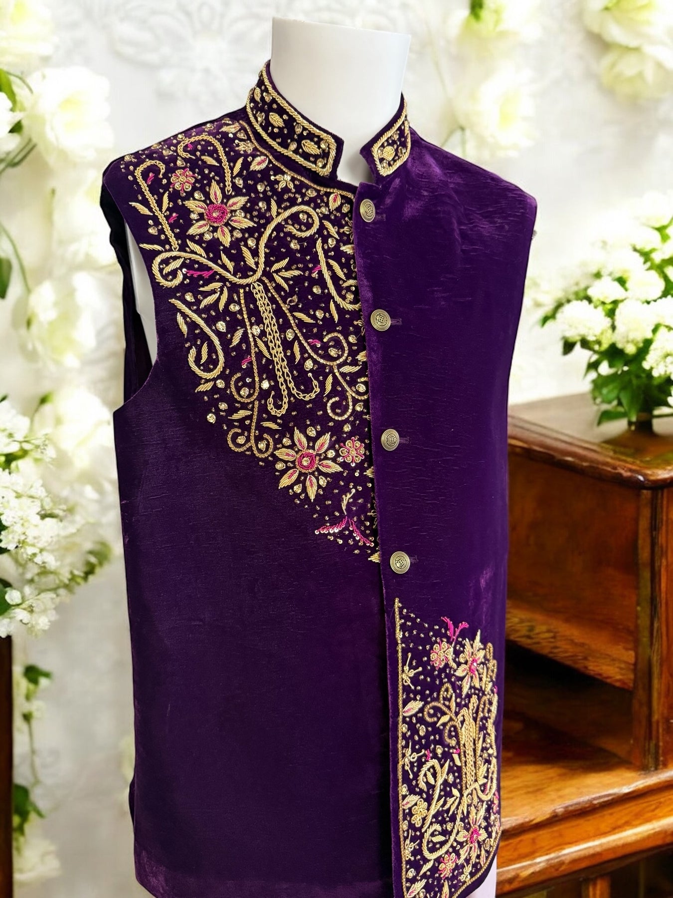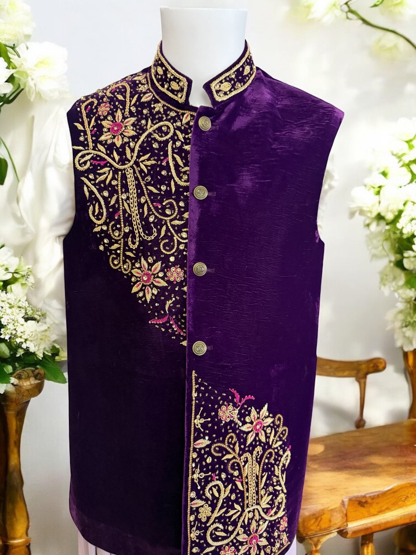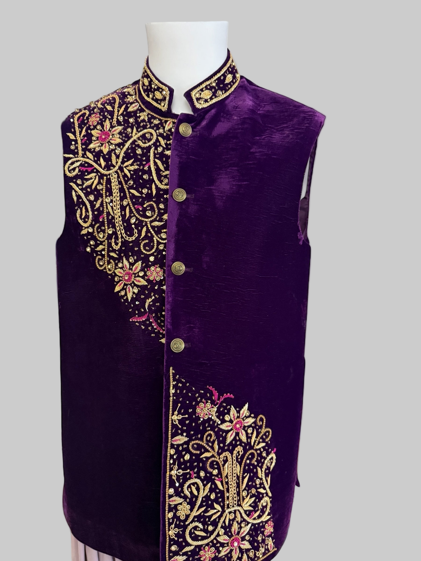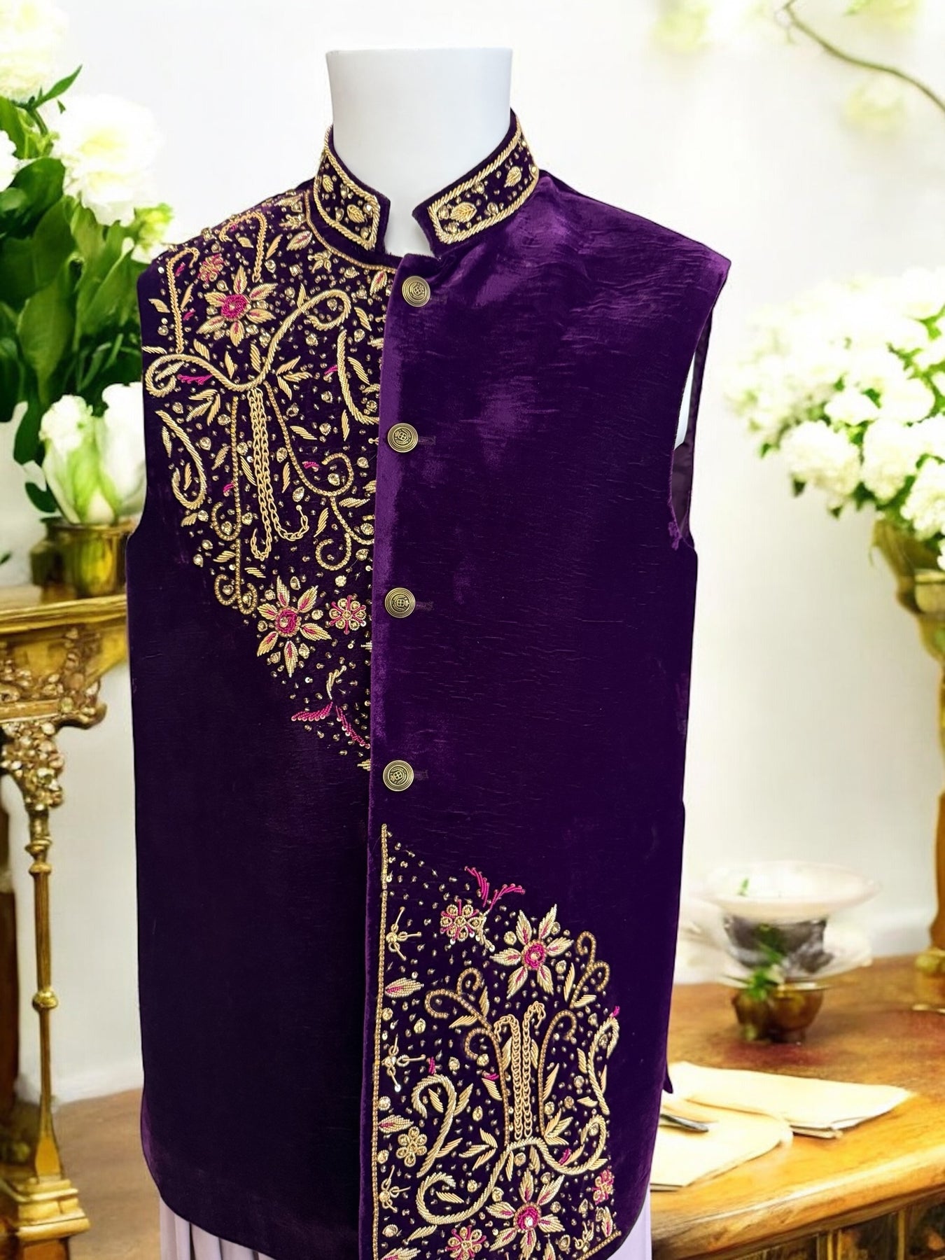 Step into pure luxury with this Large Royal Purple Velvet Designer Vestcoat, a masterpiece of handcrafted artistry and premium tailoring. Made from rich, deep purple velvet, this waistcoat features intricate hand-embroidered dabka, tilla, zari, and beadwork, creating a striking combination of gold and pink floral patterns.