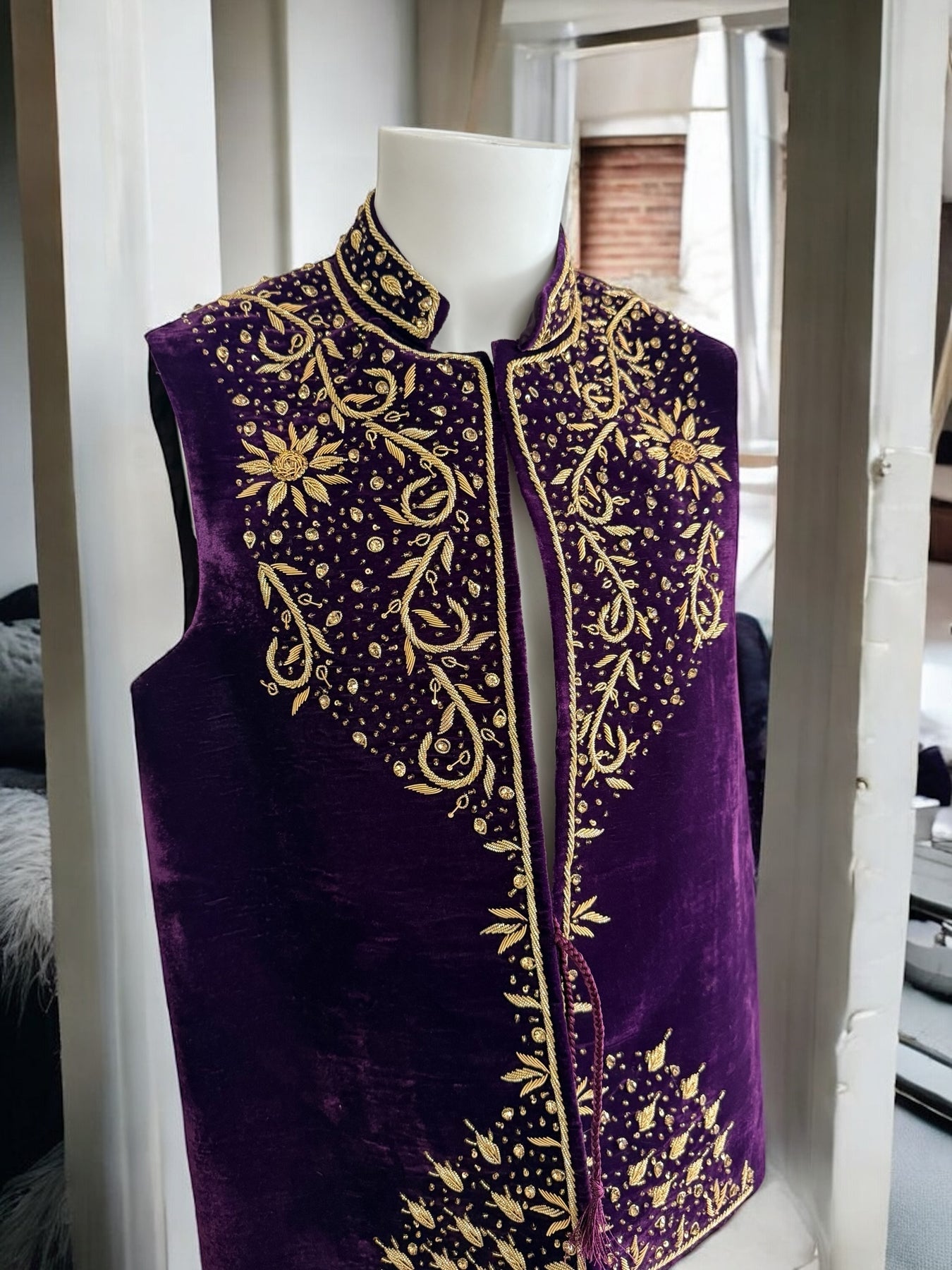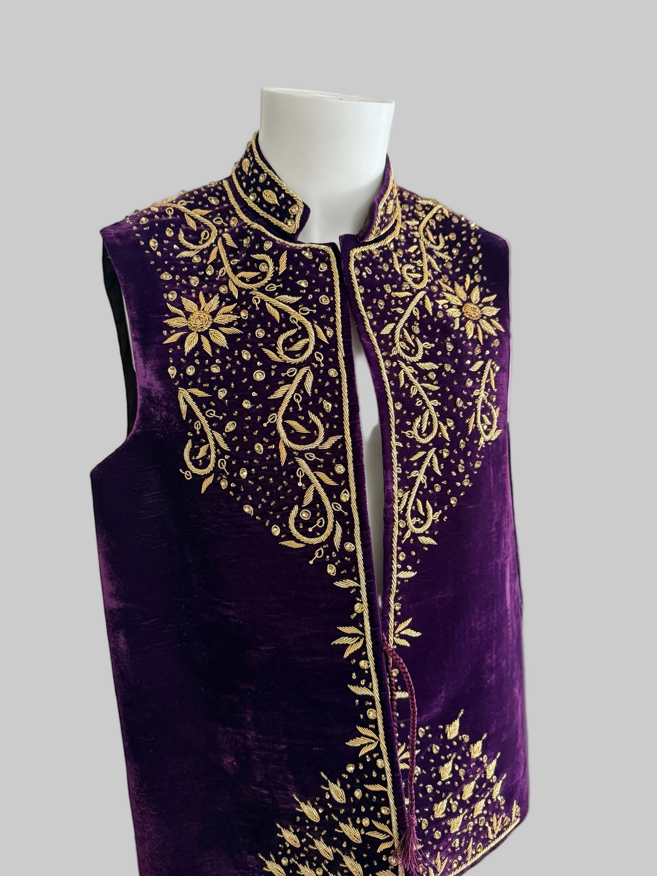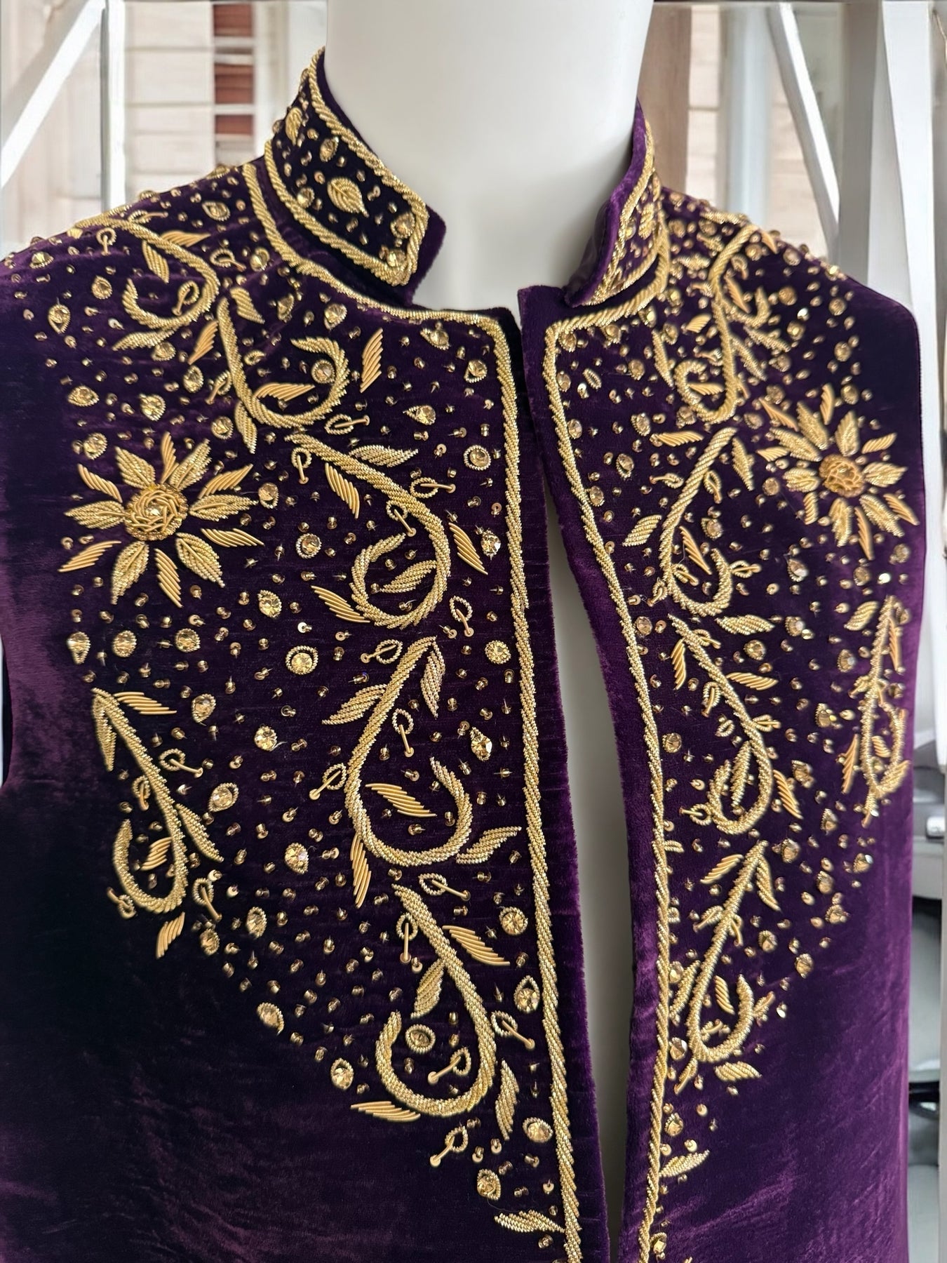 Elevate your formal look with this Large Royal Purple Velvet Hand-Embroidered Waistcoat, a true masterpiece crafted by expert artisans. Made from premium deep-purple velvet, this luxurious vestcoat features rich gold zari, dabka, tilla, and bead embroidery, designed in a symmetrical floral and vine pattern that radiates elegance.