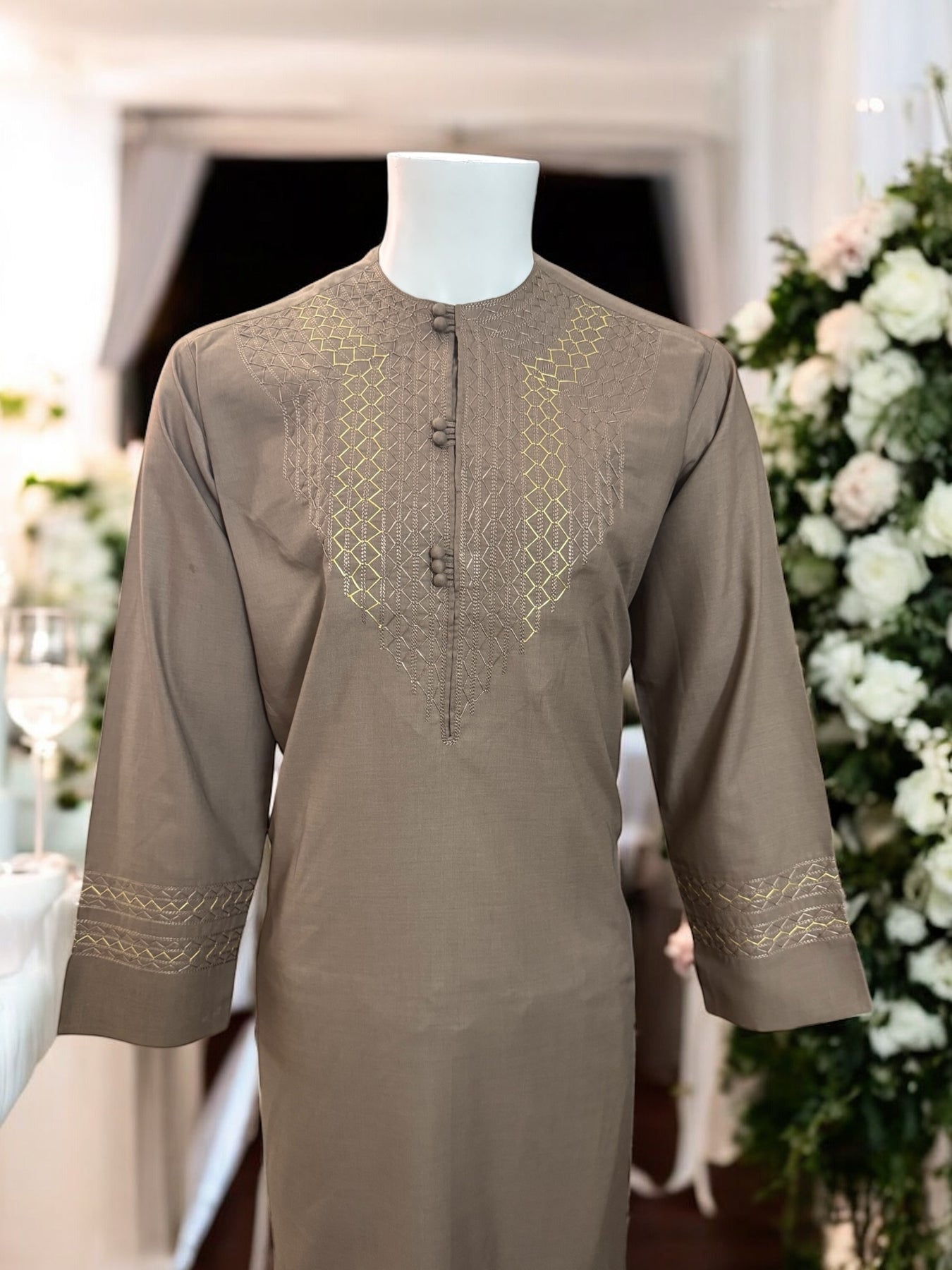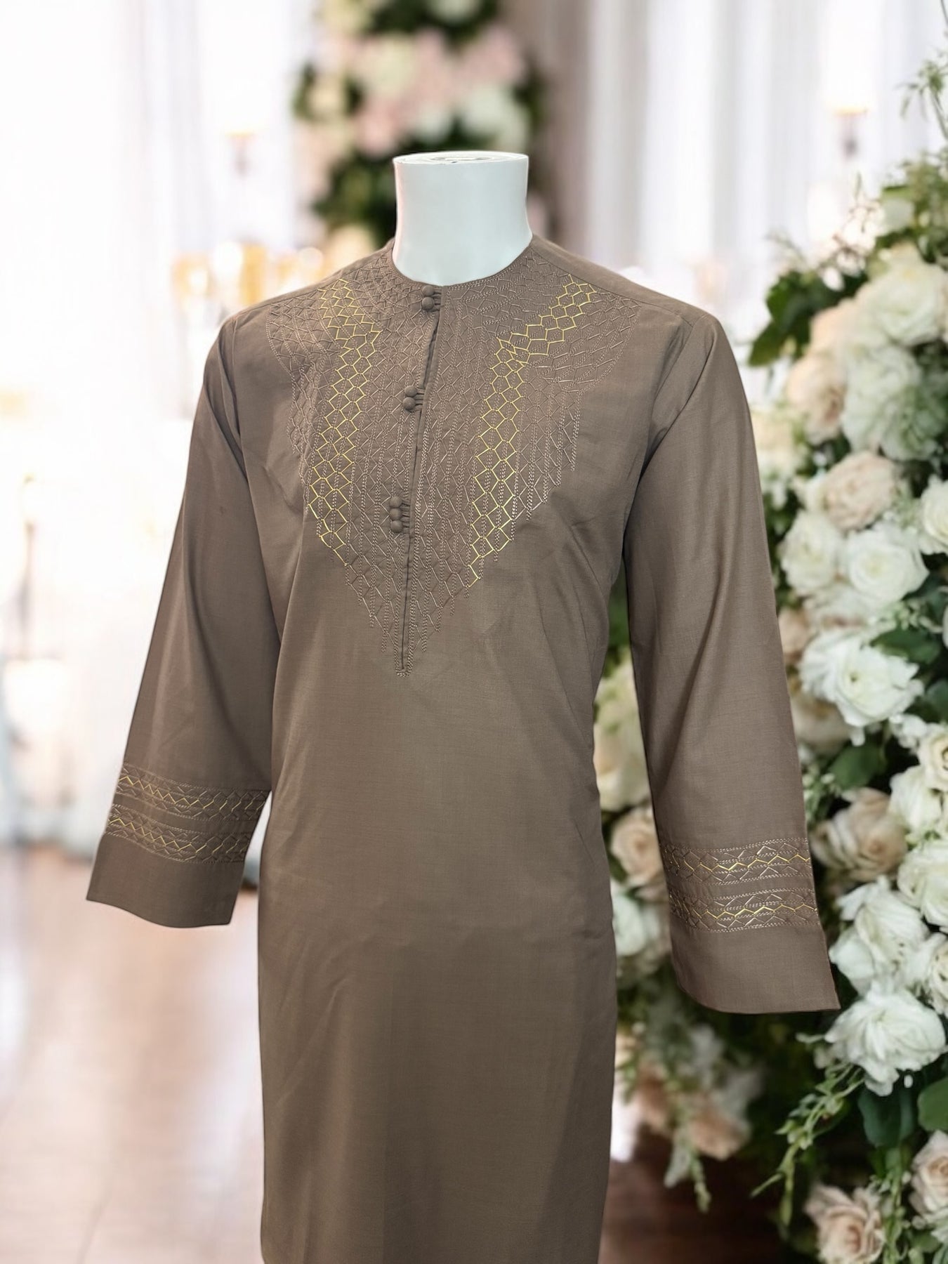 Crafted from a premium cotton-polyester blend, the outfit offers exceptional breathability, comfort, and an elegant drape. The rich brown color enhances the golden-tone embroidery, giving it a refined, royal look perfect for formal events or Eid celebrations.