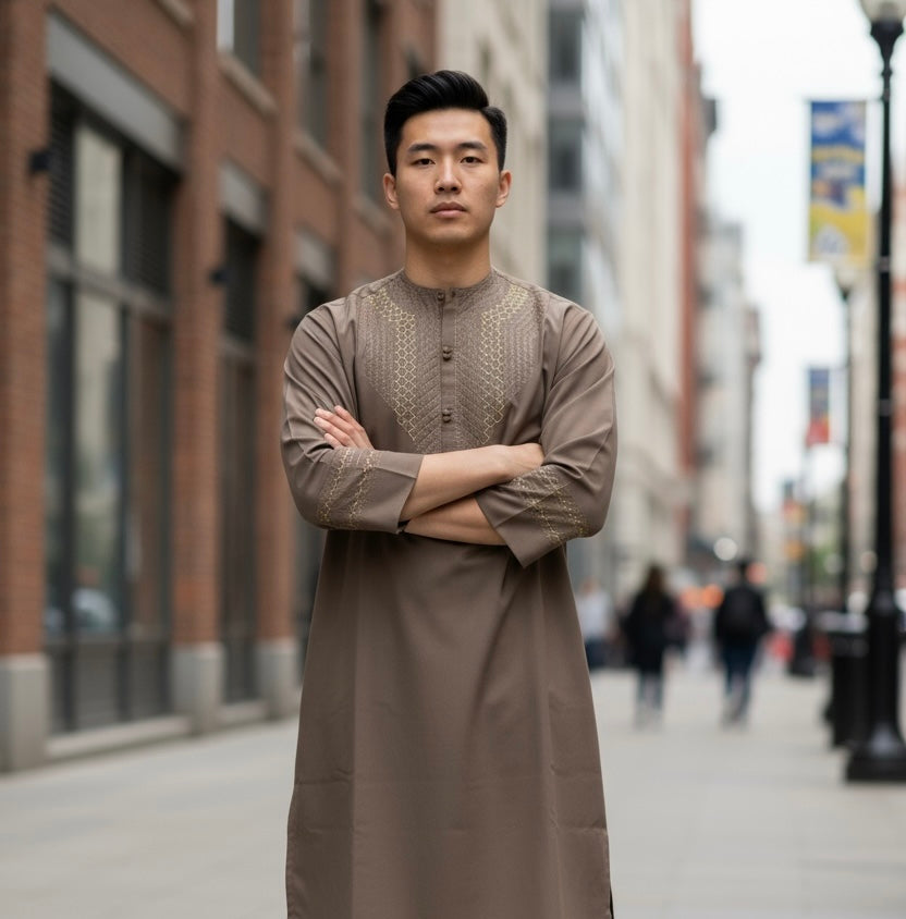 Elevate your cultural wardrobe with this Small handmade brown Parahan Tumban, exclusively designed by Luqmaan Boutique. Featuring fine hand-embroidered khamak detailing along the chest and sleeves, this timeless Afghan piece captures both heritage and sophistication.