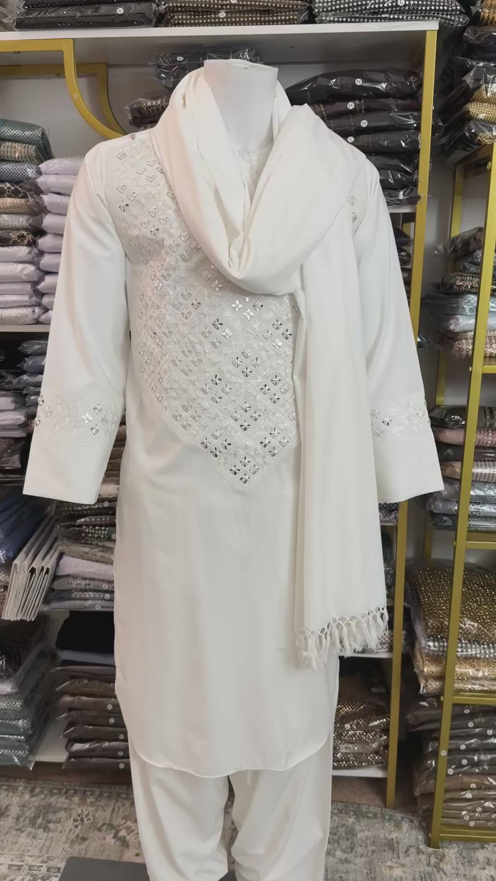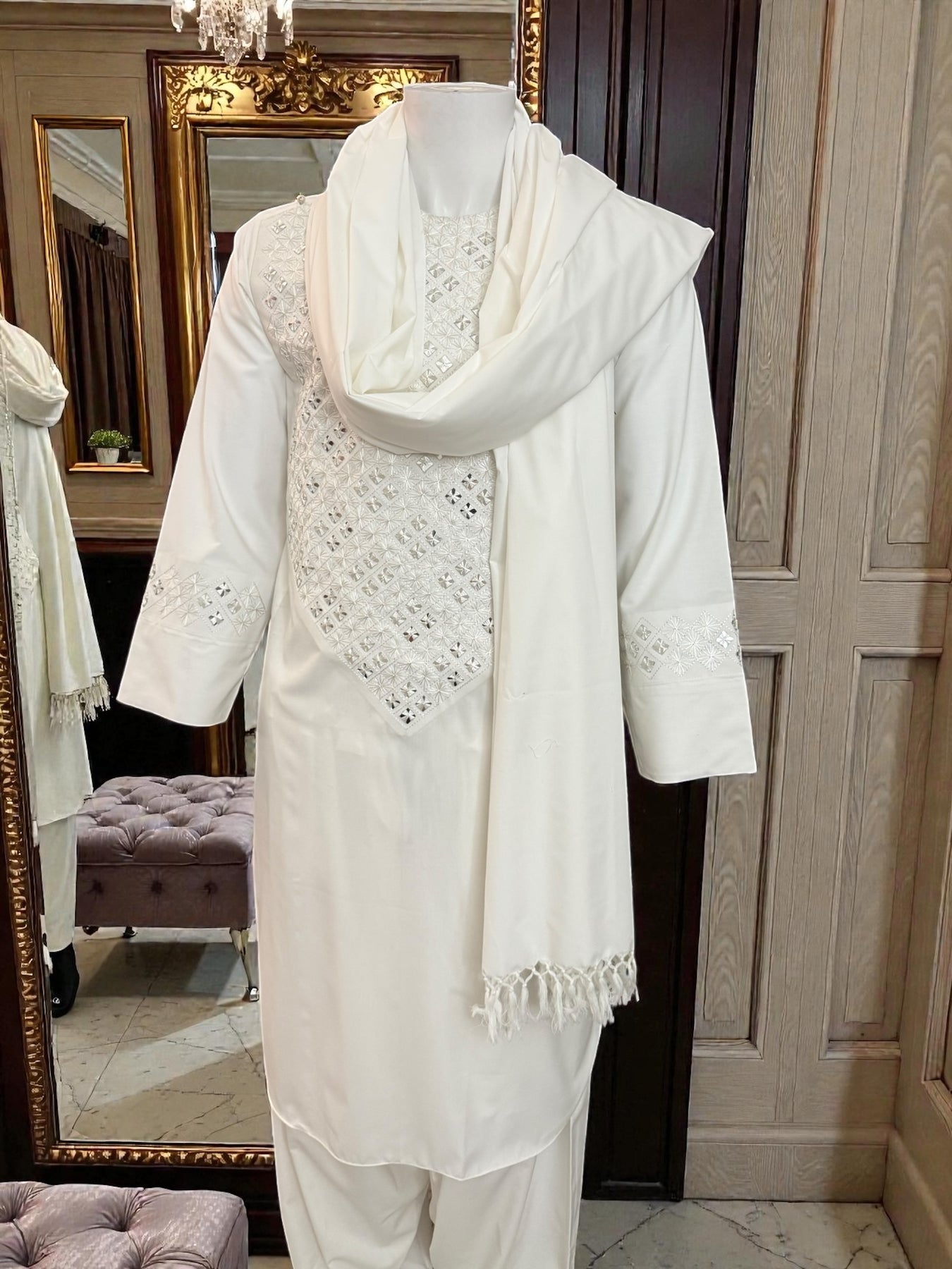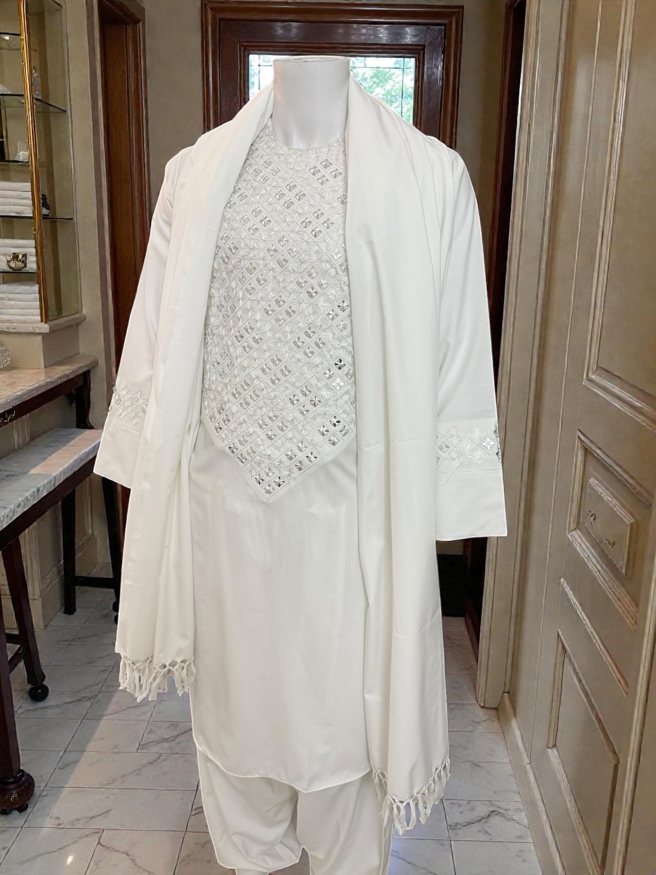 The parahan is beautifully detailed with handmade khamakdozi and mirror work across the front panel and sleeve accents, adding subtle shine and texture to the off-white base. The matching tunban and coordinating shawl complete the three-piece set, making it suitable for prayers, cultural gatherings, Ramadan, Eid, weddings, and formal occasions.