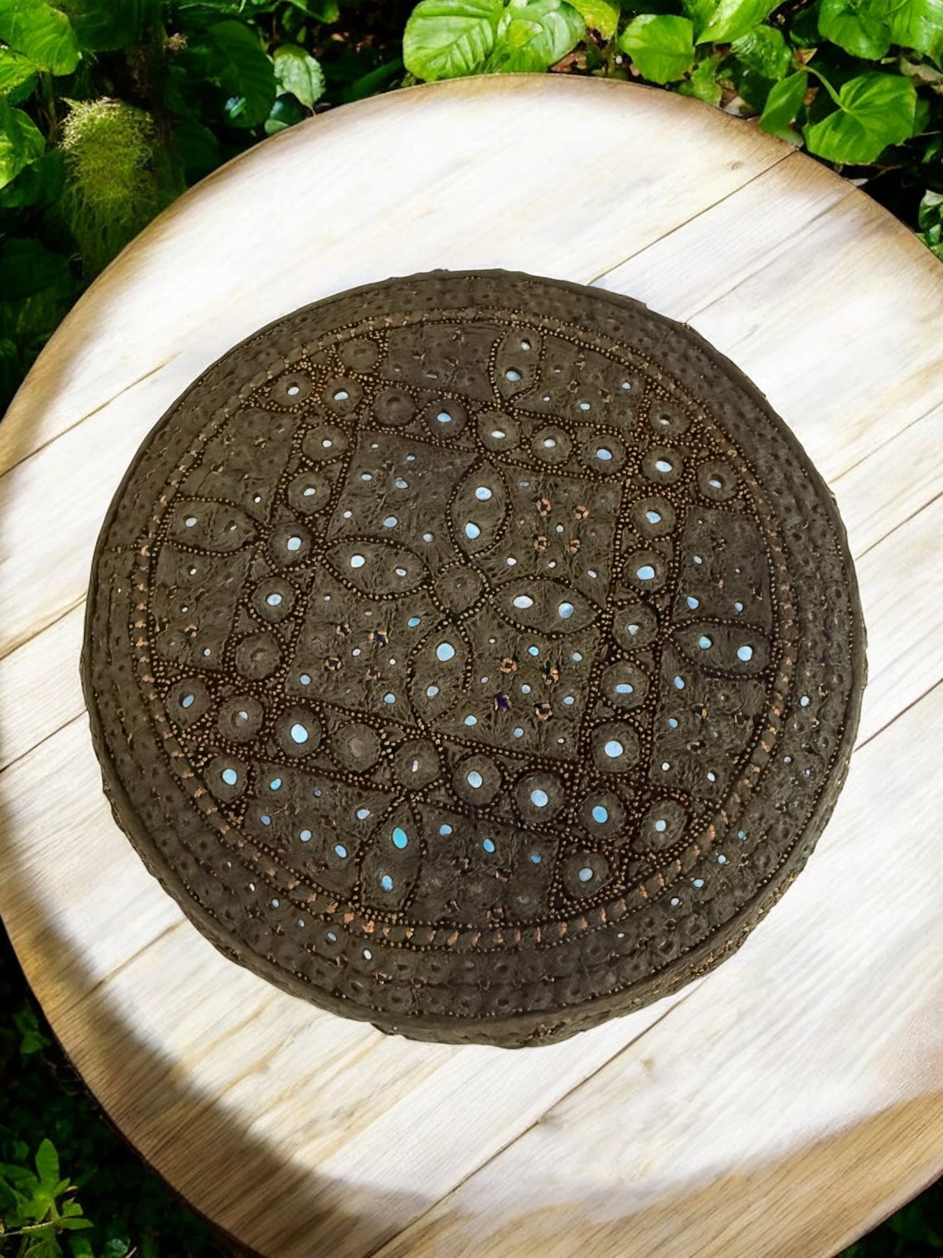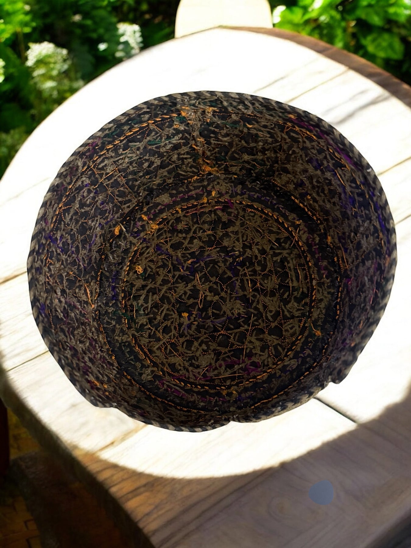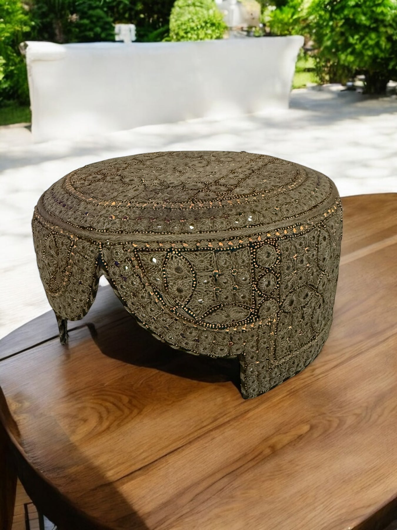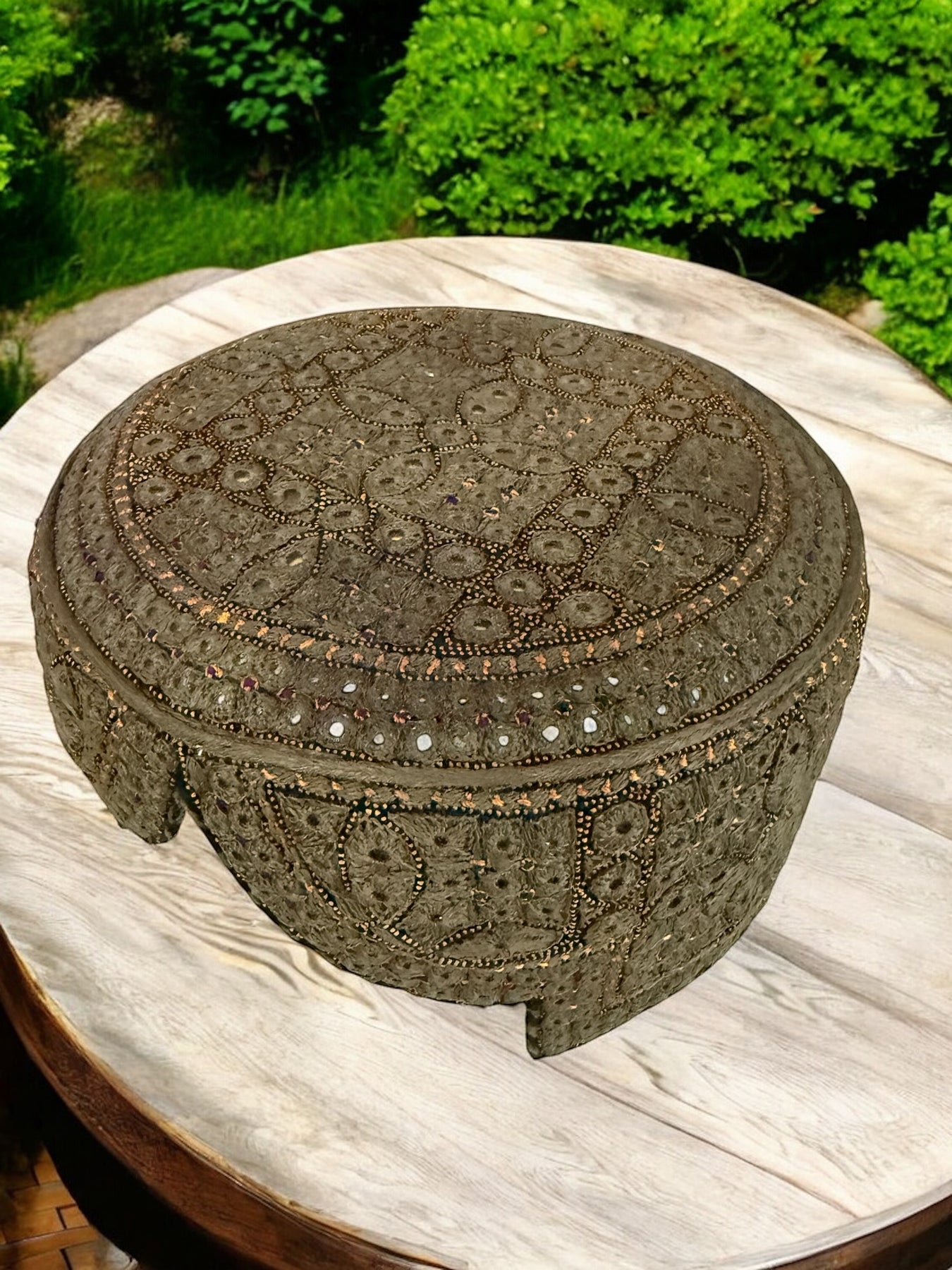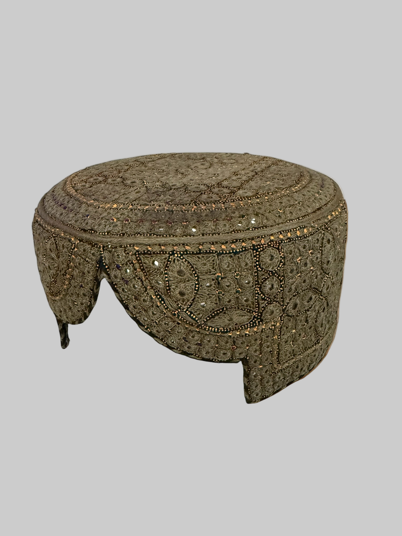 Handcrafted Baluchi hat in olive green featuring detailed shesha (mirror) embroidery. A traditional cap that blends cultural artistry with elegant modern style.