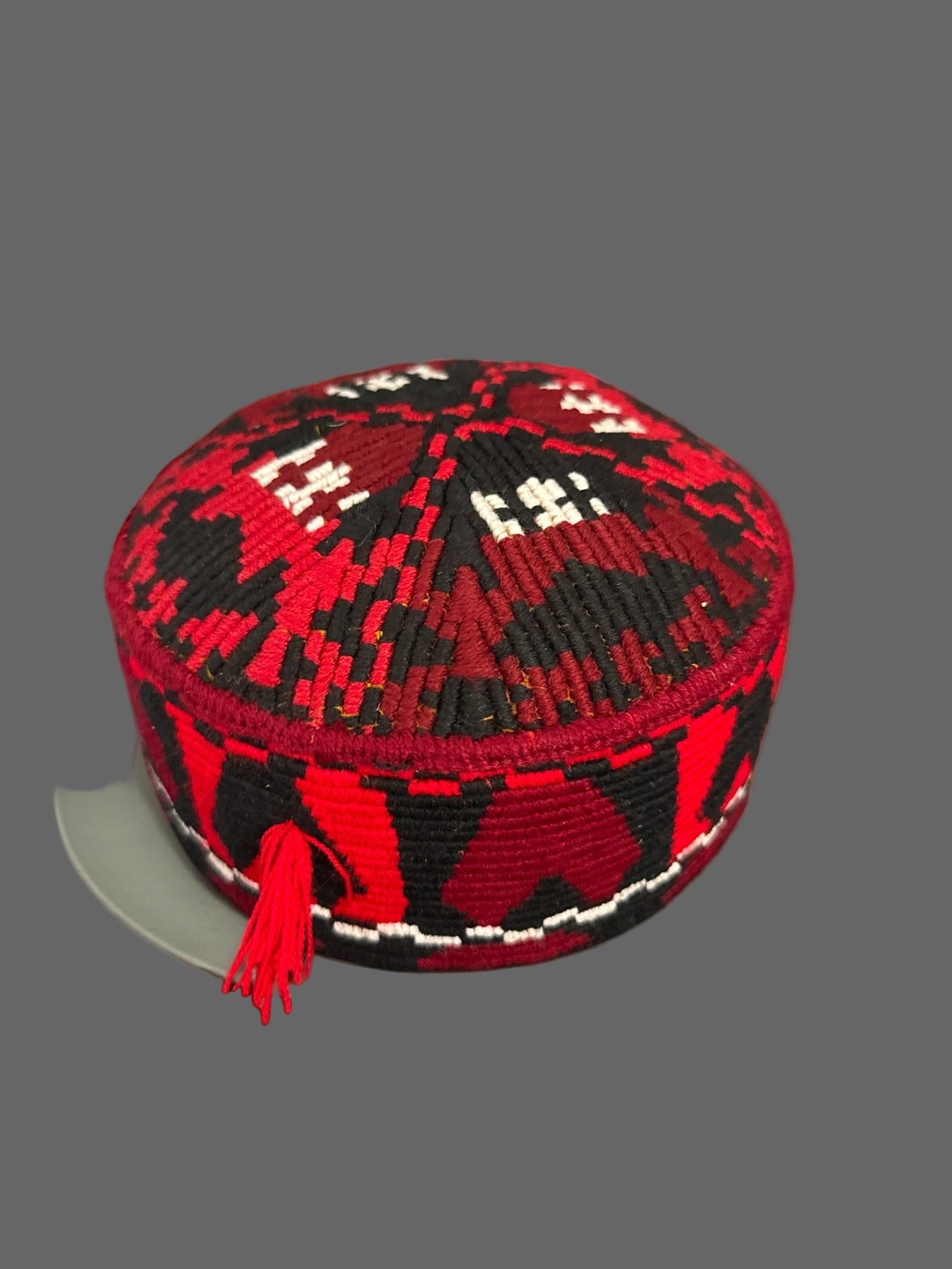 This handcrafted Afghan traditional cap features a striking red and black geometric pattern with subtle white accents, showcasing authentic regional craftsmanship. Woven with precision using durable threads, the cap offers a structured yet comfortable fit, making it suitable for daily wear or special occasions. A matching red tassel on the side adds a classic cultural touch, reflecting heritage style and artisanal detail.
