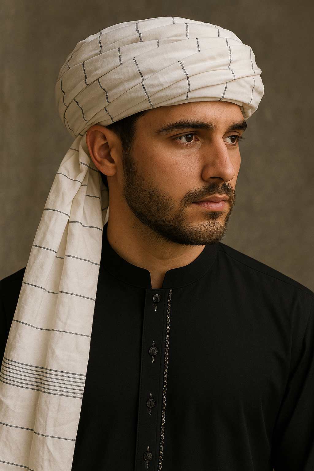• Colors & Patterns: White, black, and grey are most common, though patterned turbans (like checkered or striped) are also widely worn depending on the region.