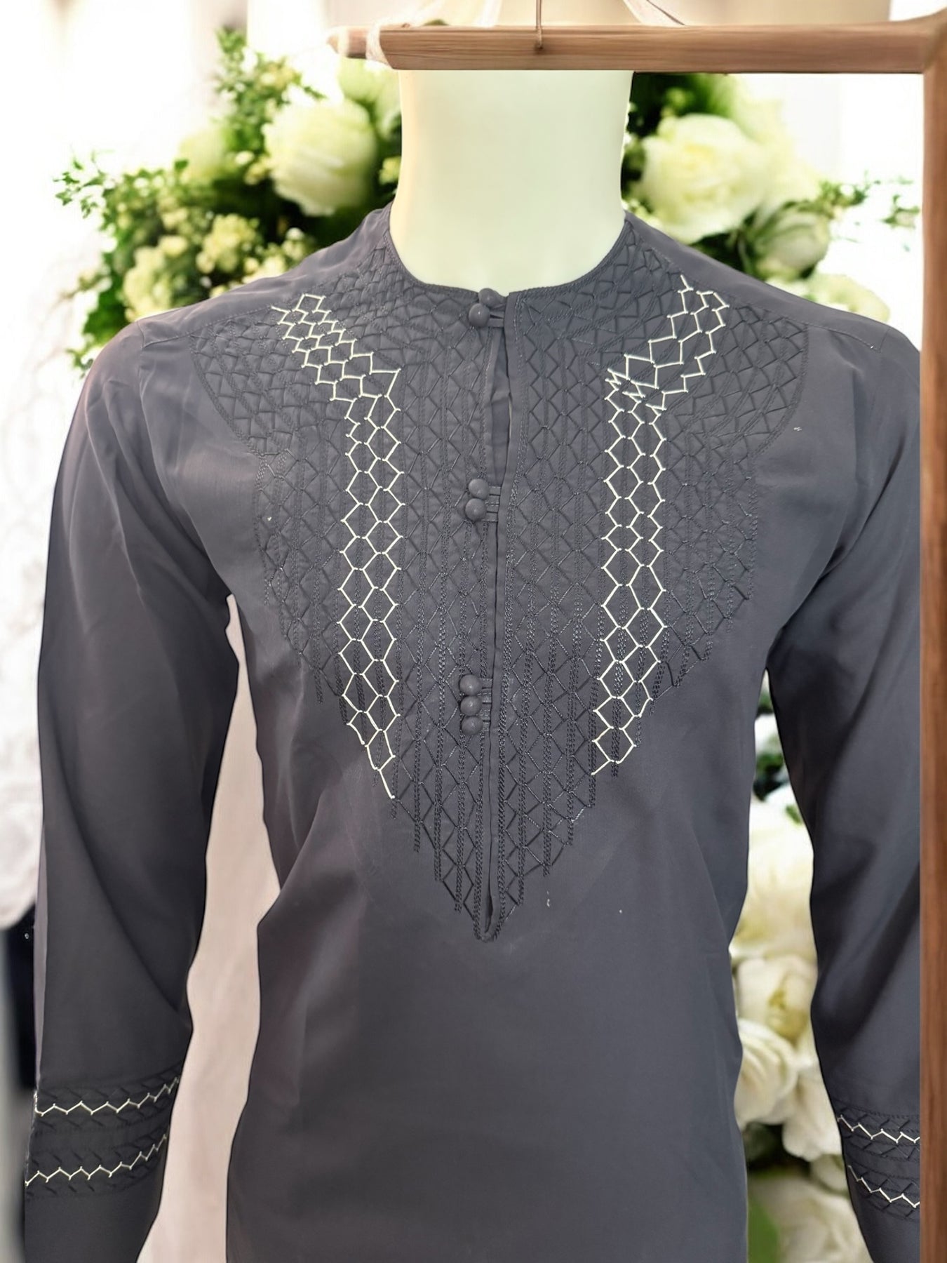 The embroidery features dual-tone geometric detailing on a smooth, soft-textured fabric, blending tradition and sophistication. Ideal for Eid, formal events, or cultural gatherings, this outfit embodies understated luxury and exceptional craftsmanship.