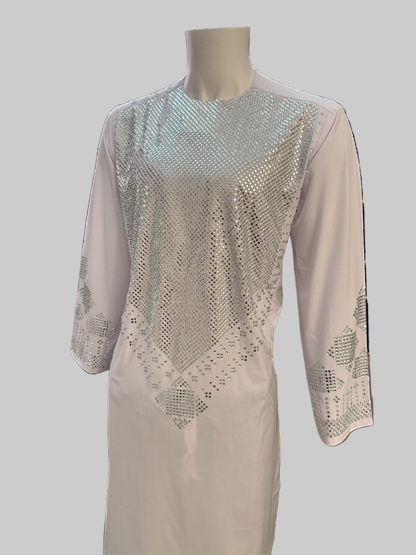 This small white Afghan 2-piece outfit is crafted from a comfortable cotton-poly blend and decorated with detailed Shesha mirror work that adds a bright, traditional touch. The front panel and sleeves feature clean, geometric mirror patterns that reflect classic Afghan craftsmanship while keeping the outfit lightweight and easy to wear.