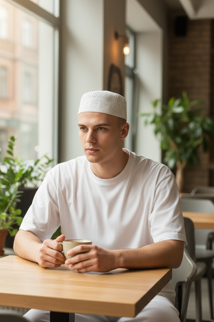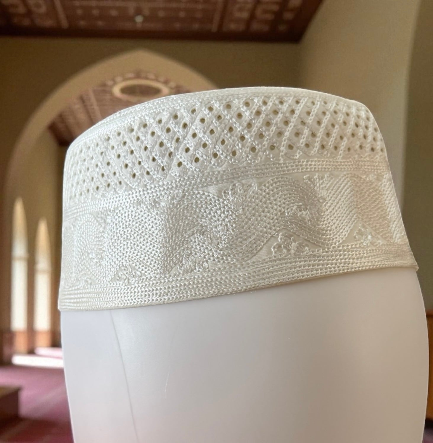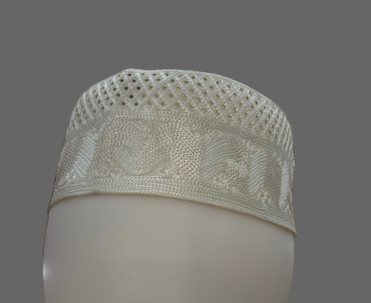 Stylish white kufi cap crafted from a soft cotton-polyester blend, featuring detailed machine embroidery for a refined look. Lightweight, breathable, and durable — ideal for daily prayers, special gatherings, or traditional wear. Perfect balance of comfort and elegance for men’s modest fashion.