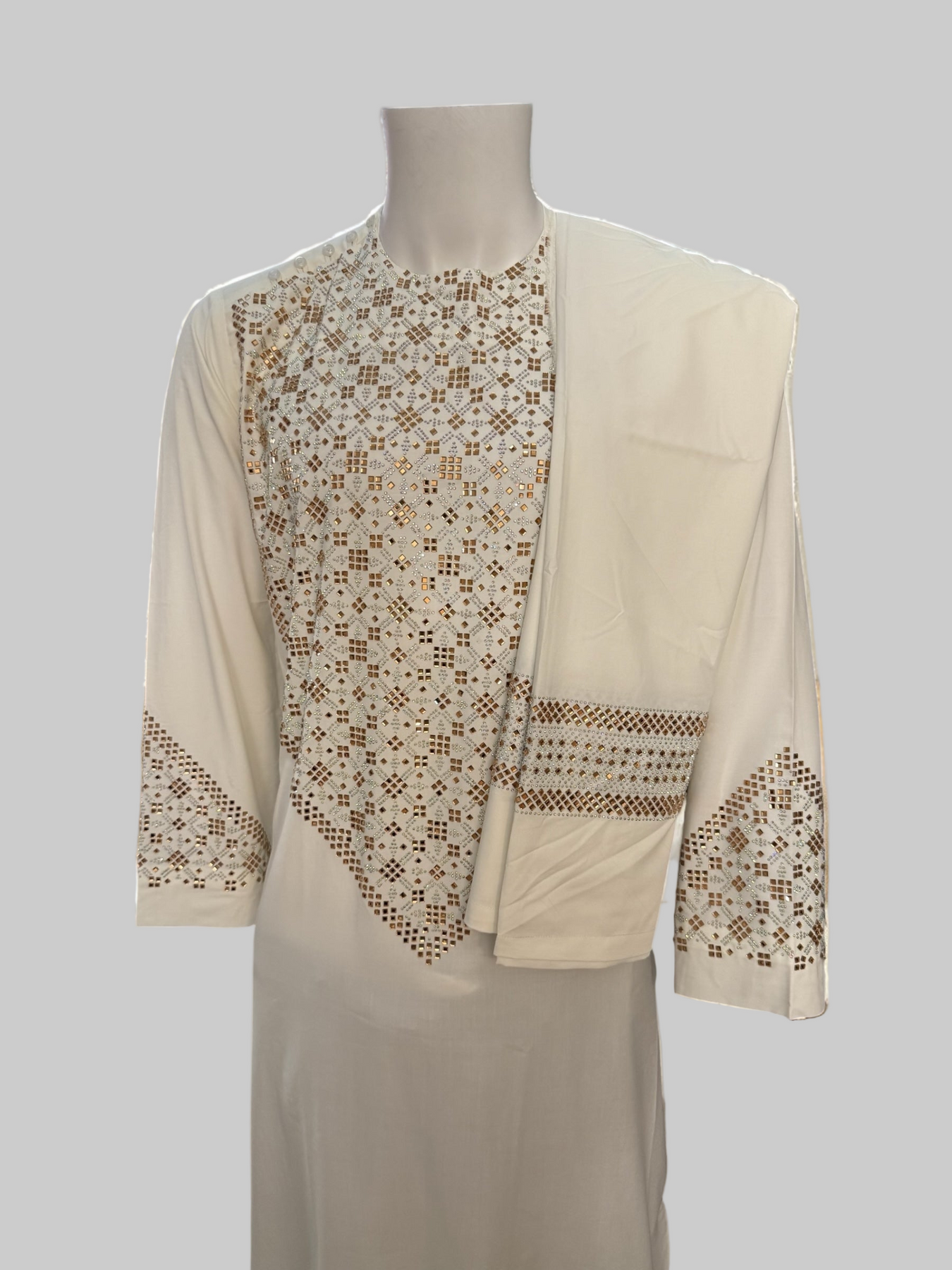 Experience premium traditional style with this elegant off-white Afghan 3-piece Kameez set, beautifully crafted with detailed gold shesha work across the chest and borders. The handcrafted mirror accents add a refined shine, making this outfit perfect for celebrations, cultural events, weddings, and special gatherings.