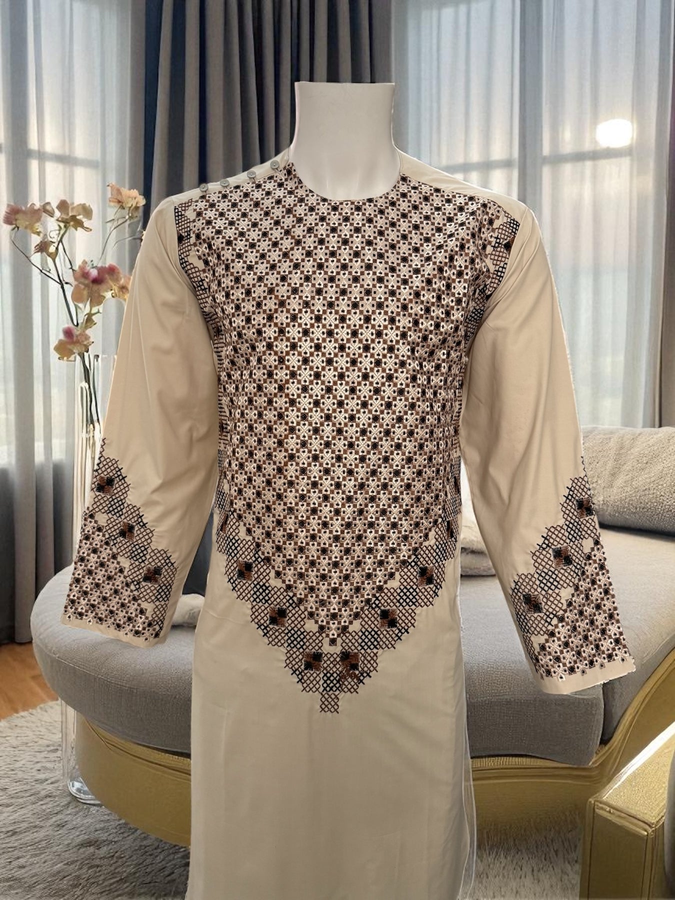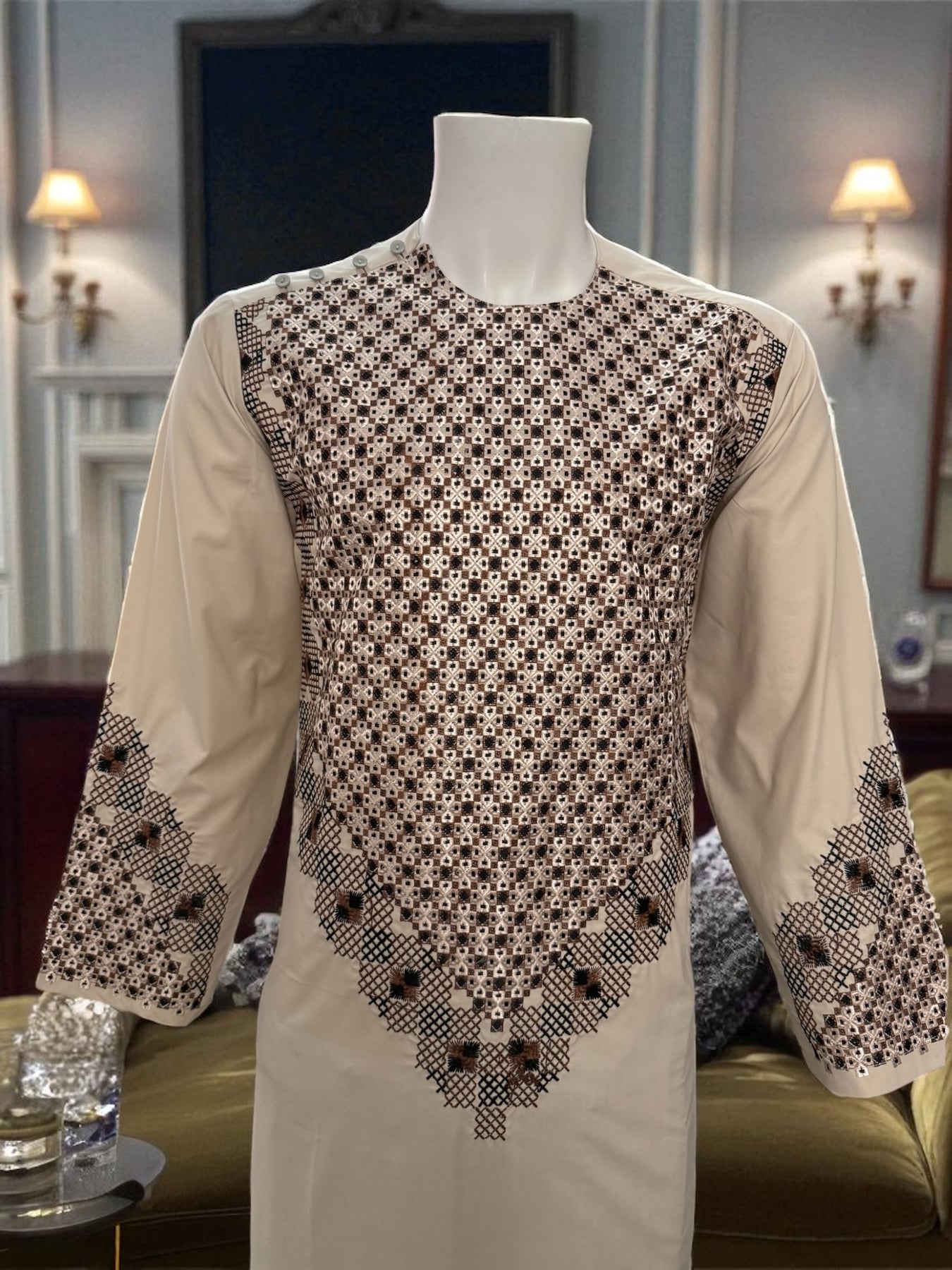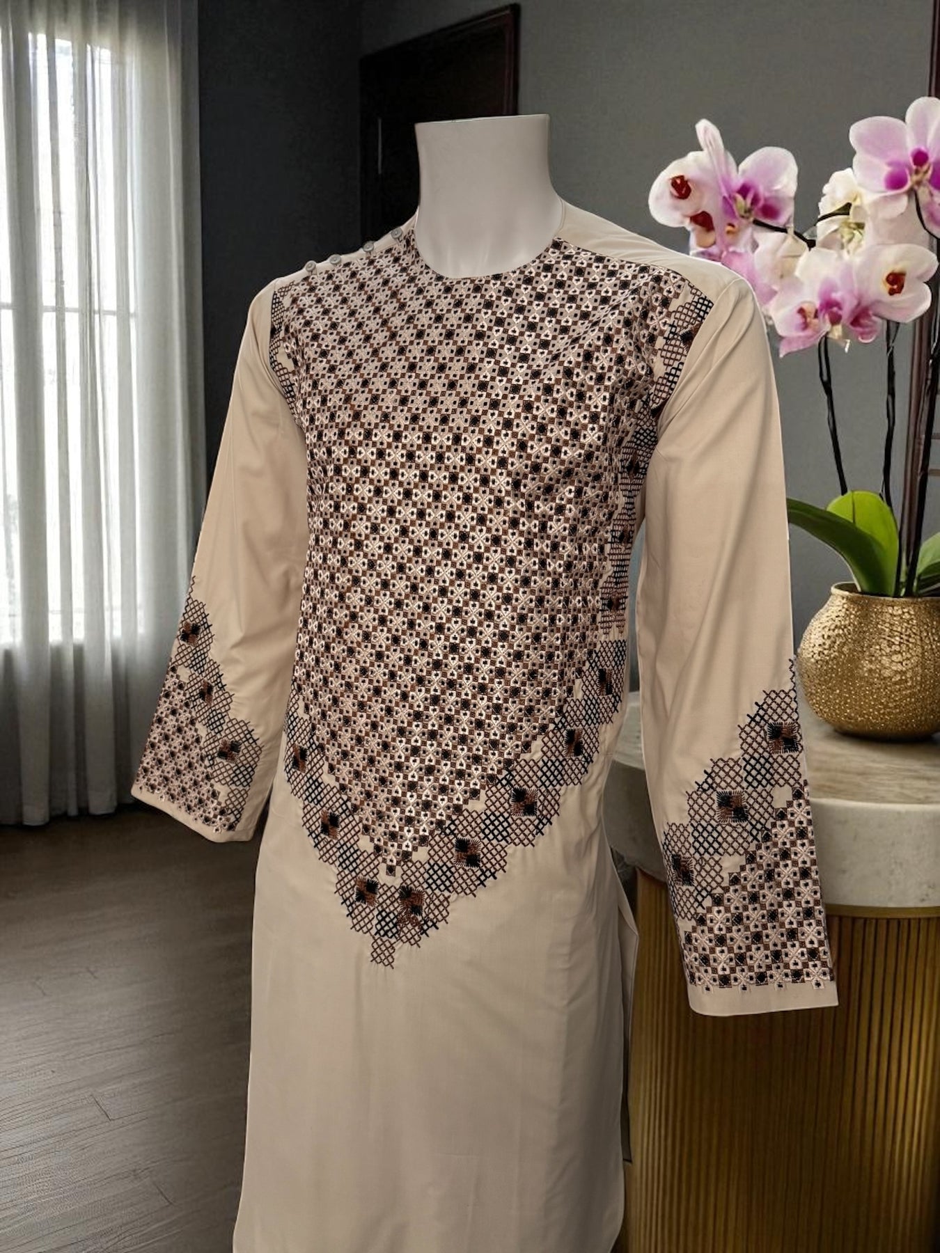 Elevate your traditional wardrobe with the Men’s Cream Kameez with Brown and Black Embroidery, a perfect blend of elegance and style. Crafted with attention to detail, this kameez features intricate machine embroidery in rich brown and black tones, adding a sophisticated touch to its soft cream fabric. Ideal for festive occasions, weddings, or casual gatherings, this kameez ensures you stand out with effortless charm.