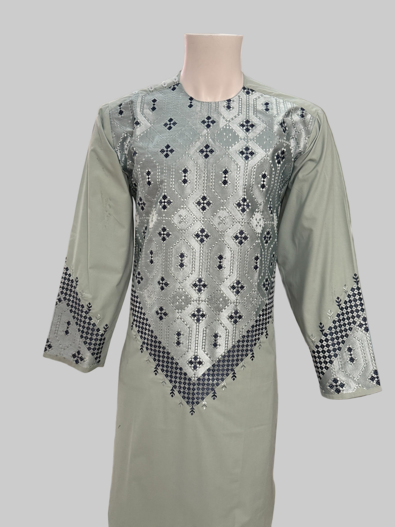 This men’s grayish green kameez features detailed matching and navy blue machine embroidery across the chest and sleeves, giving it a clean and traditional Afghan look. The soft, comfortable fabric provides a smooth drape, making it ideal for cultural events, Eid, gatherings, and everyday traditional wear.
