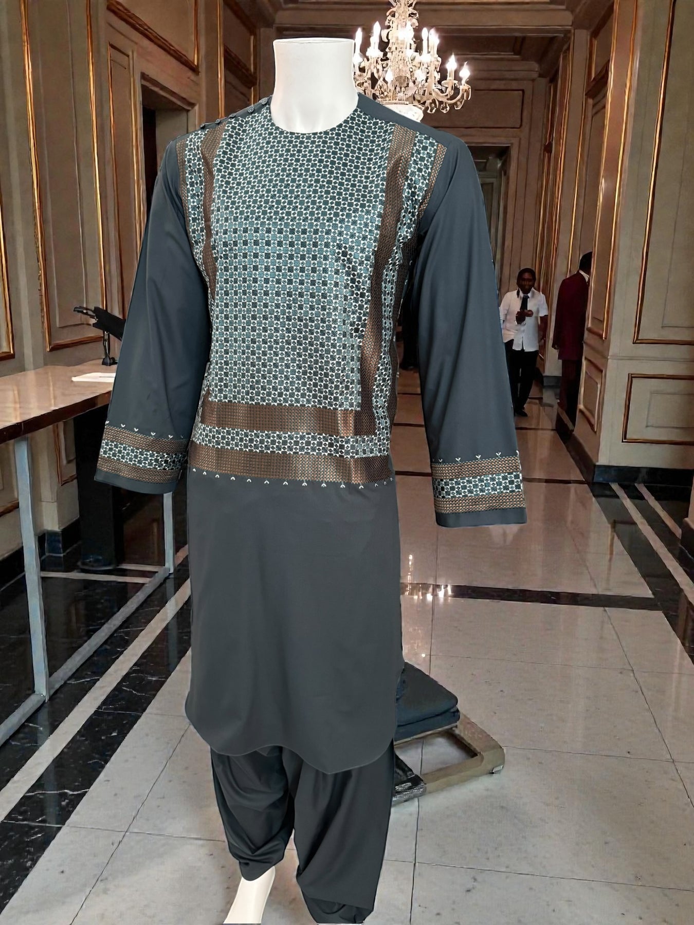 Medium Parahan Tunban set featuring premium machine khamakdozi embroidery with a refined traditional design and elegant detailing. Crafted from smooth, breathable fabric, this set provides comfortable wear while maintaining a polished and structured appearance.