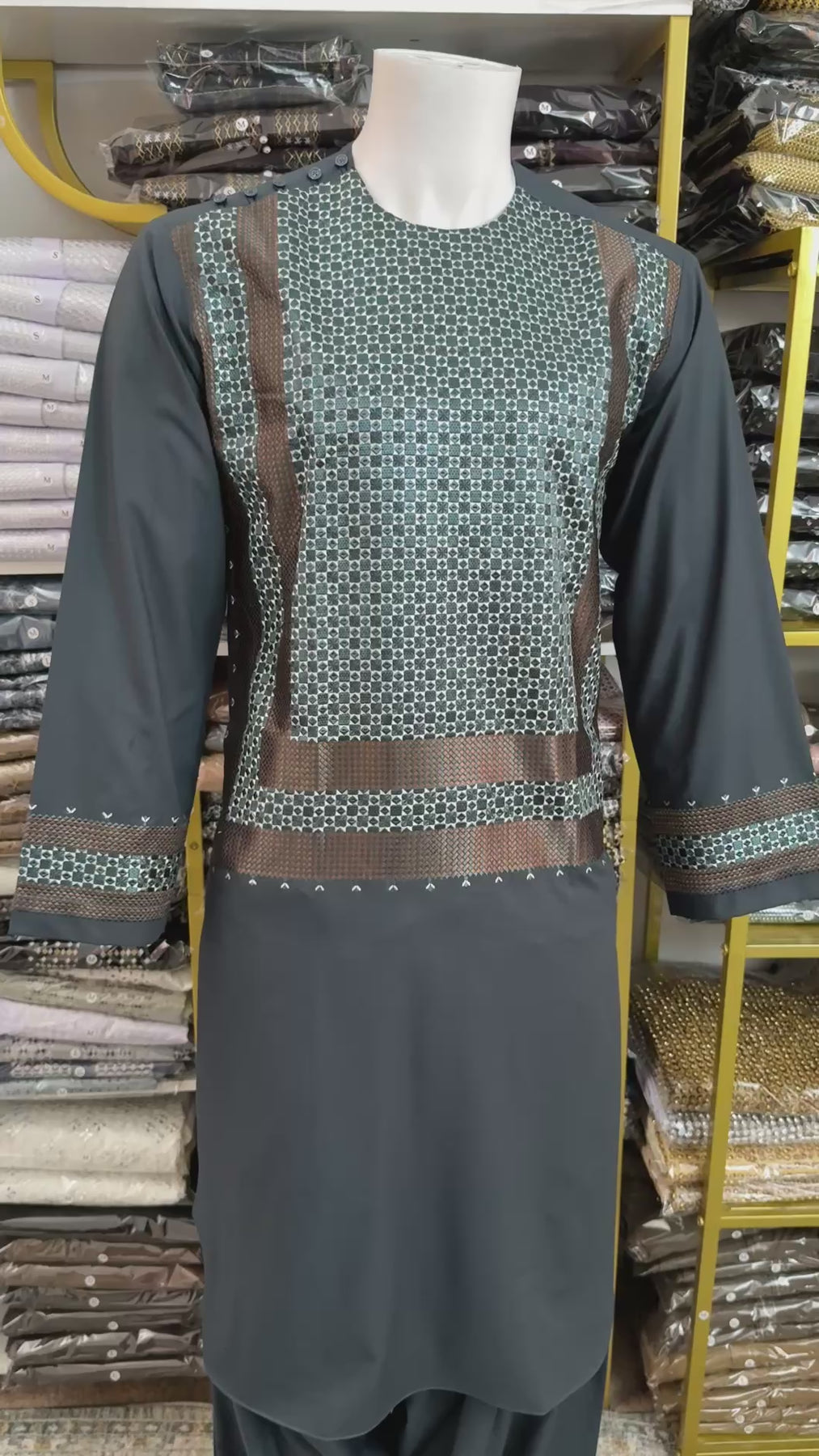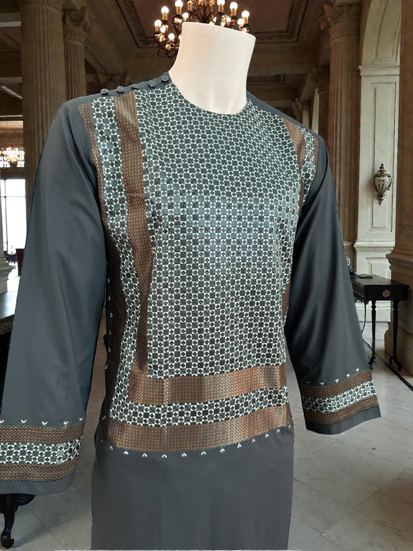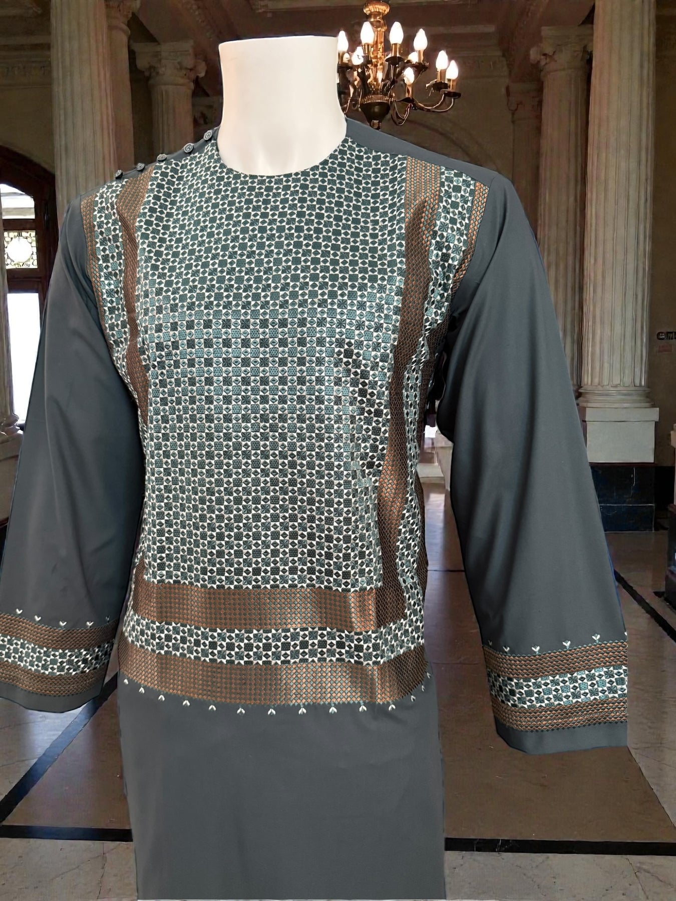 The parahan is enhanced with intricate machine khamakdozi patterns across the front panel and coordinated detailing on the sleeves, adding depth and texture to the overall look. The matching tunban completes the coordinated set, making it suitable for prayers, cultural gatherings, Ramadan, Eid, and formal occasions.