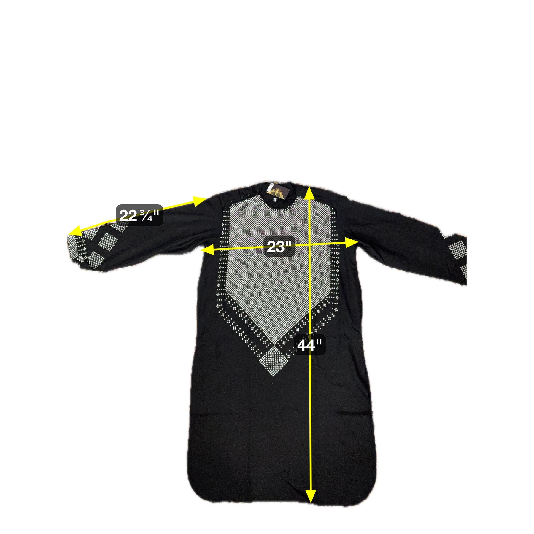 Chest Width: 23.0 in. Shoulder Width: 18.5 in. Body Length: 44.0 in. Sleeve Length: 22.75 in. Sleeve Opening Width: 7.0 in. Pants/tunban: 40.0 in.