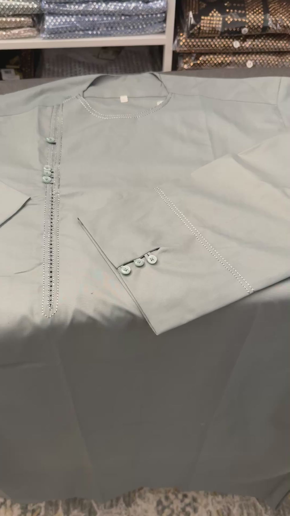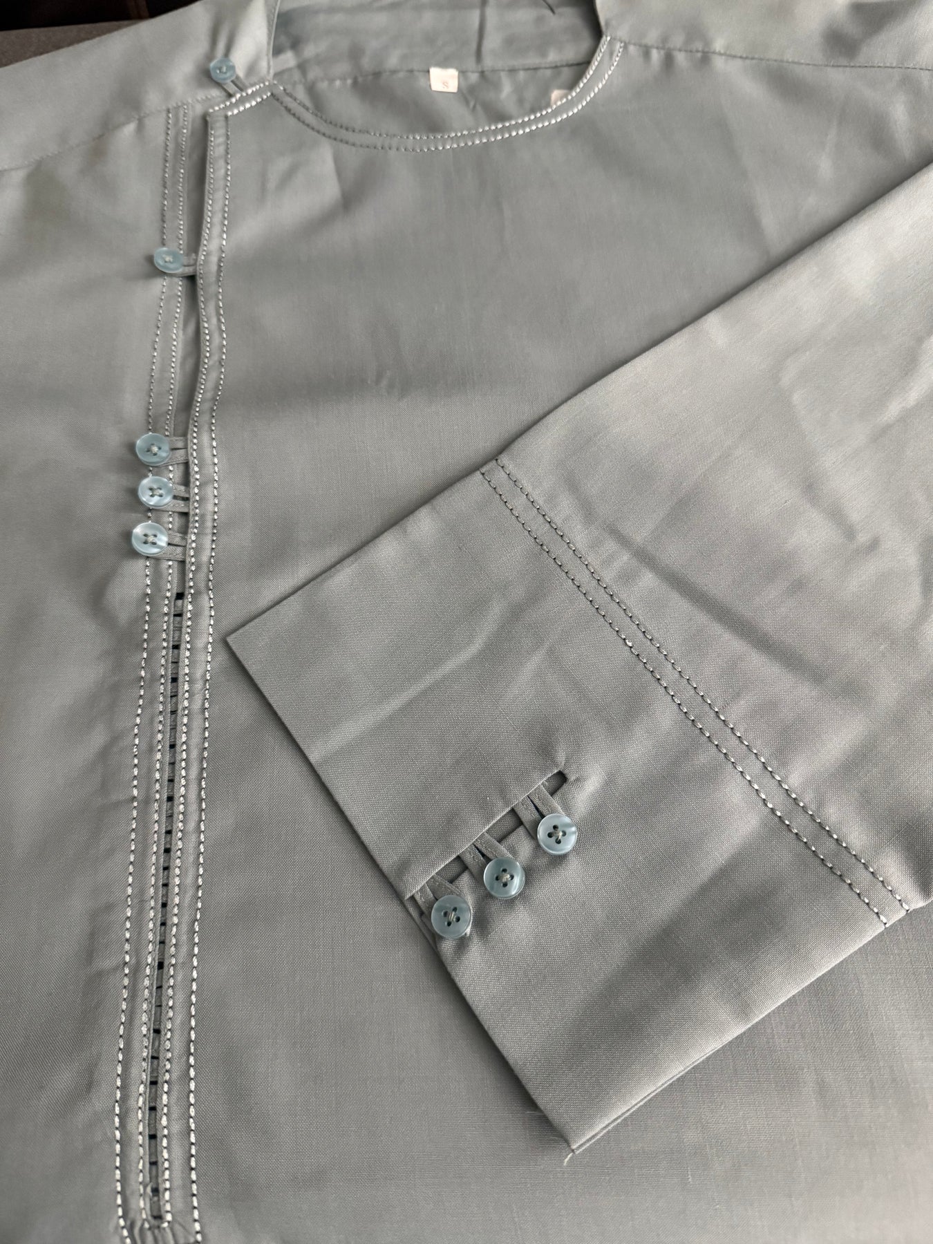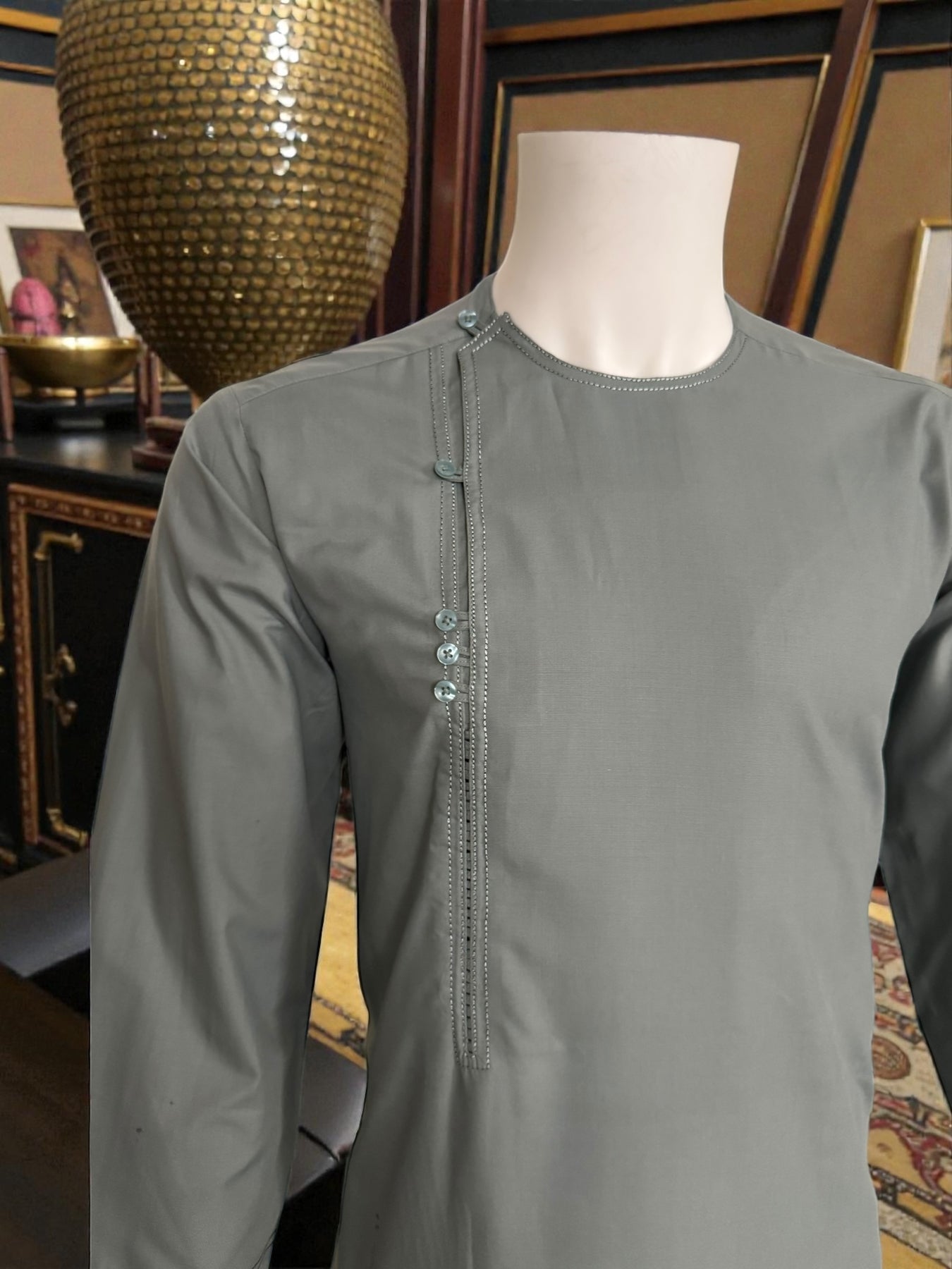 The parahan is detailed with subtle contrast stitching along the neckline, front panel, and sleeve cuffs, adding understated character to the design. The matching tunban completes the coordinated look, making this set suitable for cultural events, gatherings, prayers, and formal occasions.