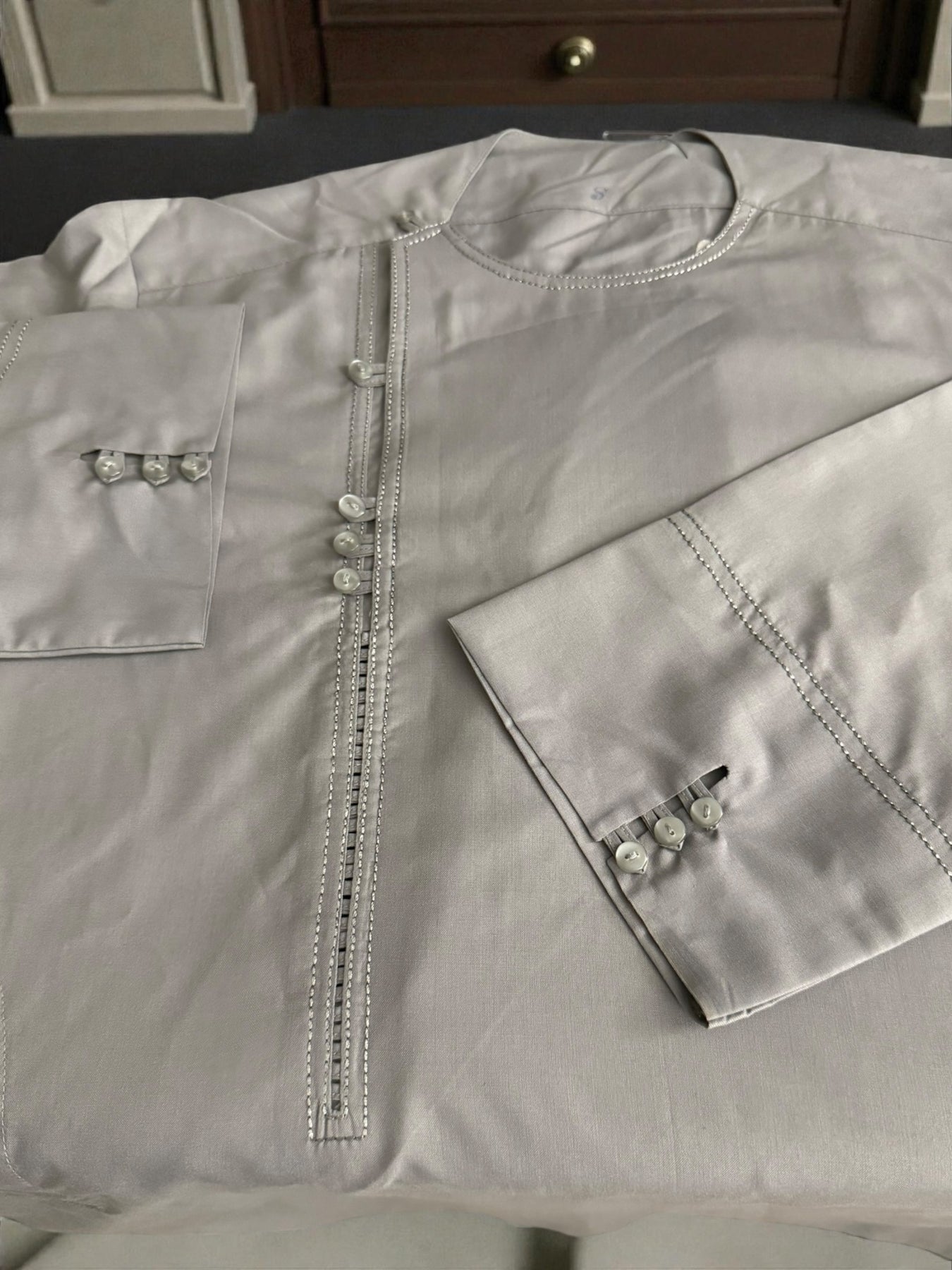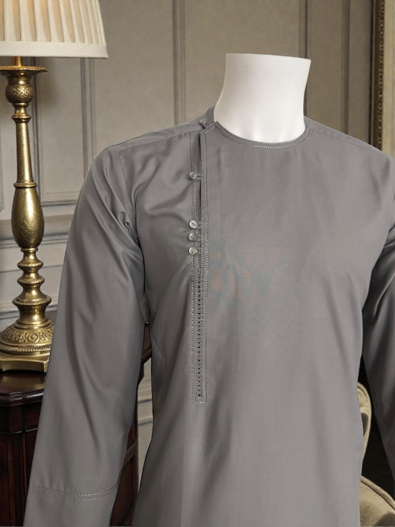 The parahan is detailed with subtle contrast stitching along the neckline, front panel, and sleeve cuffs, adding understated character to the design. The matching tunban completes the coordinated look, making this set suitable for cultural events, gatherings, prayers, and formal occasions.