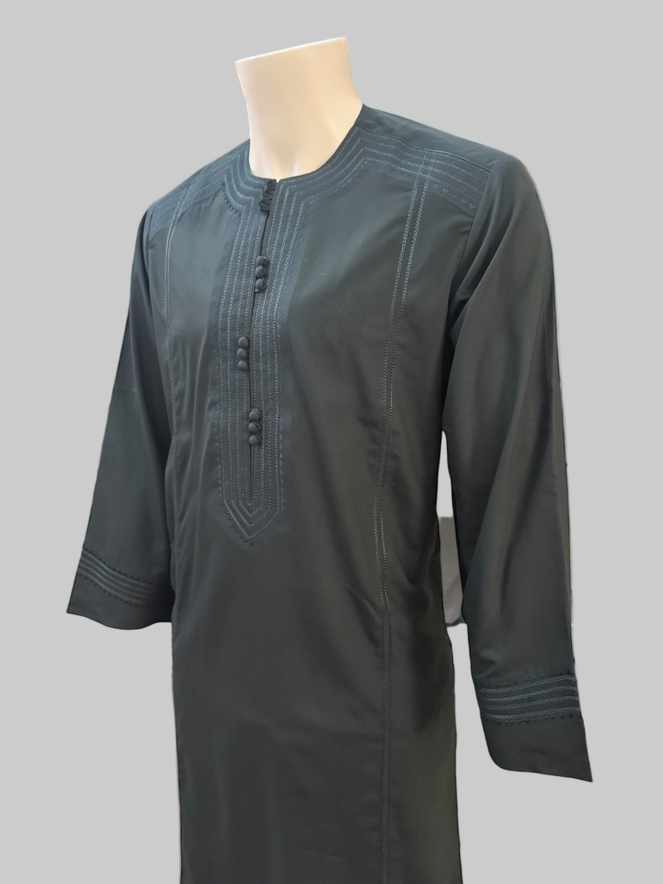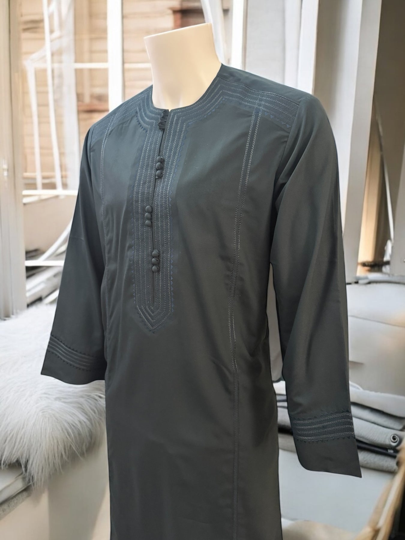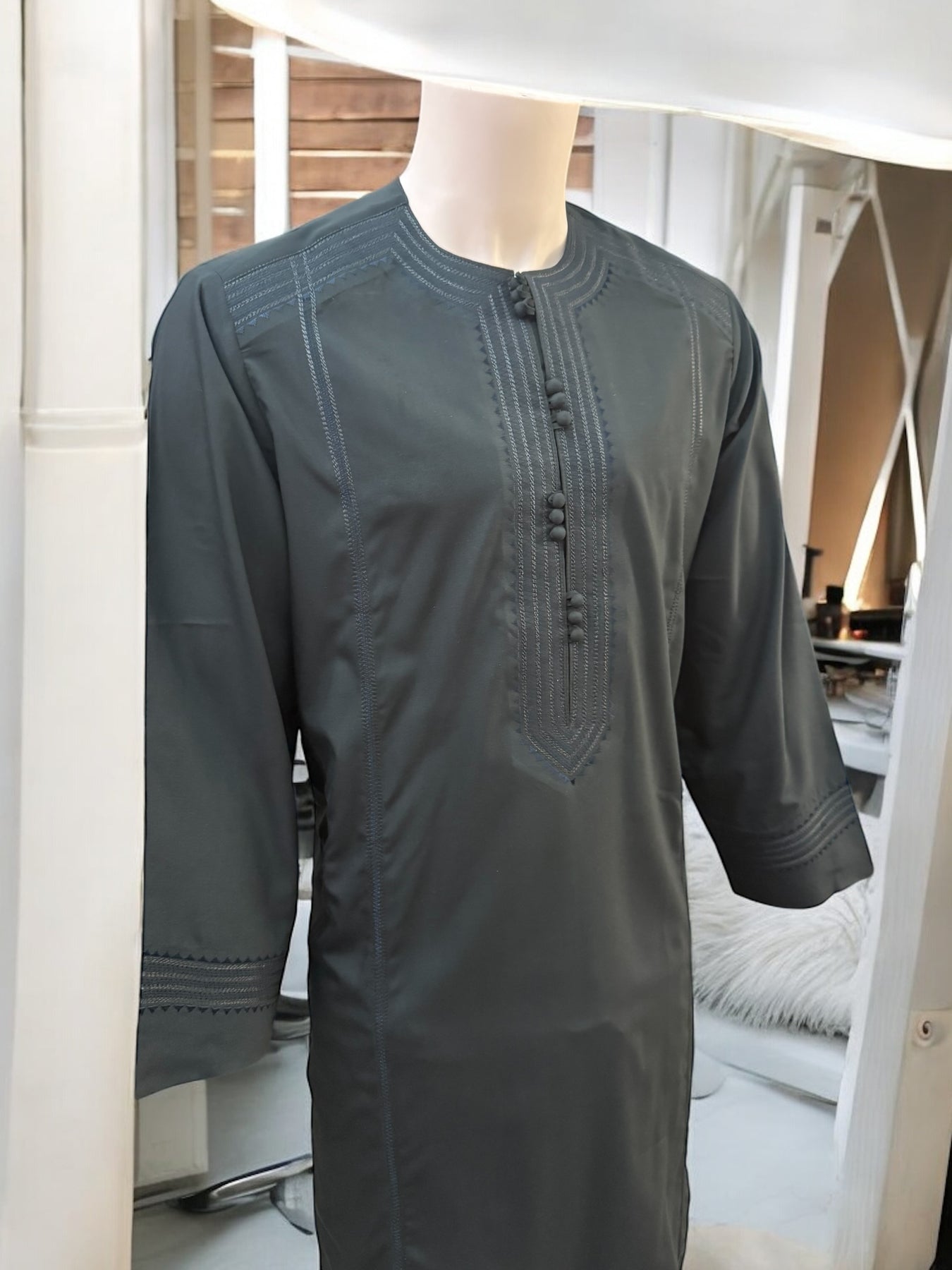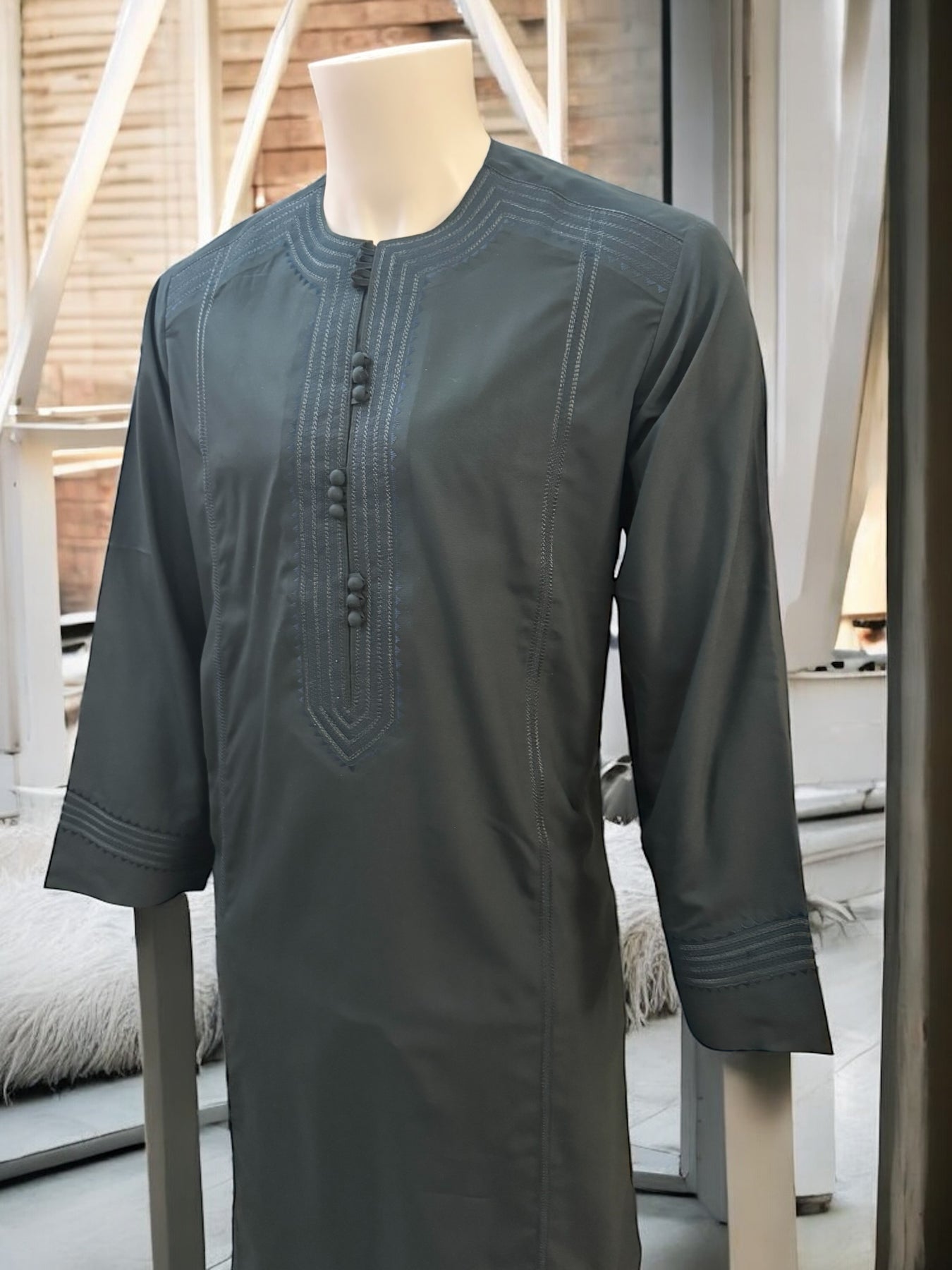 Elevate your wardrobe with this charcoal gray Parahan Tunban featuring beautifully crafted matching-thread machine embroidery. Designed with a classic buttoned neckline, this Afghan traditional outfit offers a clean, elegant, and timeless look. Made for comfort and everyday wear while still suitable for cultural events and special occasions. A refined and modern take on traditional Afghan clothing.