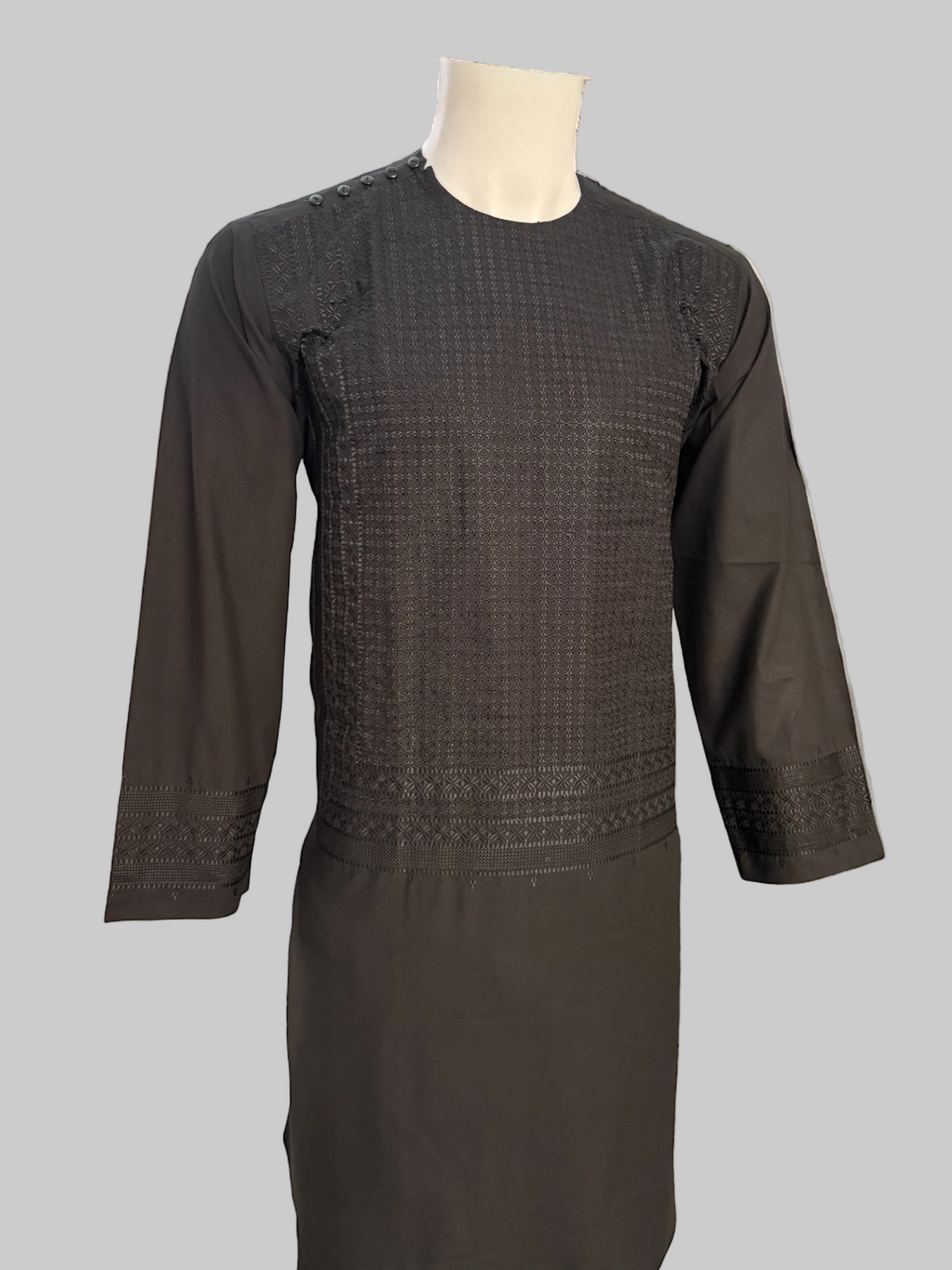This elegant black Afghan men’s kameez features high-quality geometric embroidery across the chest and sleeves, creating a clean and refined traditional look. Made from smooth premium fabric, it offers comfort, durability, and timeless style suitable for cultural events, gatherings, and everyday wear.
