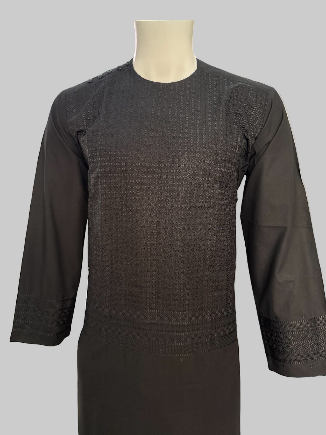 Medium Black Afghan Men’s Kameez – Premium Black Fabric with Intricate Black Embroidery