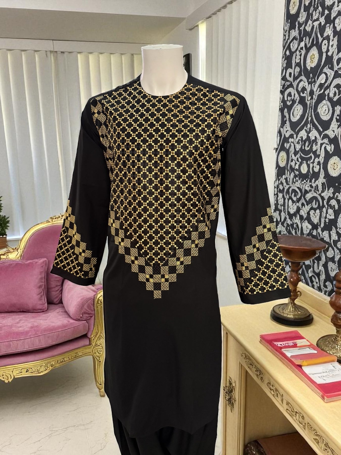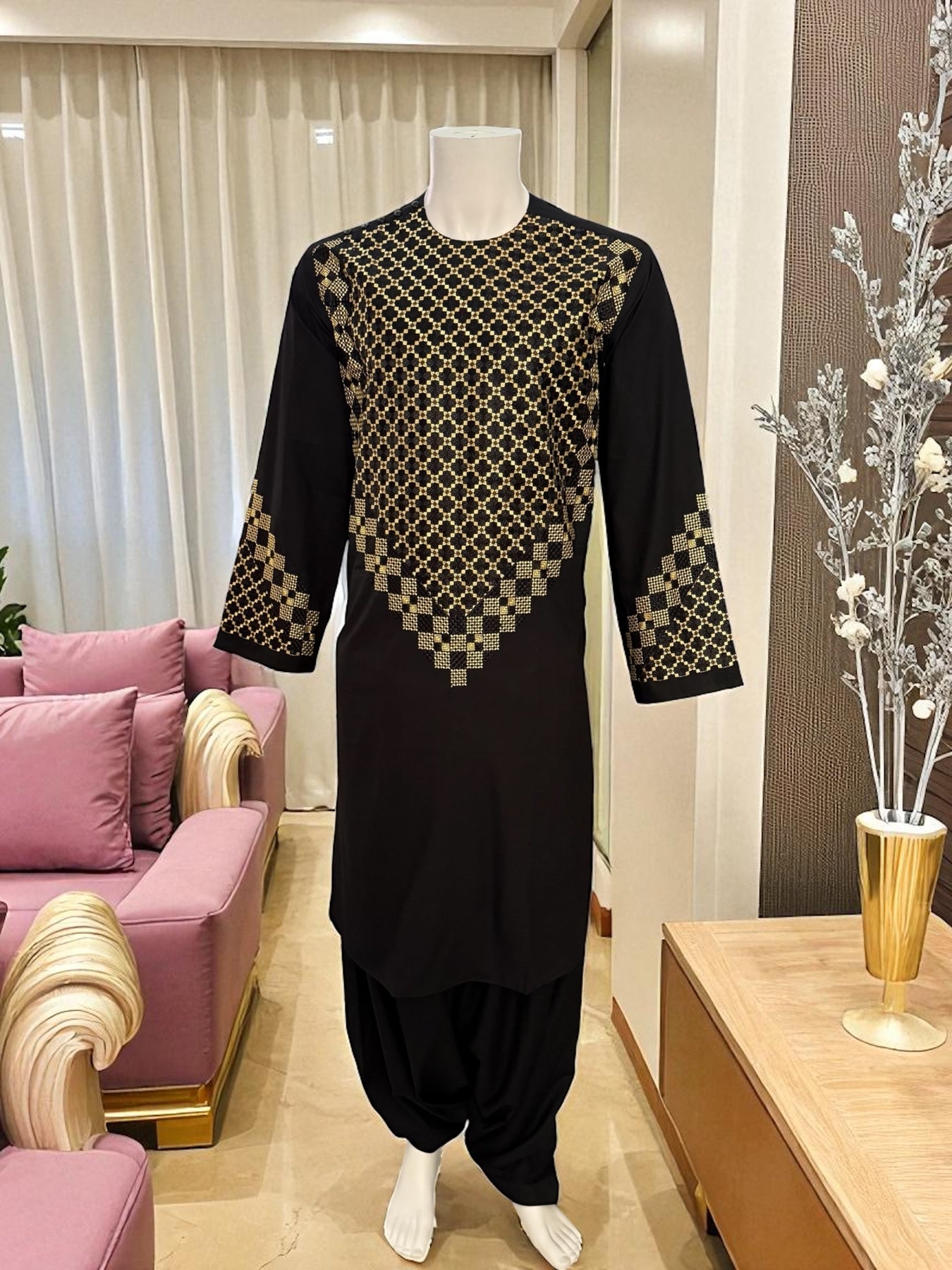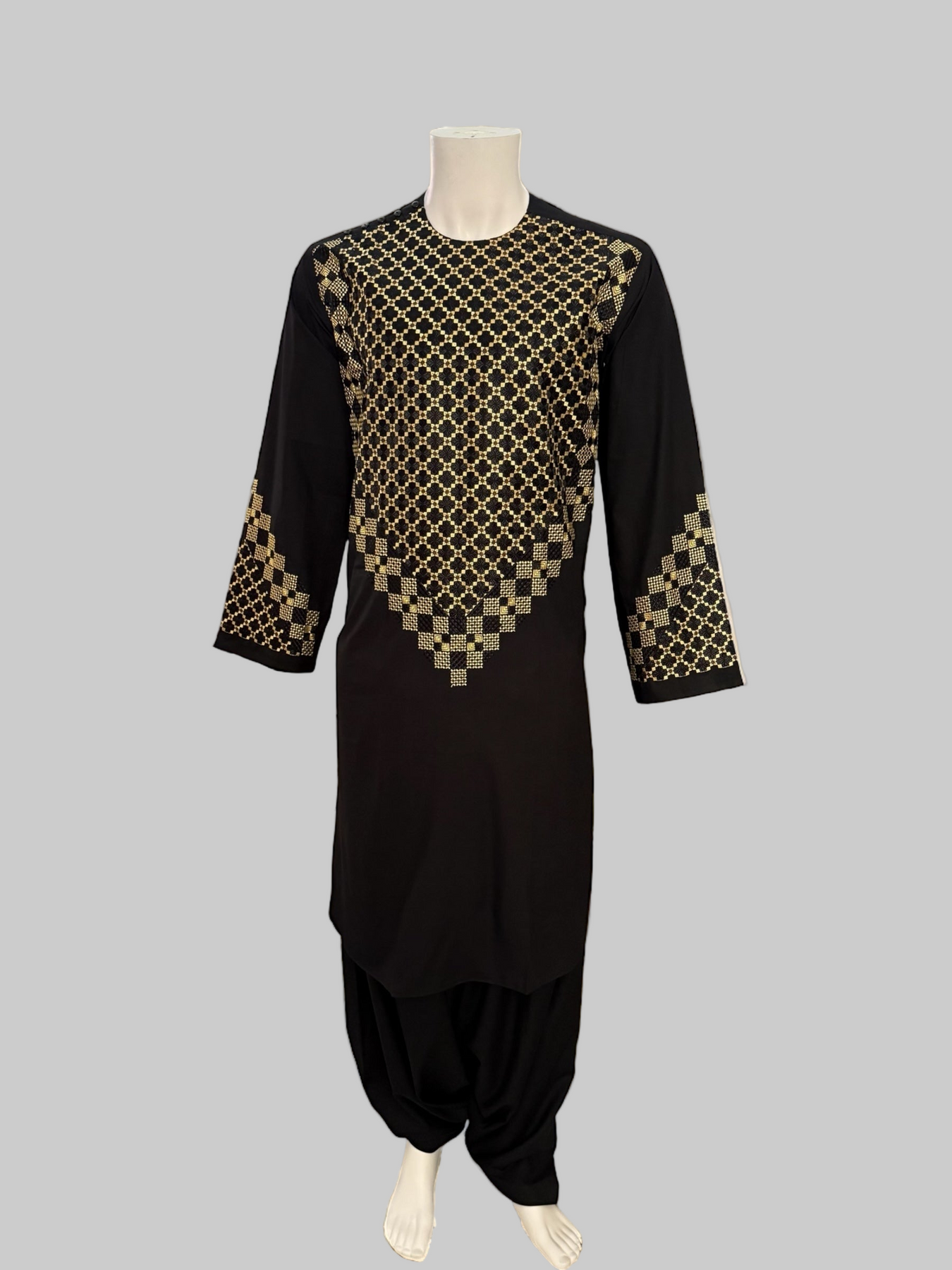 This elegant black Afghan men’s kameez features high-quality gold and black geometric embroidery across the chest, sleeves, and borders. Crafted from smooth premium fabric, it provides a comfortable and refined traditional look suitable for cultural events, celebrations, and everyday wear.