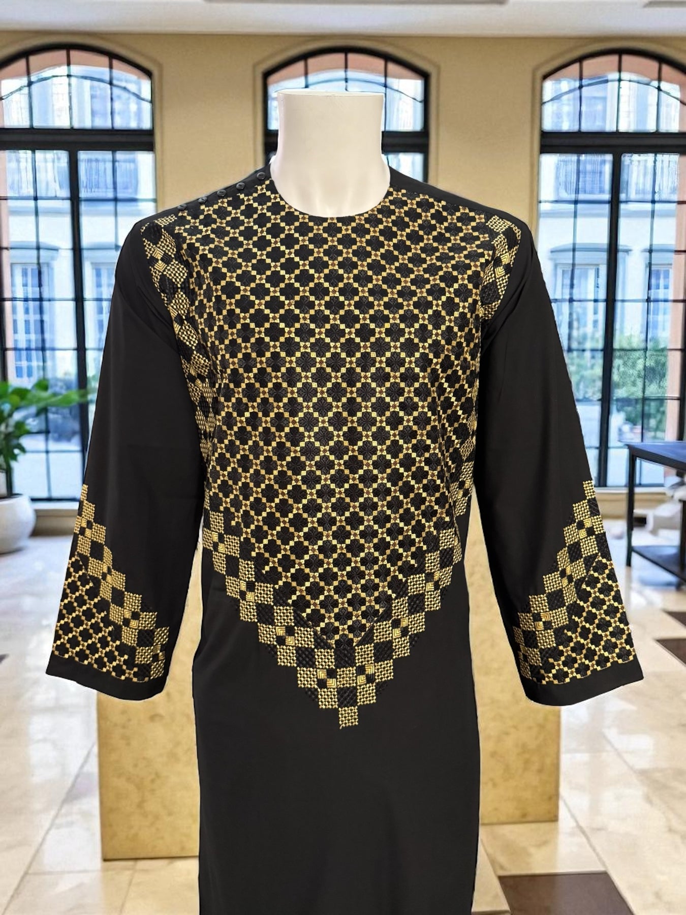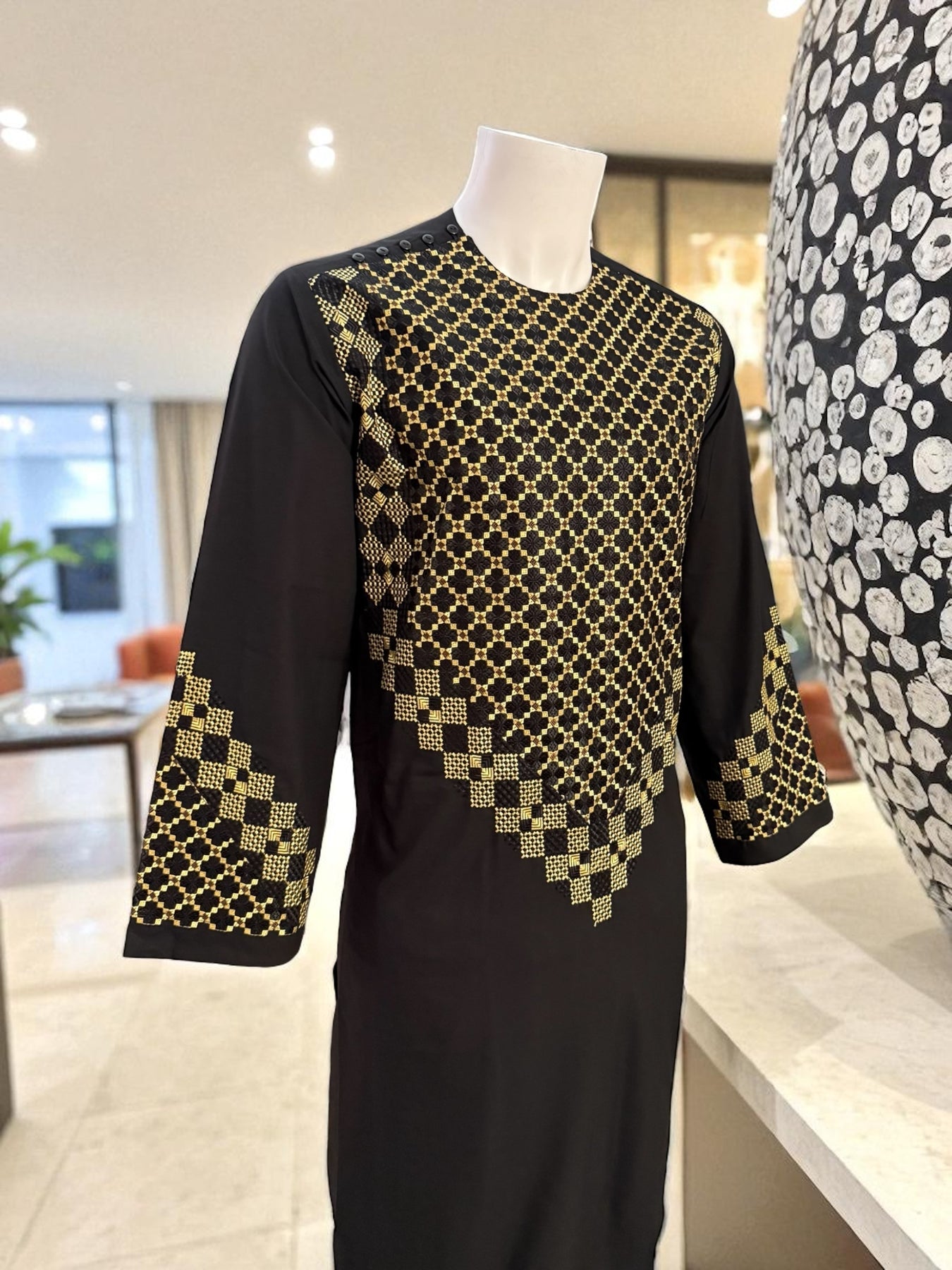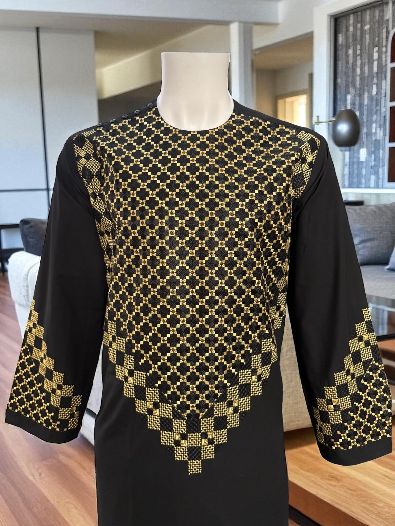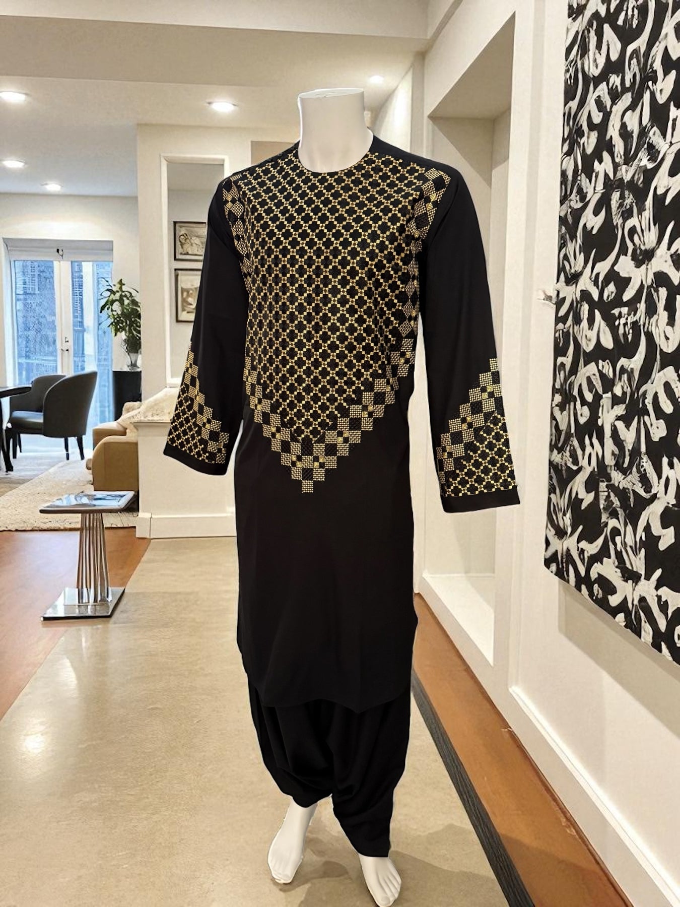 This elegant black Afghan men’s kameez features high-quality gold and black geometric embroidery across the chest, sleeves, and borders. Crafted from smooth premium fabric, it provides a comfortable and refined traditional look suitable for cultural events, celebrations, and everyday wear.