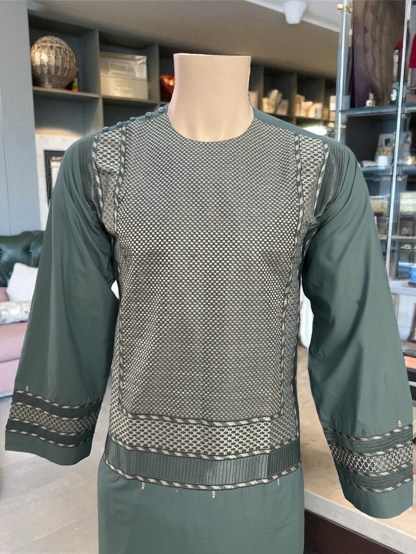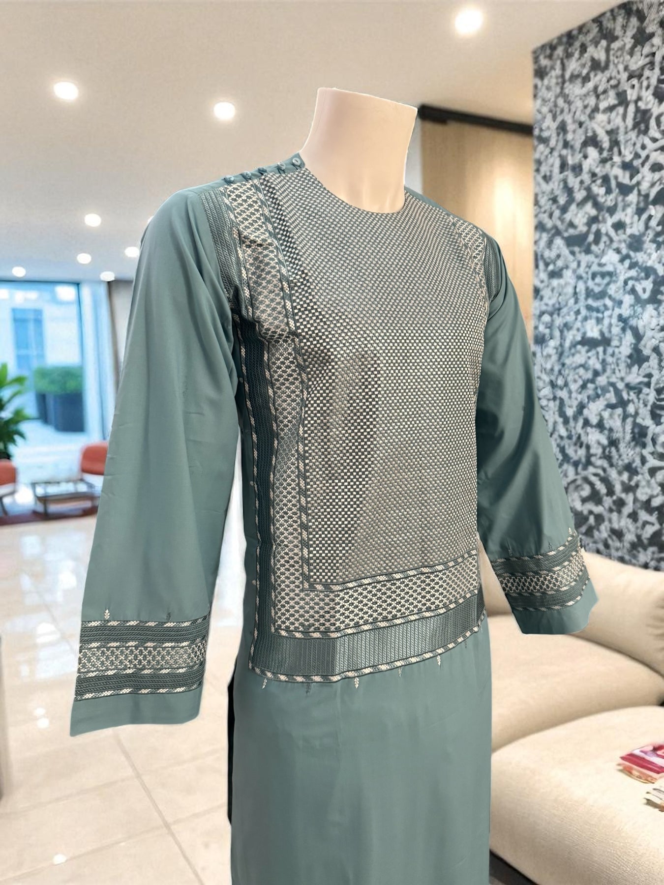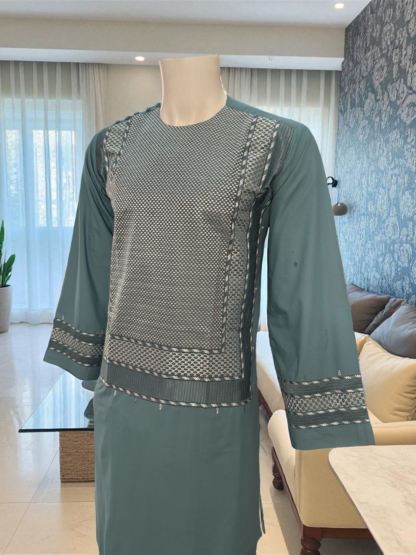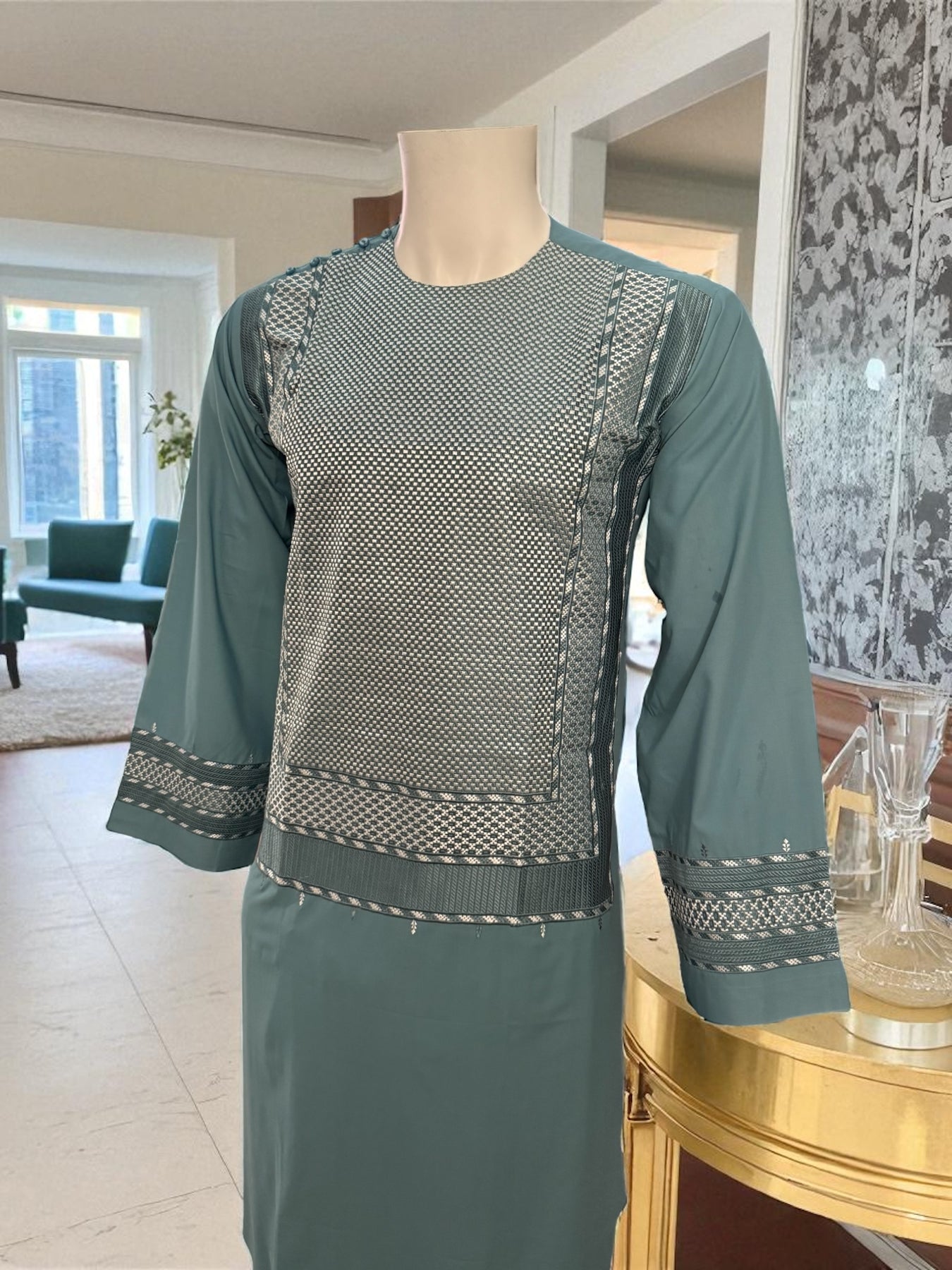Men’s Teal Kameez with White and Teal Machine Embroidery – Medium Size | Premium Afghan Traditional Wear
