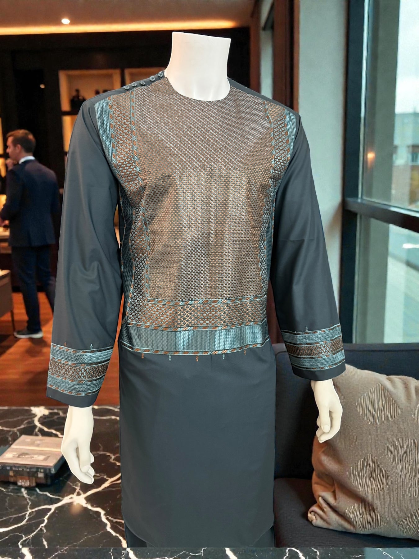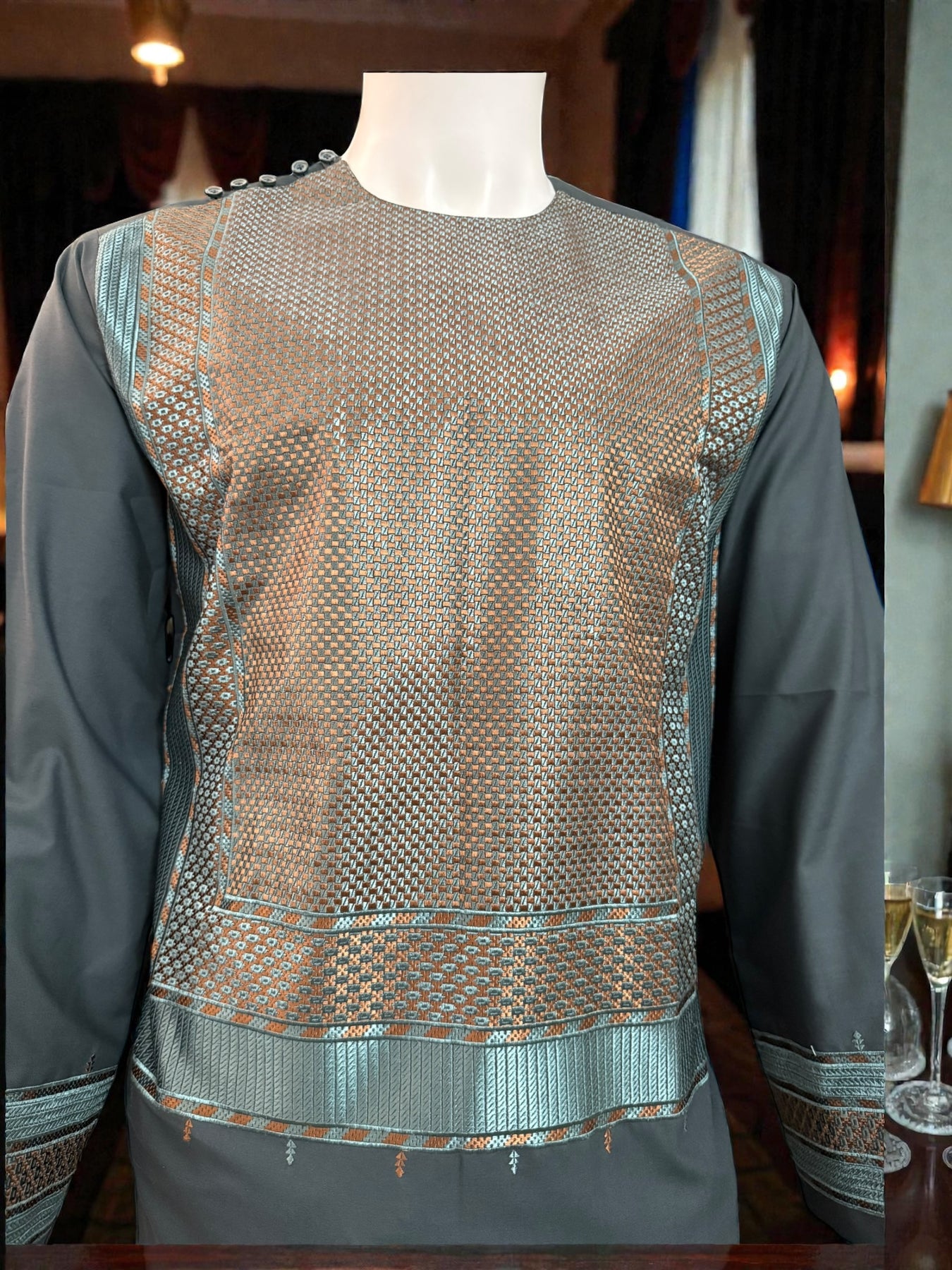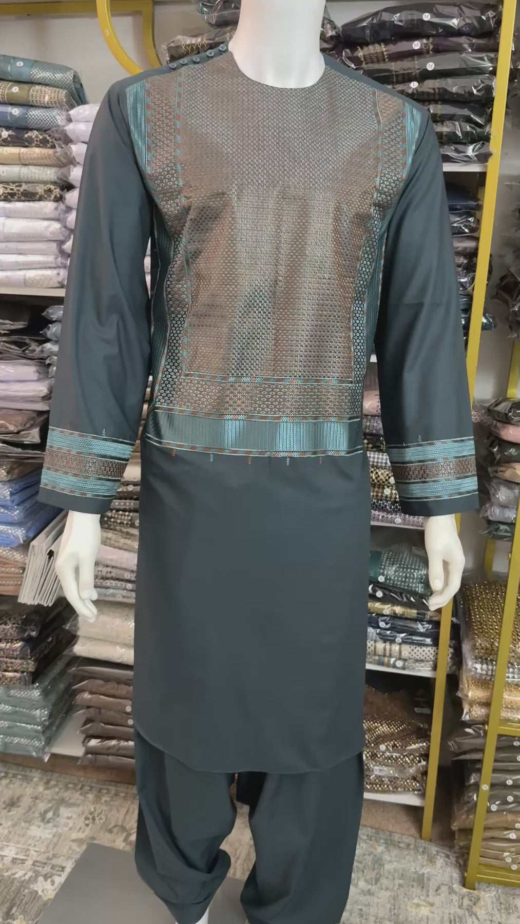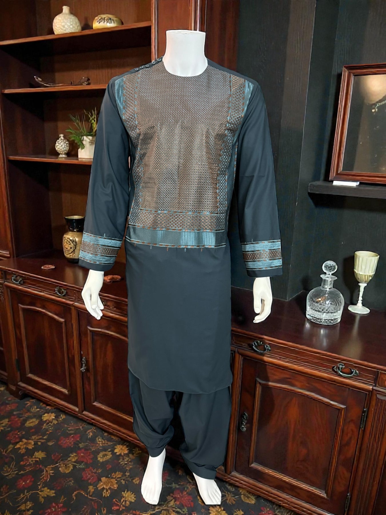 Large Parahan Tunban set featuring premium machine khamakdozi embroidery with a refined traditional design and elegant detailing. Made from smooth, breathable fabric, this set offers comfort while maintaining a polished and structured appearance.