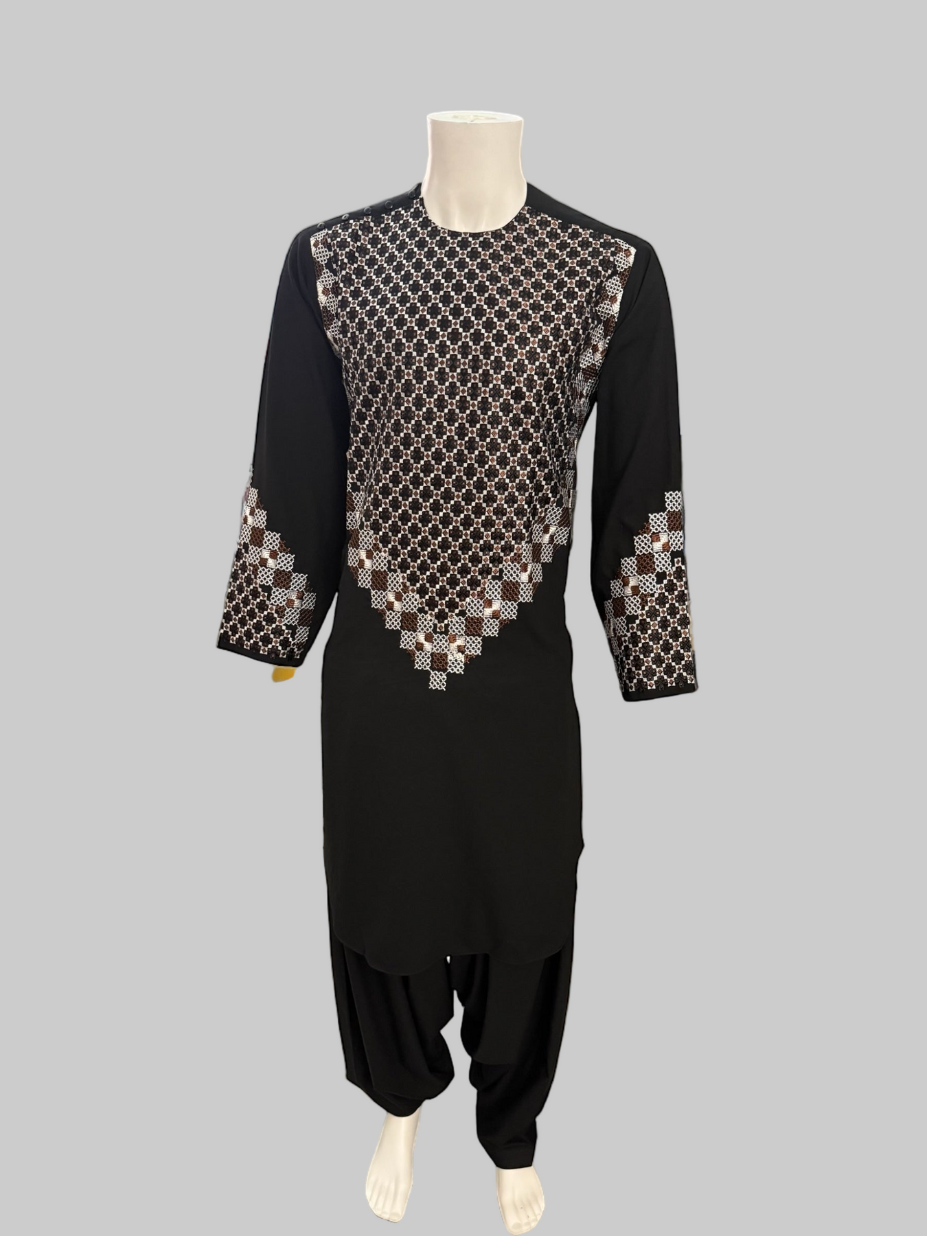 Men’s Black Kameez with Brown & White Machine Embroidery – Small Size | Afghan Traditional Wear