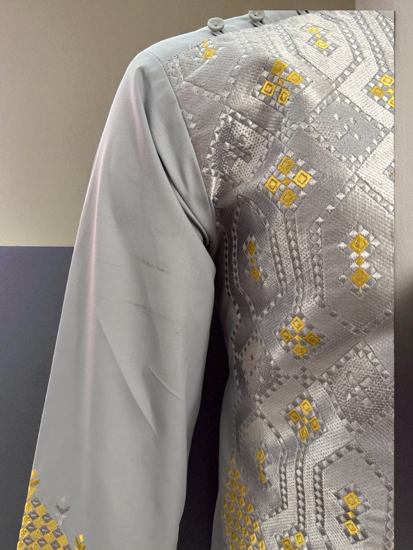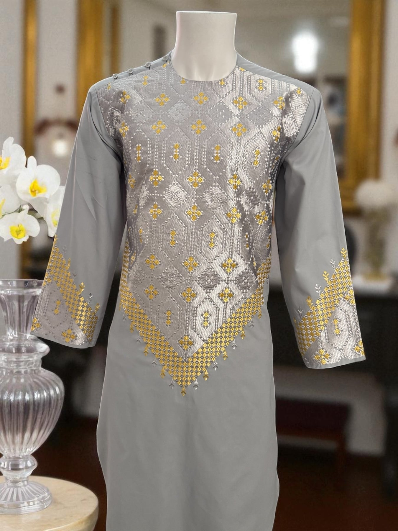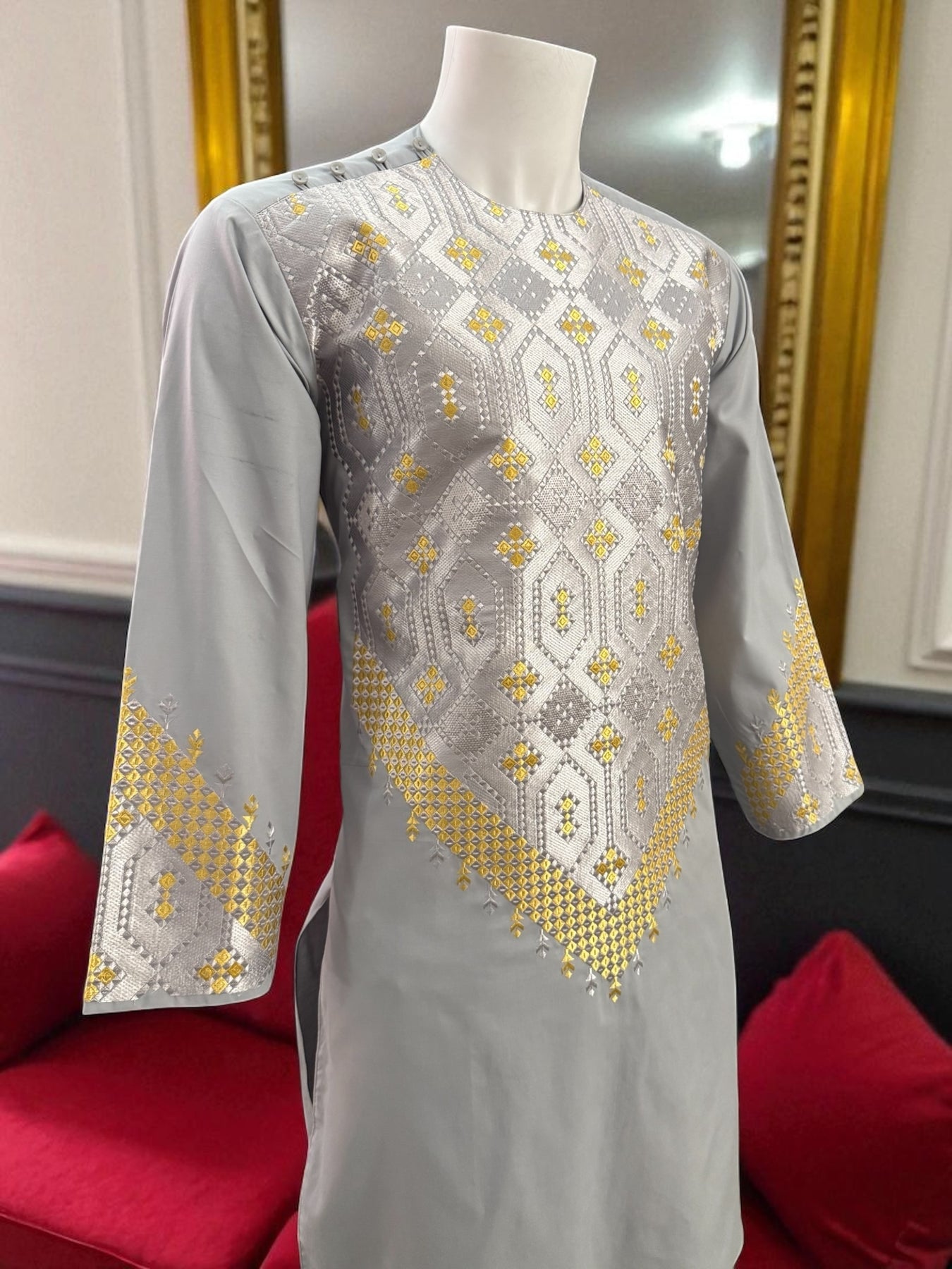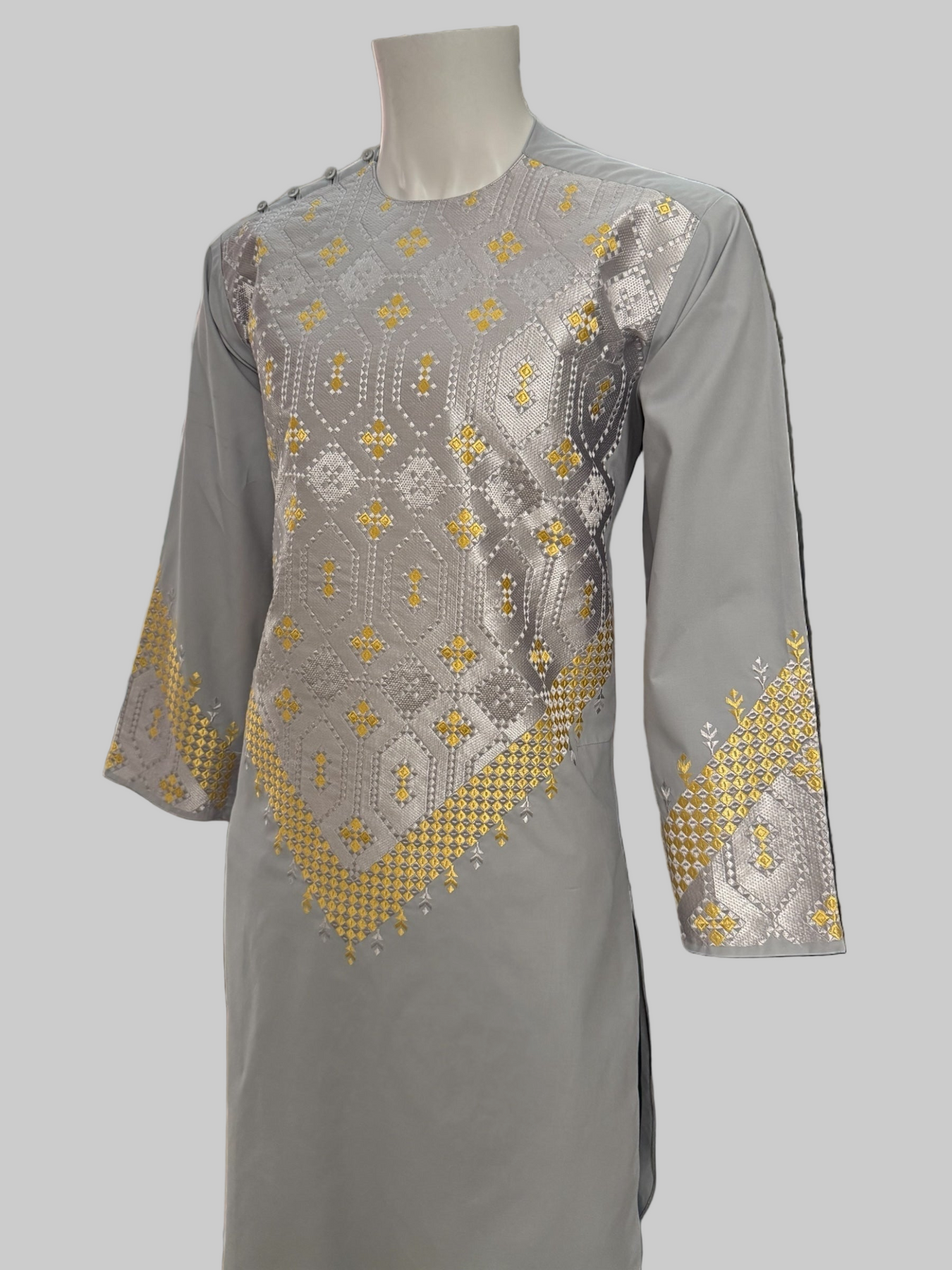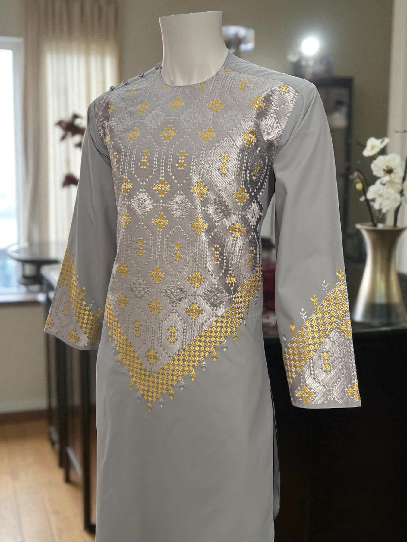 This Men’s Gray Kameez features detailed gold machine embroidery across the front and sleeves, inspired by traditional Afghan patterns. The soft fabric and clean stitching make it comfortable for cultural events, gatherings, or everyday traditional wear.