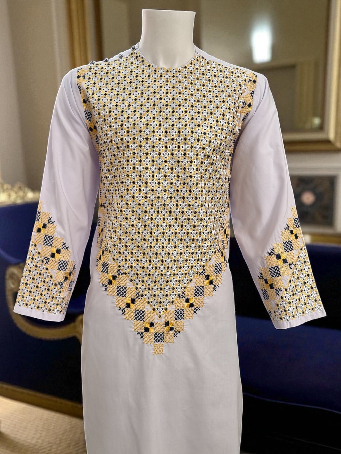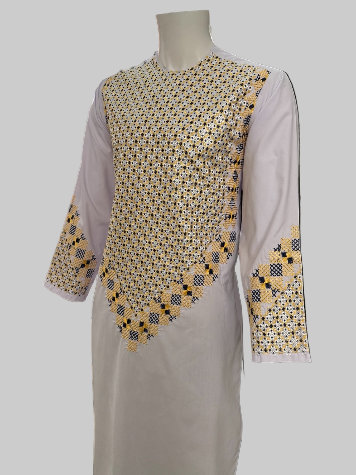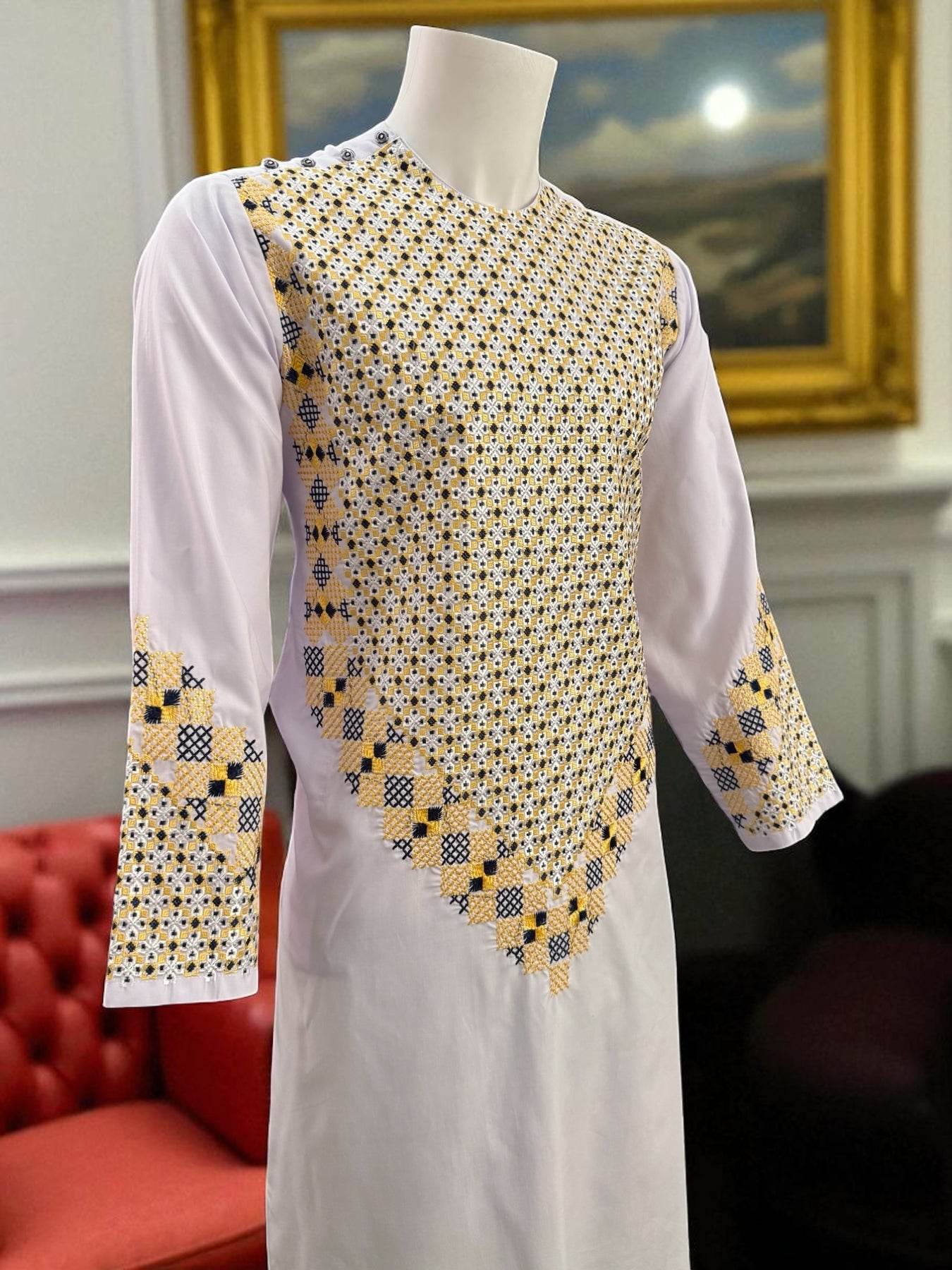 This men’s white kameez features gold and navy machine embroidery across the front and sleeves, creating a classic and coordinated traditional look. The design highlights geometric embroidered patterns that add structure and detail without being heavy or bulky.