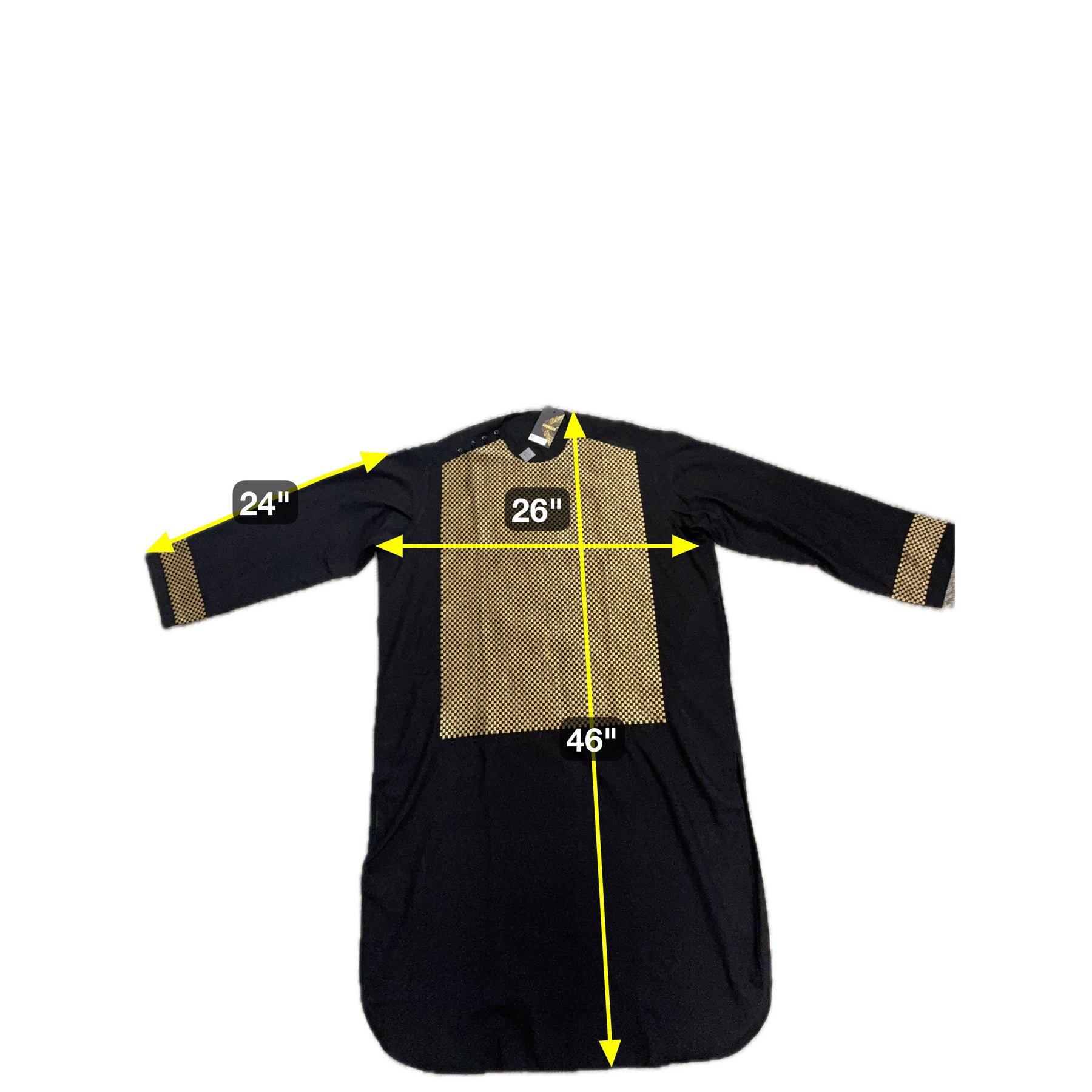 Add an elegant traditional touch to your wardrobe with this Men’s XL White Kameez featuring gold, navy, and white machine embroidery. The clean white fabric is highlighted by intricate geometric embroidery across the chest and sleeves, creating a refined Afghan-inspired look that is both modern and timeless.