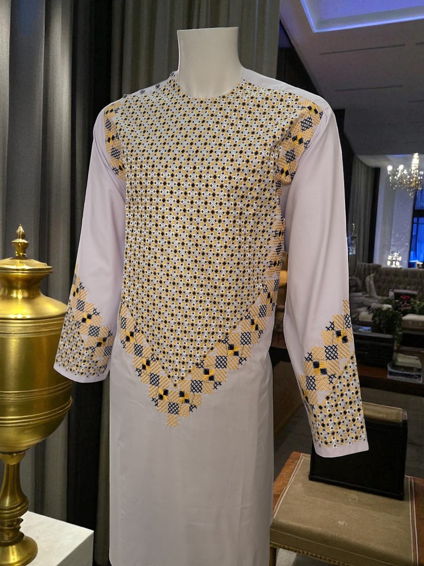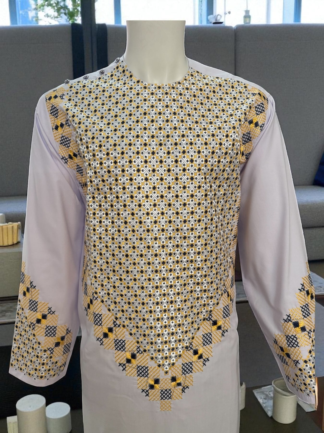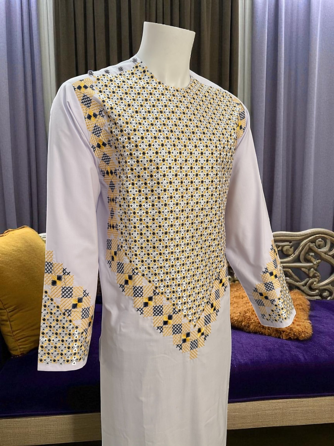 Elevate your wardrobe with this Men’s XL White Kameez featuring beautifully detailed gold, navy, and white machine embroidery. The clean white fabric is paired with an intricate geometric embroidered design across the chest and sleeves, creating an elegant and eye-catching Afghan traditional look.