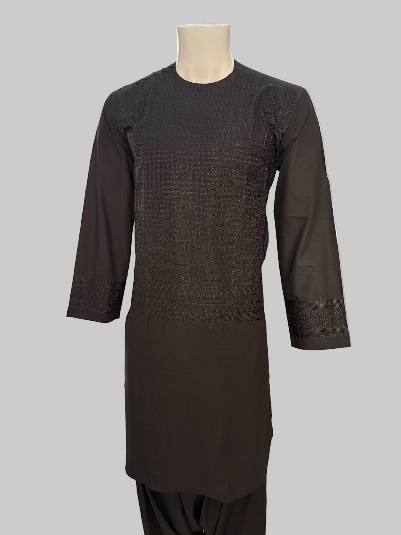 Small Black Afghan Men’s Kameez – Premium Black Fabric with Intricate Black Embroidery