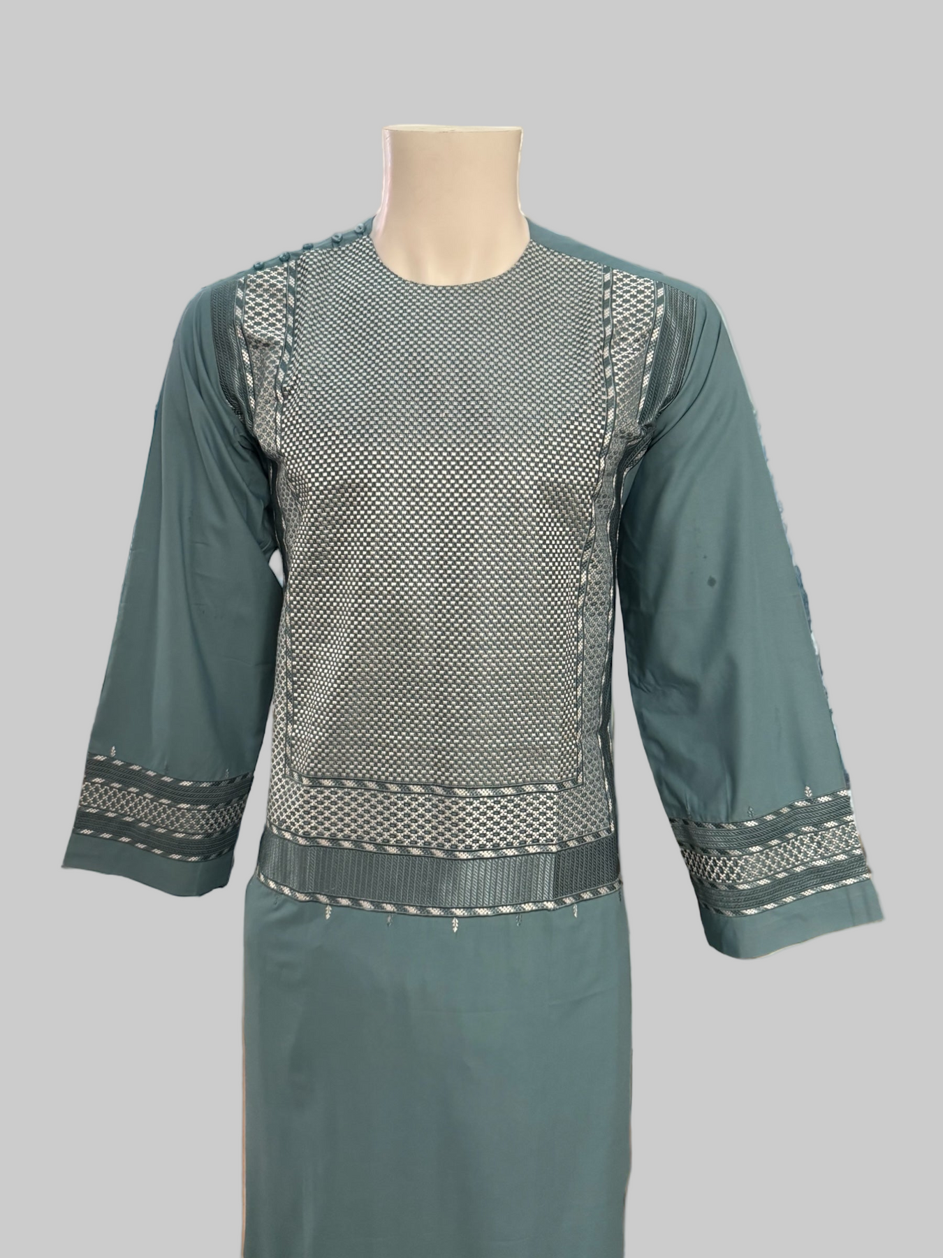 This beautifully crafted teal Afghan kameez features detailed white and teal embroidery across the chest and sleeves, giving it a clean and traditional look. Made from premium-quality fabric, it feels comfortable, smooth, and perfect for cultural events, celebrations, and everyday traditional wear.