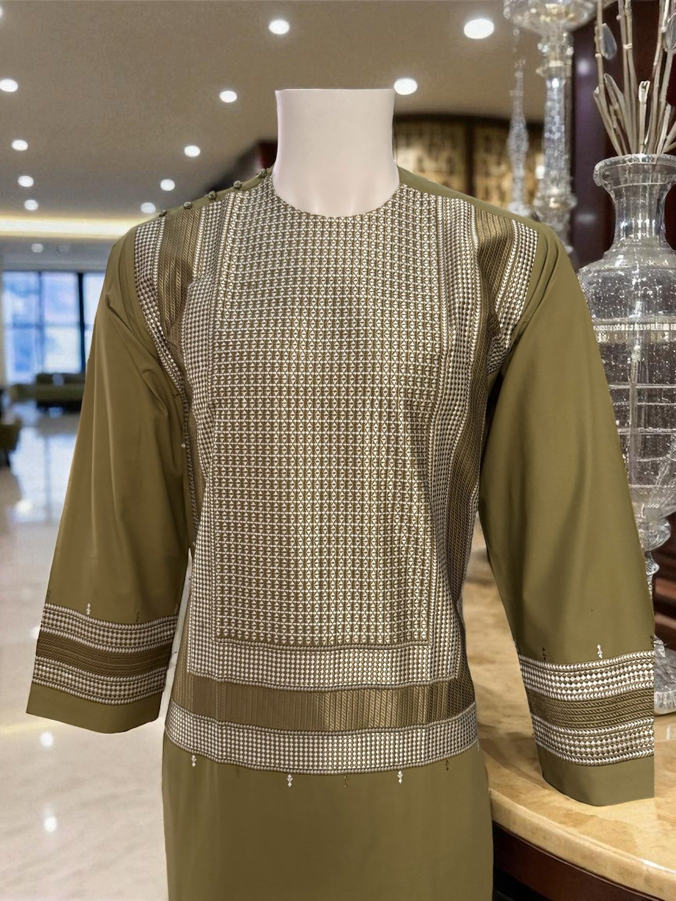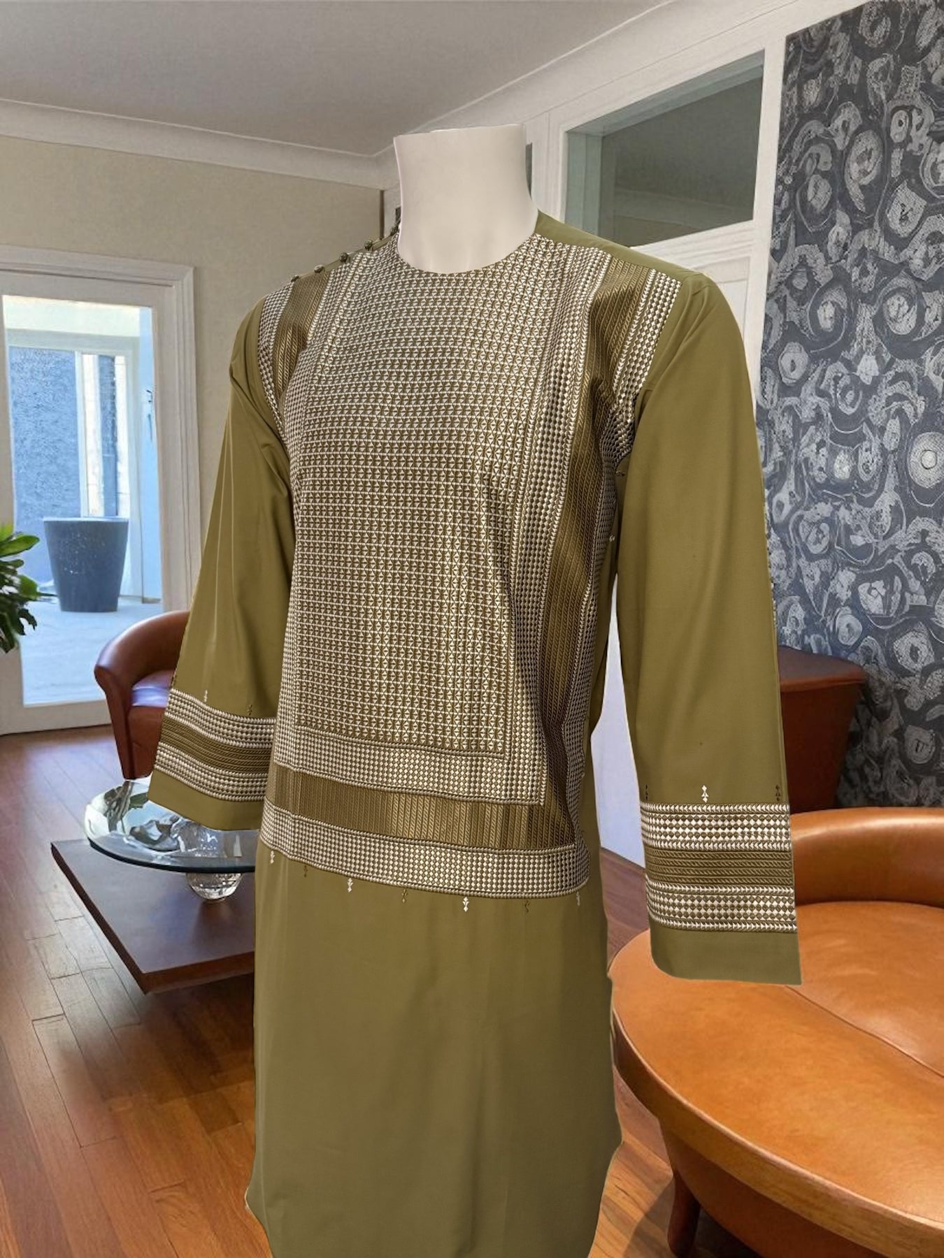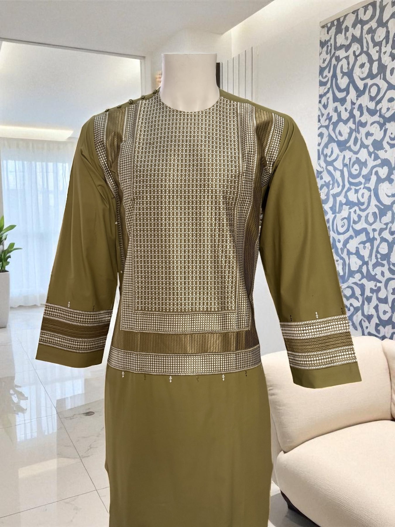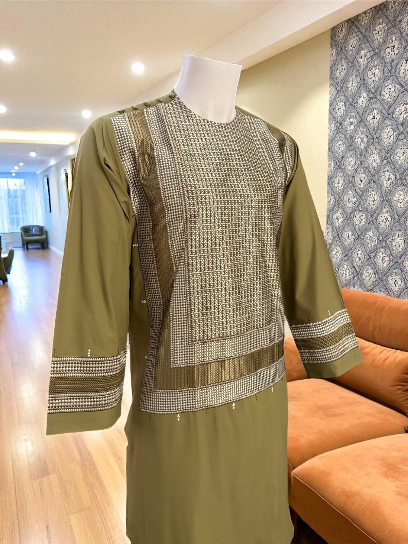 Elevate your traditional style with this Small-size olive green Afghan Kameez, crafted from high-quality fabric and finished with detailed white and matching color machine embroidery. The design features elegant geometric patterns across the chest, sleeves, and borders, giving the outfit a refined and cultural look.