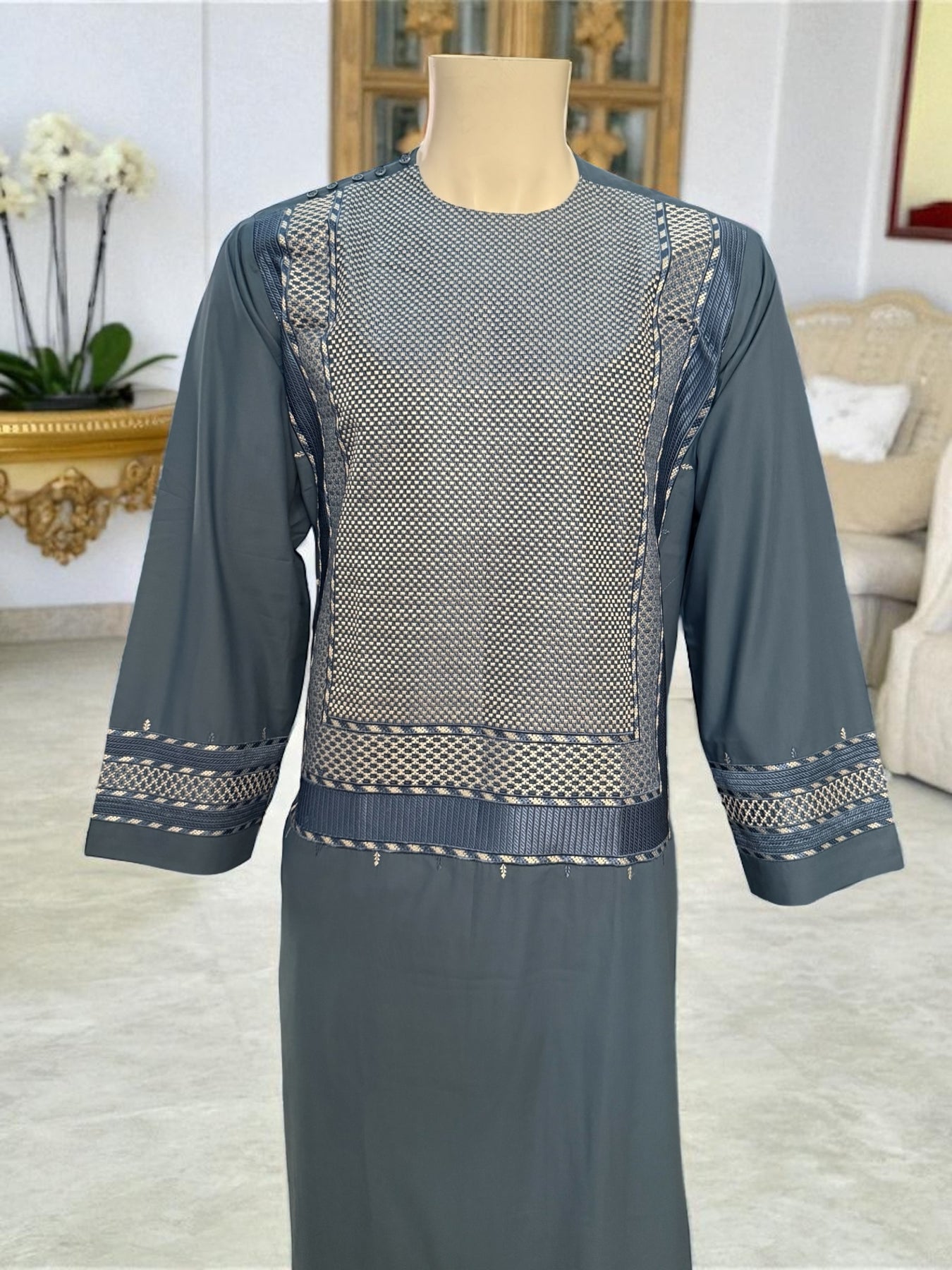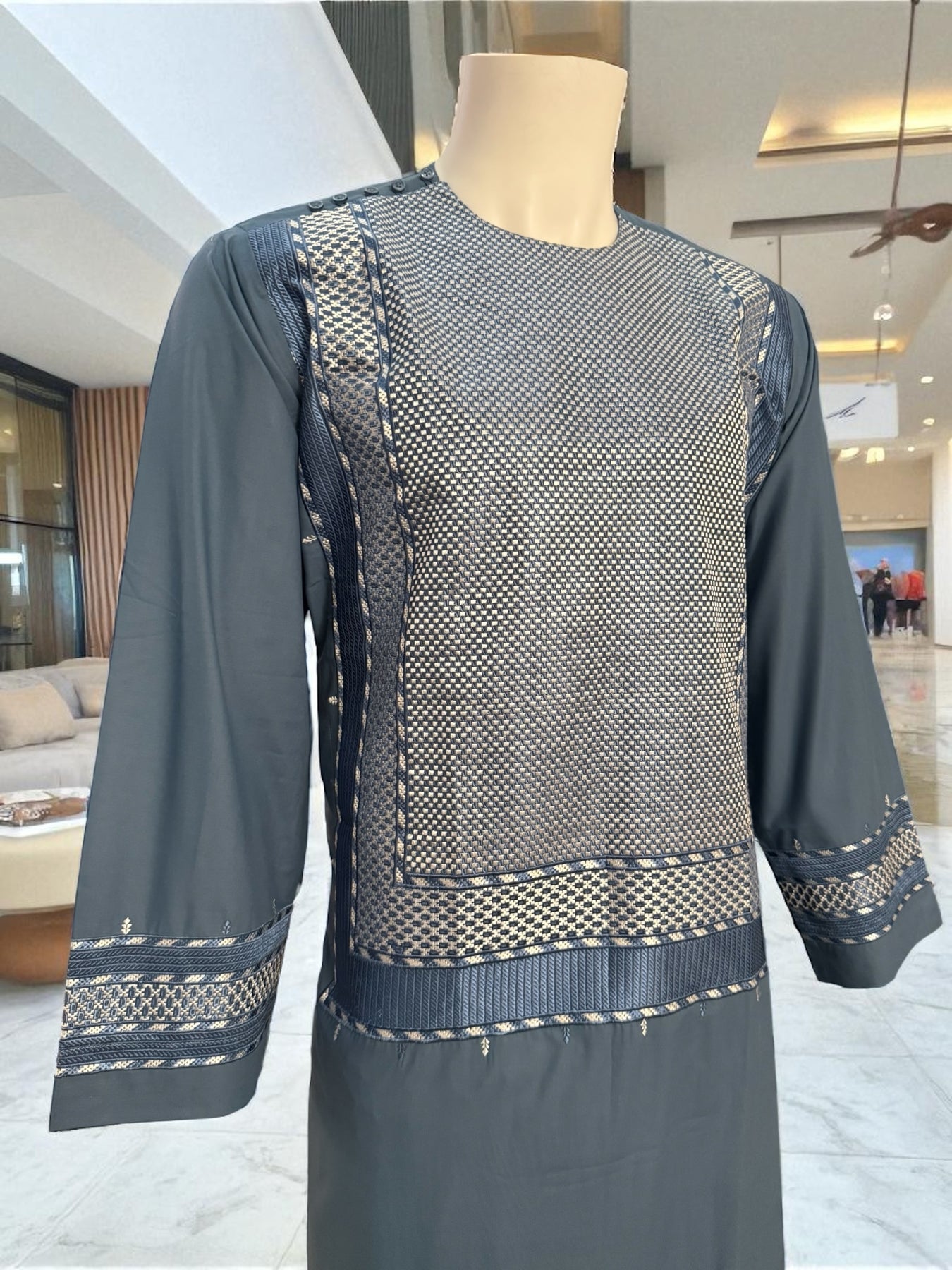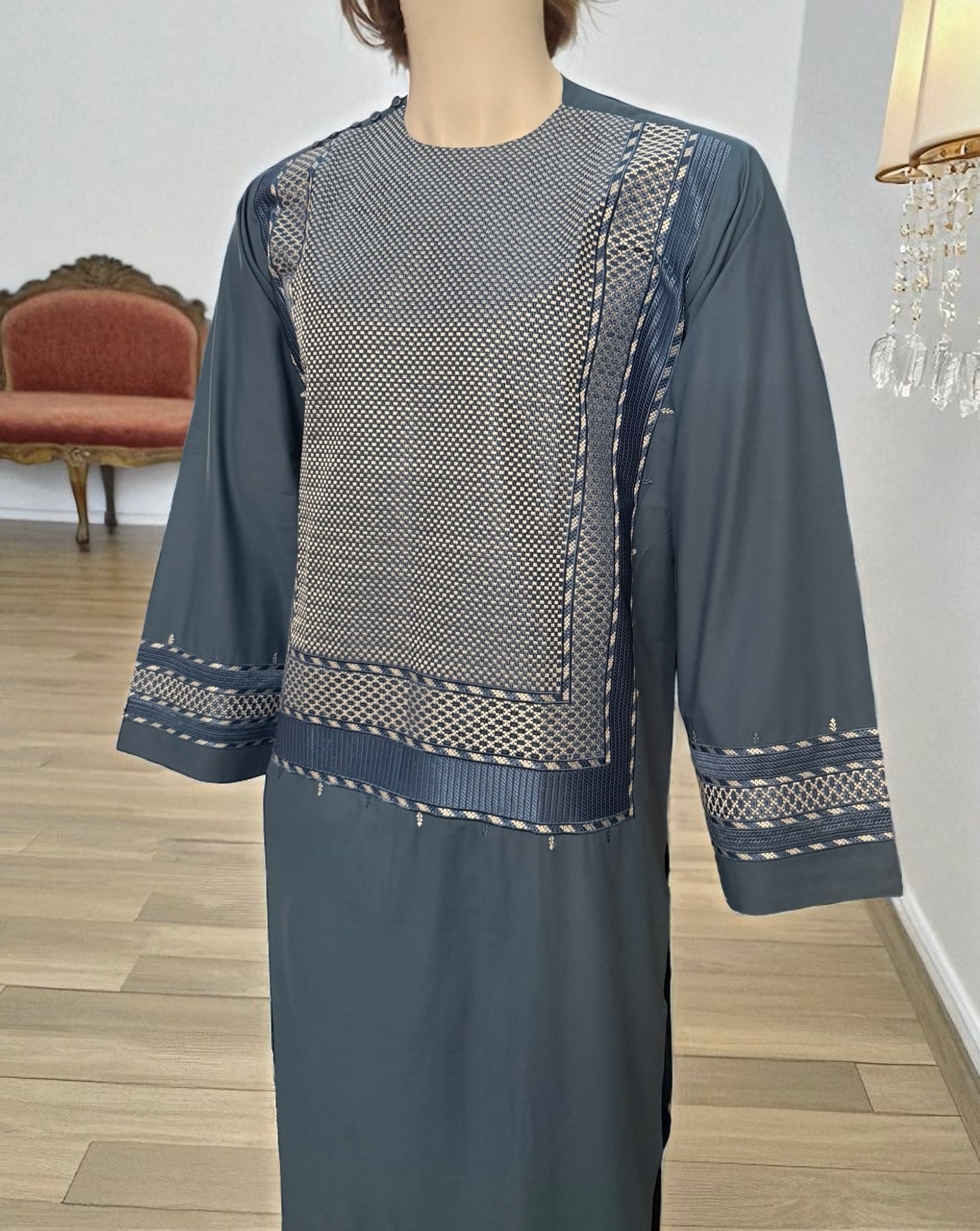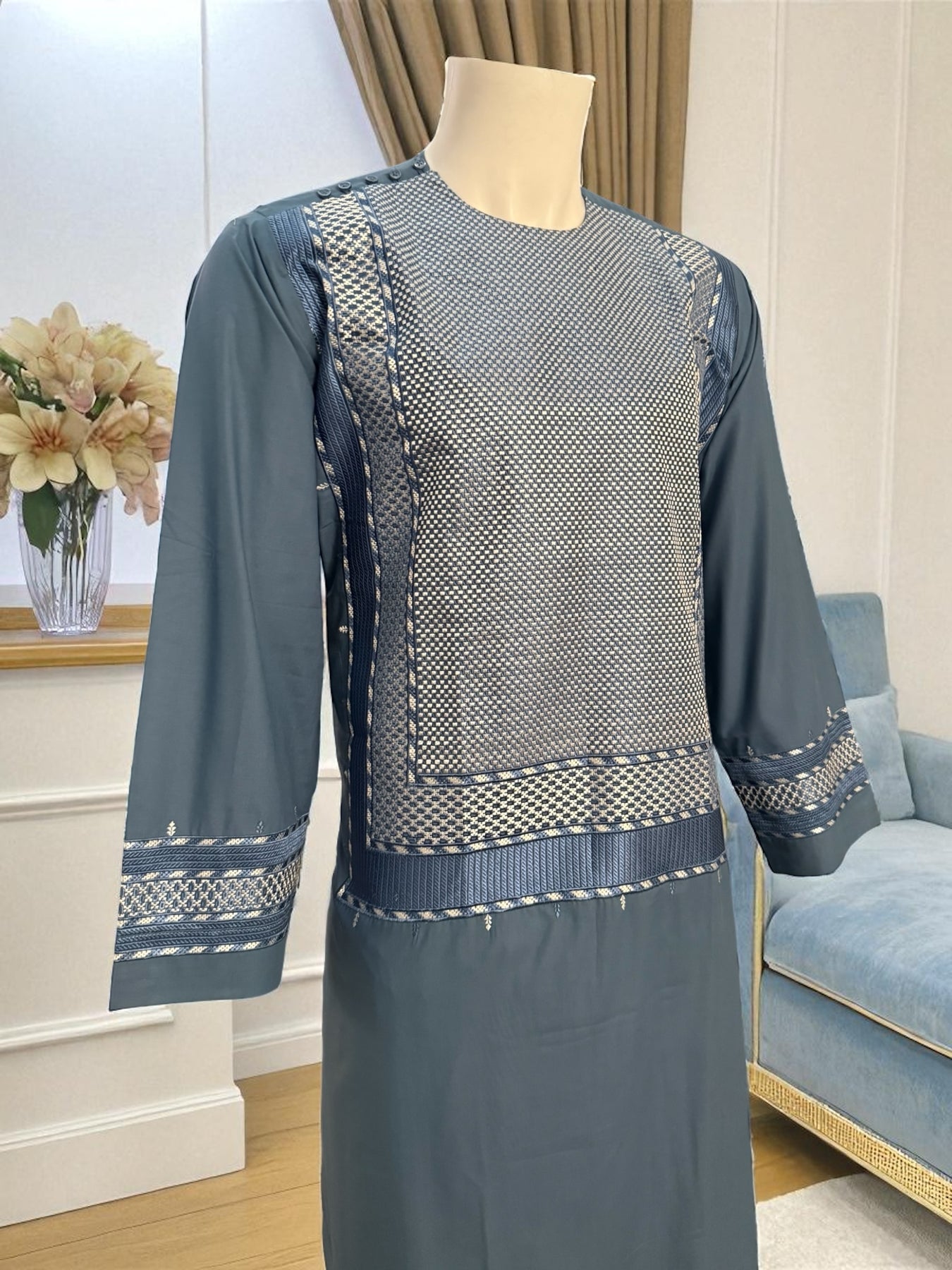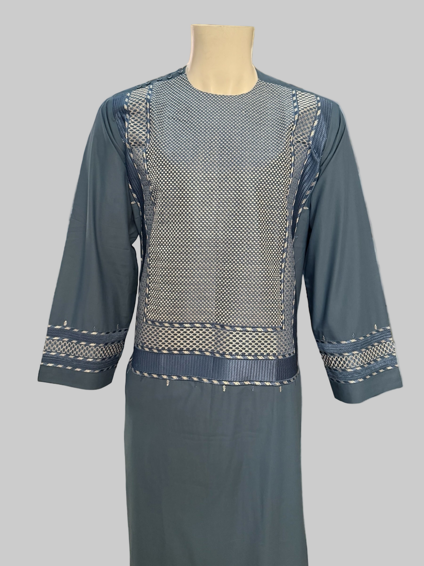 Small Turquoise Afghan Men’s Kameez with White & Gray Embroidery | Premium Traditional Outfit