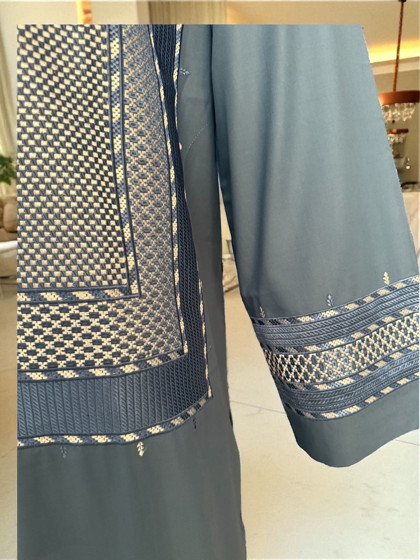 This beautiful turquoise Afghan kameez features detailed white and gray embroidery across the chest, sleeves, and hem, creating a clean and traditional look. Made from premium-quality fabric, it offers a soft, comfortable feel suitable for daily wear, cultural events, celebrations, and special occasions.