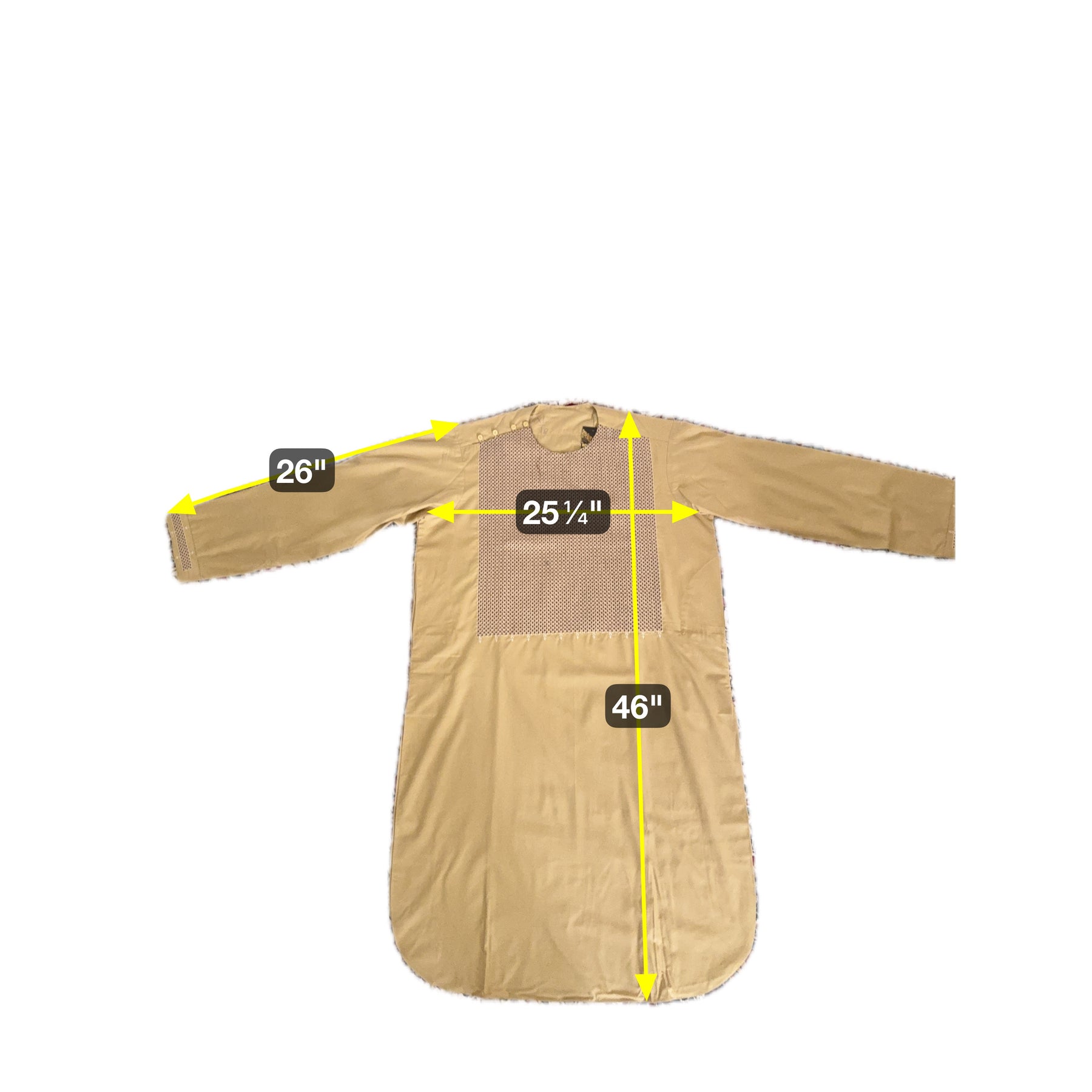 Chest Width: 25.25 in.Shoulder Width: 19.5 in.Body Length: 46.0 in.Sleeve Length: 26.0 in.Bottom Hem Width: 0.0 in.Sleeve Opening Width: 6.5 in.Pants/tumban. 39: 39.0 in.