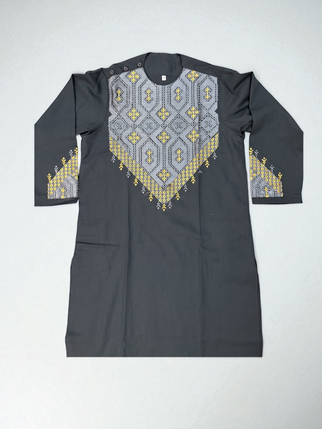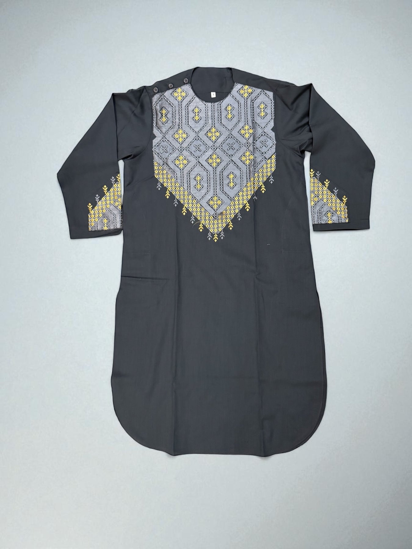 The dark gray tone offers a timeless, versatile appeal, perfectly contrasted by the gold embroidery that adds a touch of royal sophistication. With fine stitching, comfortable structure, and button detailing along the shoulder, it’s crafted for both style and durability — ideal for boys who love to look their best while feeling at ease.