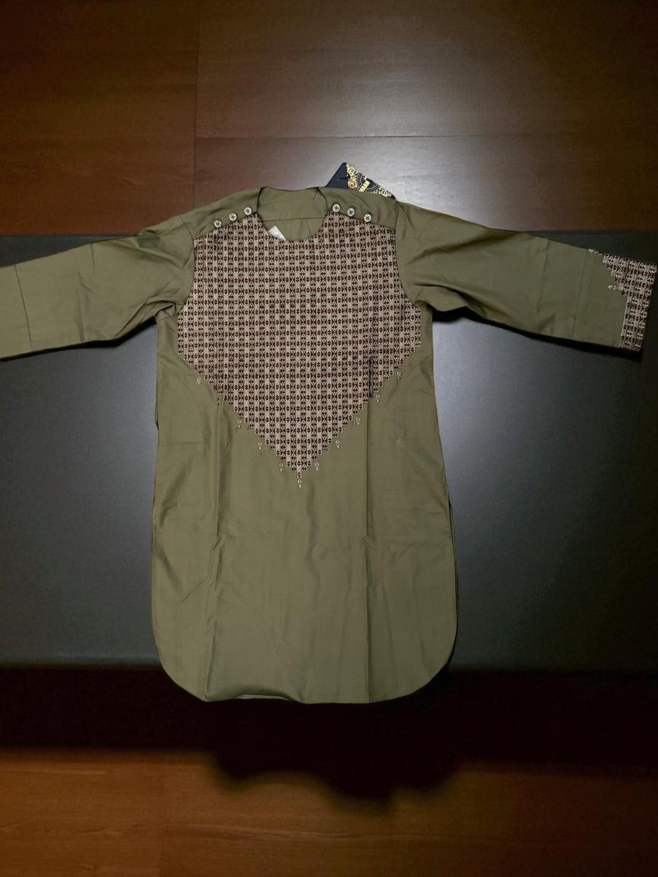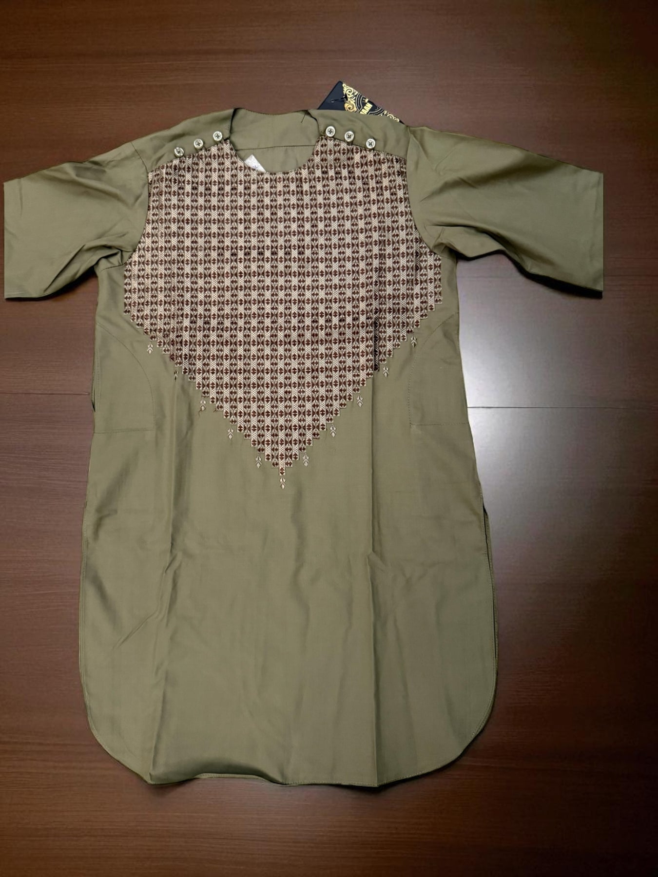 The Boys Olive Green Parahan Tumban from Luqmaan Boutique is the perfect blend of tradition, comfort, and style for young boys aged 5 years. Designed with care, this outfit celebrates Afghan cultural heritage while keeping your child comfortable throughout the day. Crafted from high-quality fabric, it ensures durability and softness, making it ideal for both daily wear and special occasions.