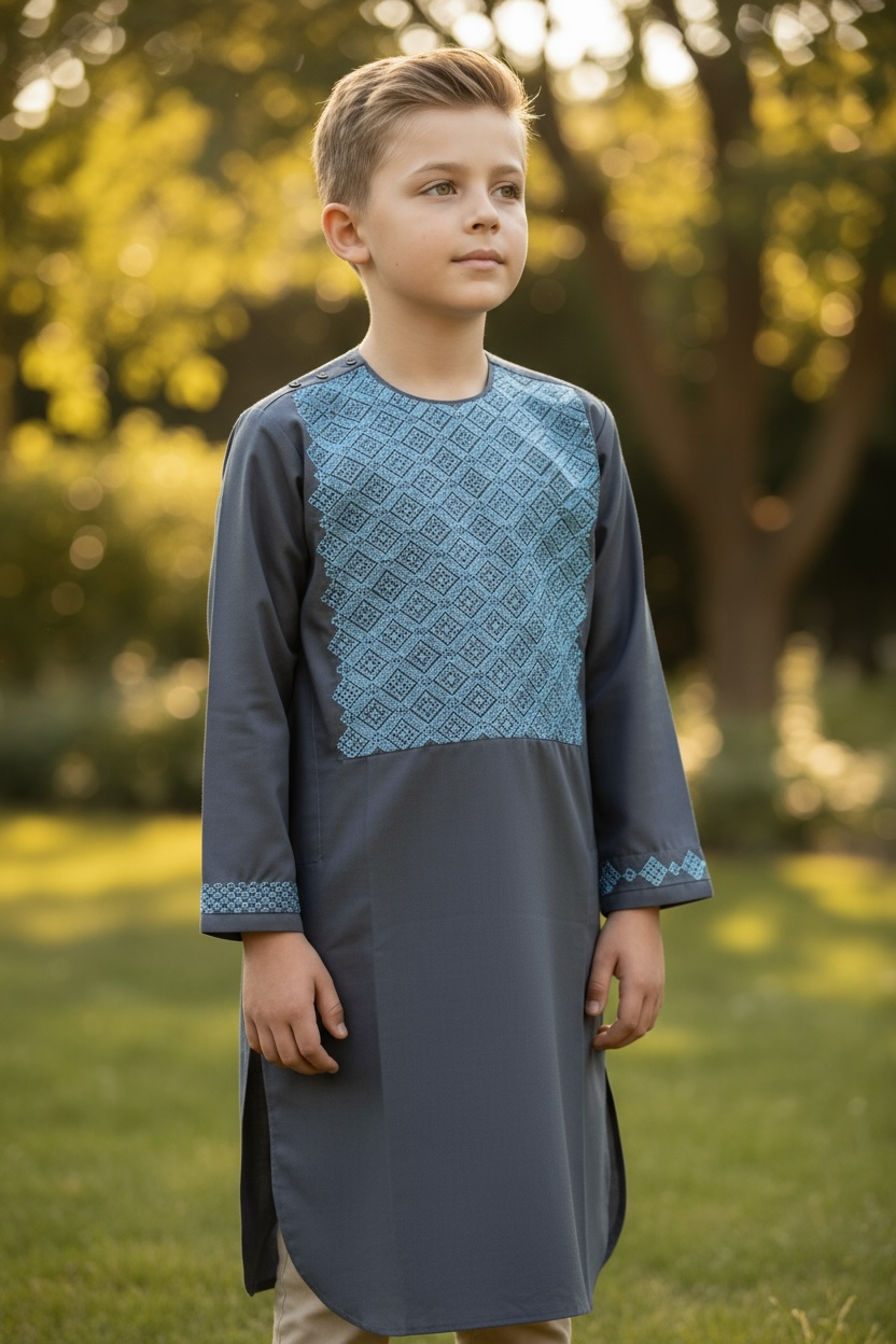 Designed for boys aged 8–9 years, this outfit features light blue machine khamak embroidery beautifully patterned across the chest and sleeves, creating a refined traditional look with a modern touch.