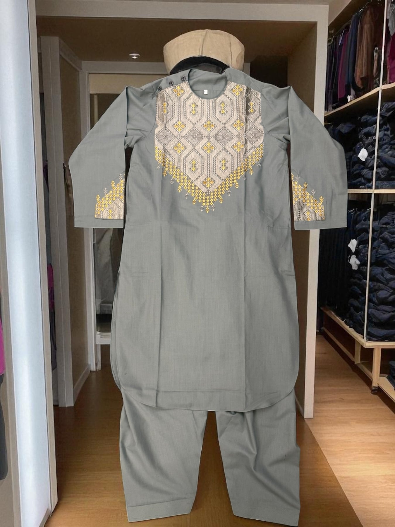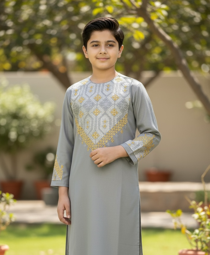 Grayish Sage Parahan Tumban for 9-10-Year-Old Boys from Luqmaan Boutique, a perfect blend of tradition, style, and comfort for your little one. Crafted with a high-quality cotton-polyester fabric, this outfit ensures a soft, breathable, and durable wear that’s ideal for festive occasions, family gatherings, or casual celebrations. The soothing grayish sage color adds a modern touch to the classic parahan tumban design, making it suitable for boys aged 9–10.
