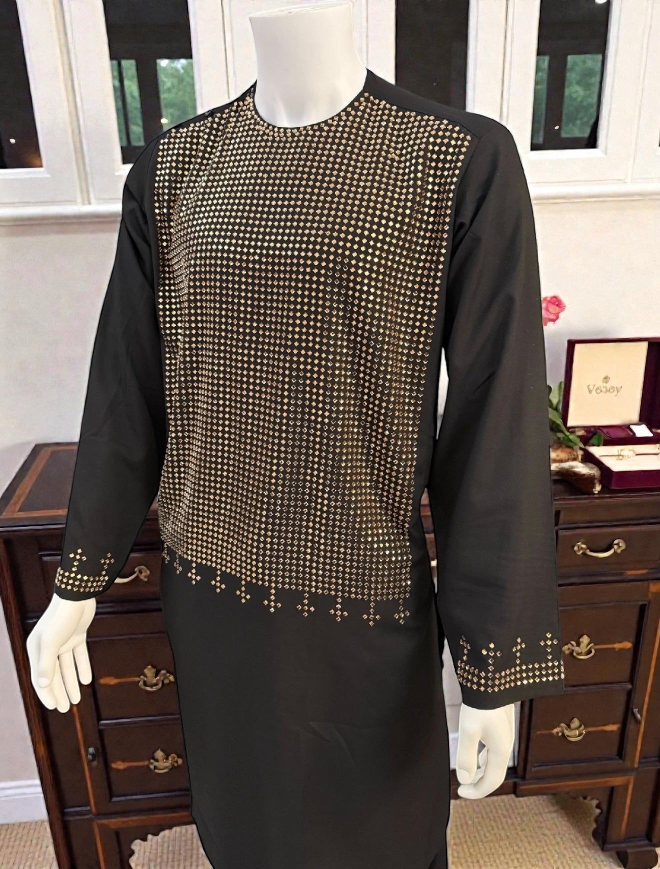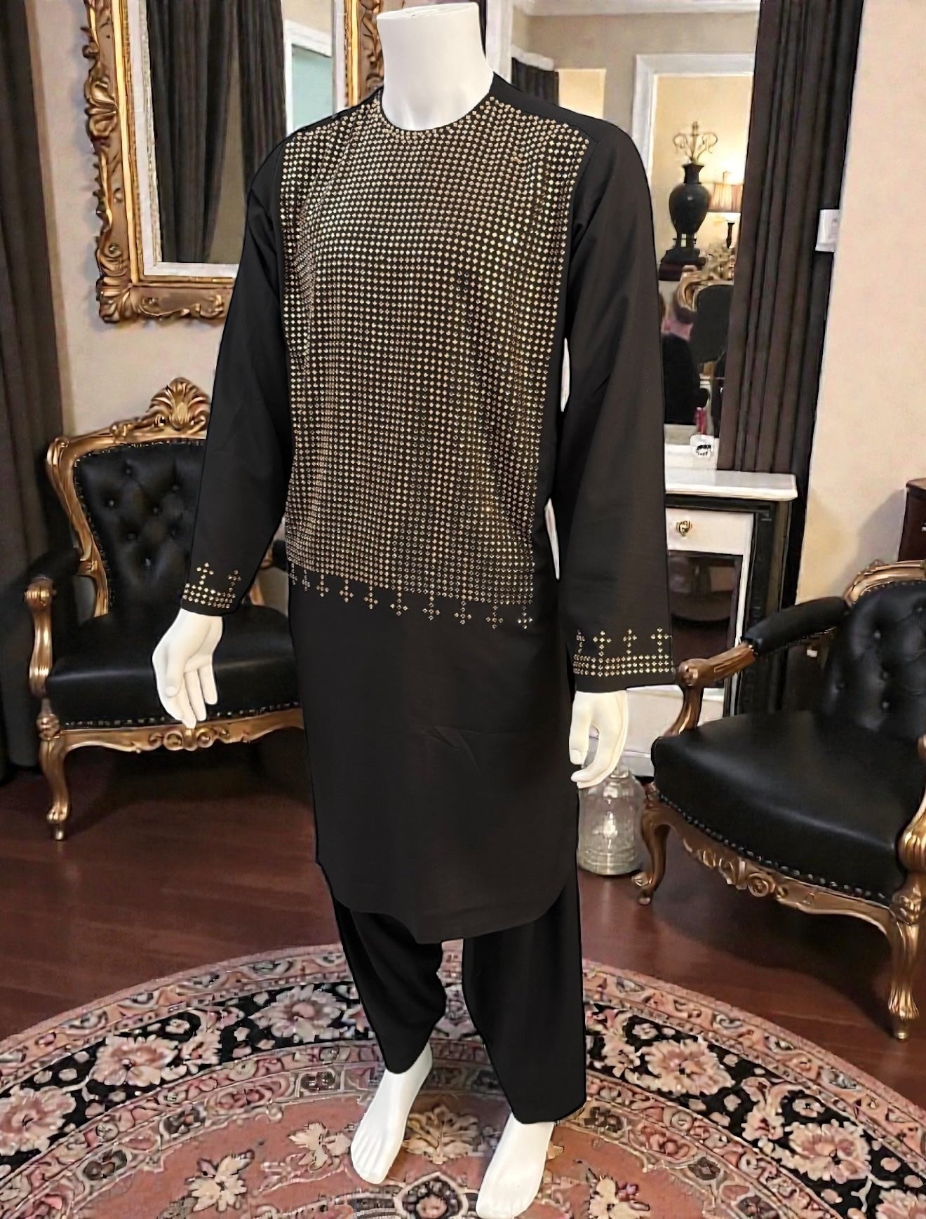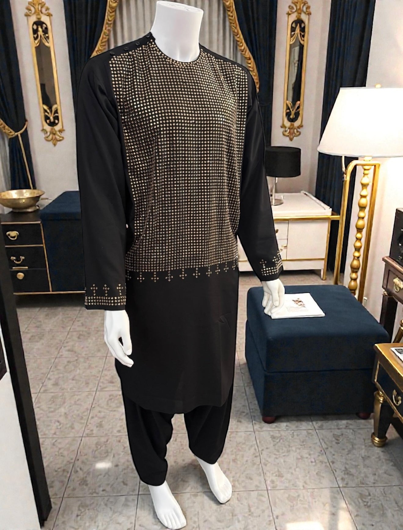 Elevate your traditional look with this men’s black Afghan kameez, featuring elegant gold mirror work detailing across the front panel. The reflective geometric pattern is carefully applied to create a refined and eye-catching design, complemented by subtle matching mirror accents on the sleeve cuffs.