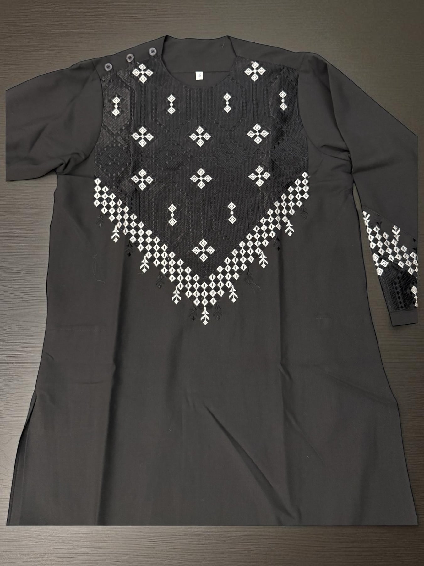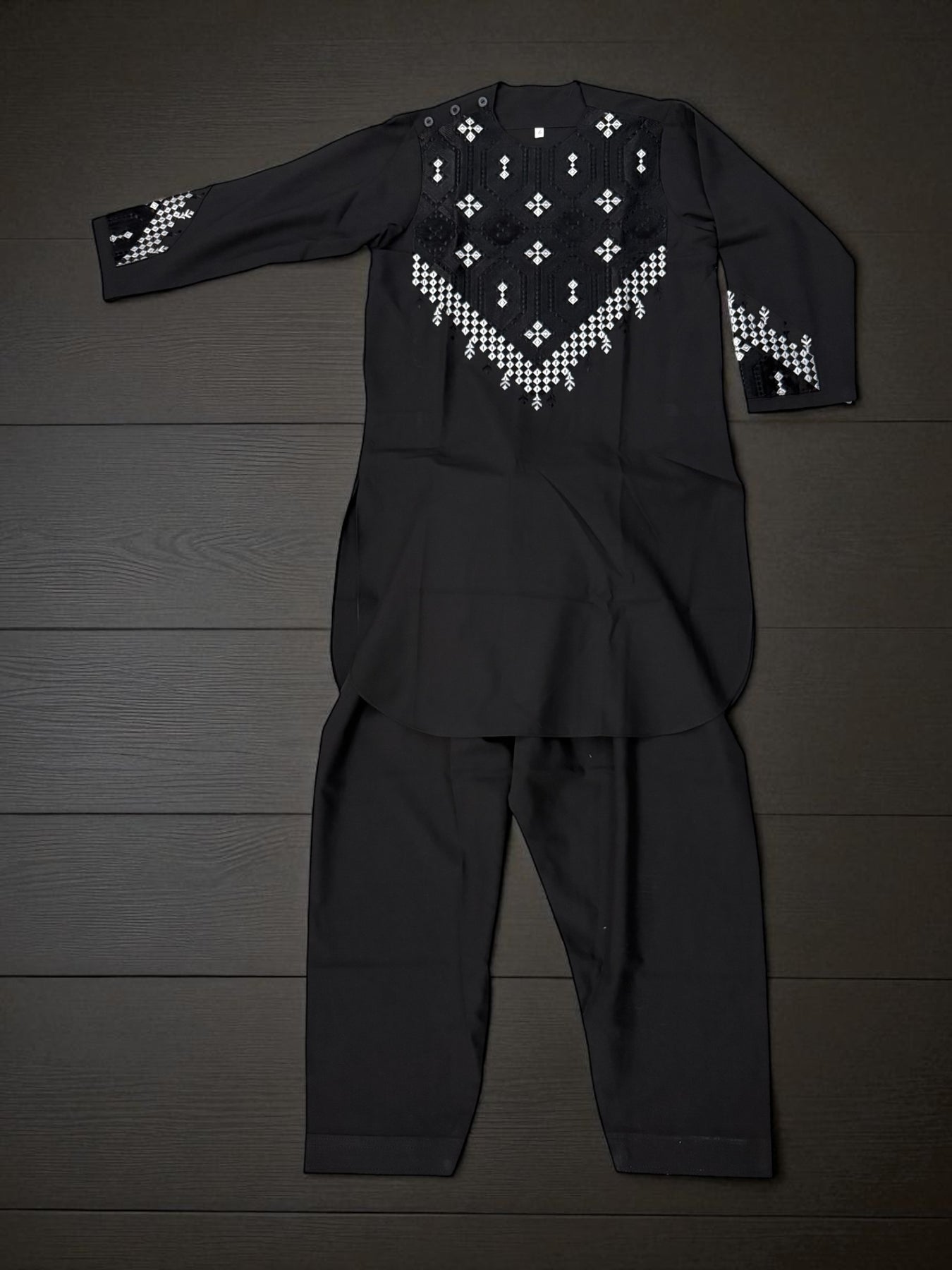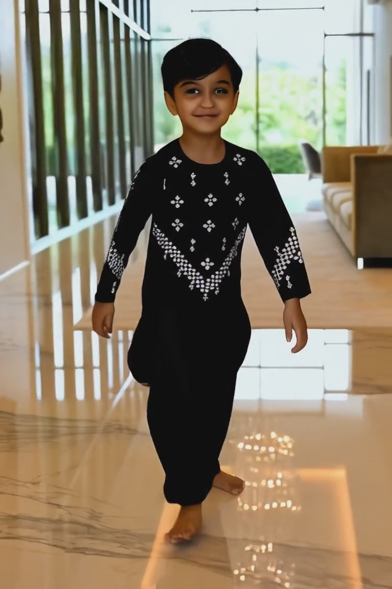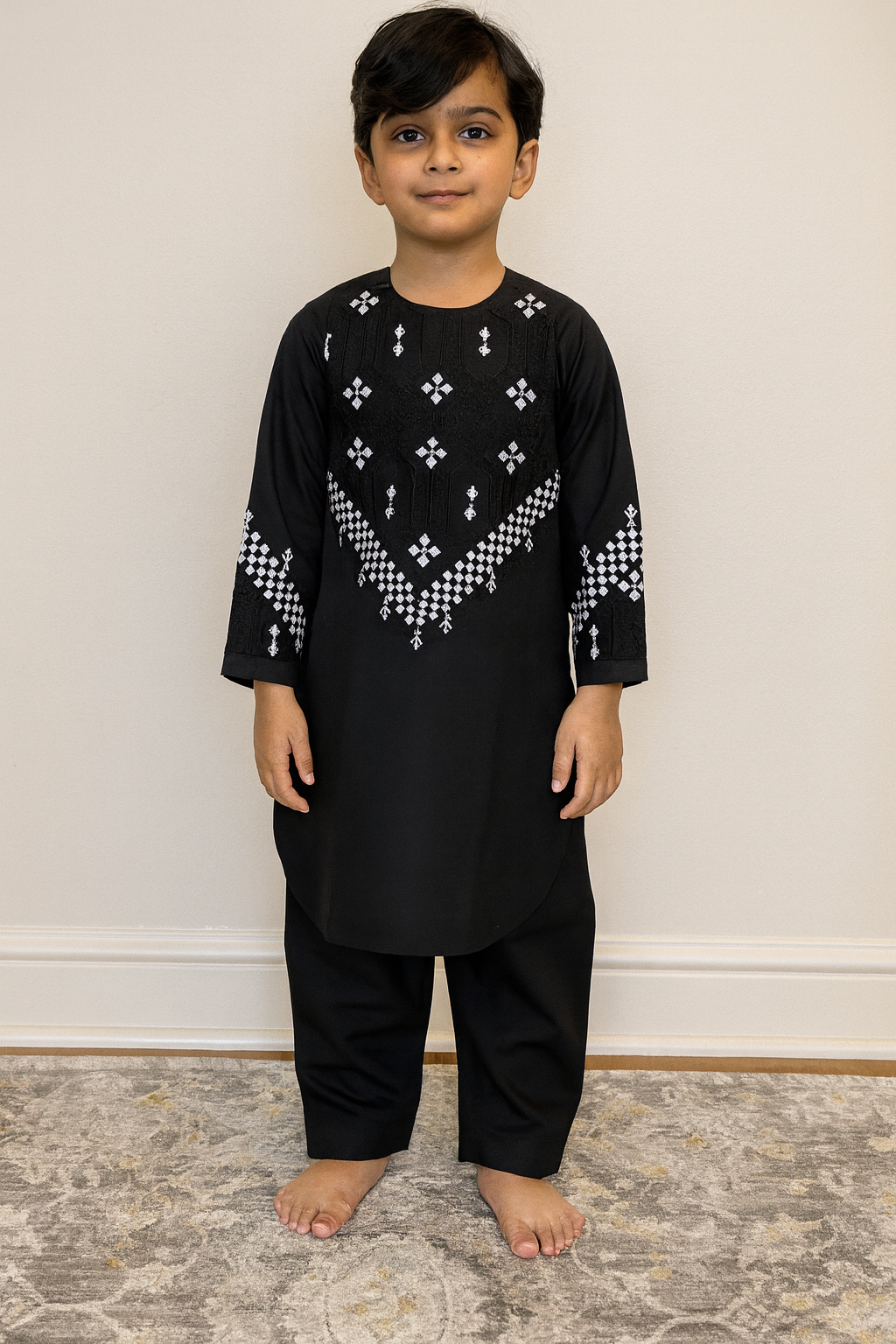 Dress your little one in elegance and comfort with the 6-Year-Old Boys Black Parahan Tumban from Luqmaan Boutique. Designed with meticulous attention to detail, this outfit combines traditional charm with modern quality, making it perfect for festive occasions, family gatherings, or casual wear. The sleek black color of the Parahan Tumban is complemented by intricate white and matching black Khamak embroidery, adding a touch of sophistication and style that will make your child stand out.