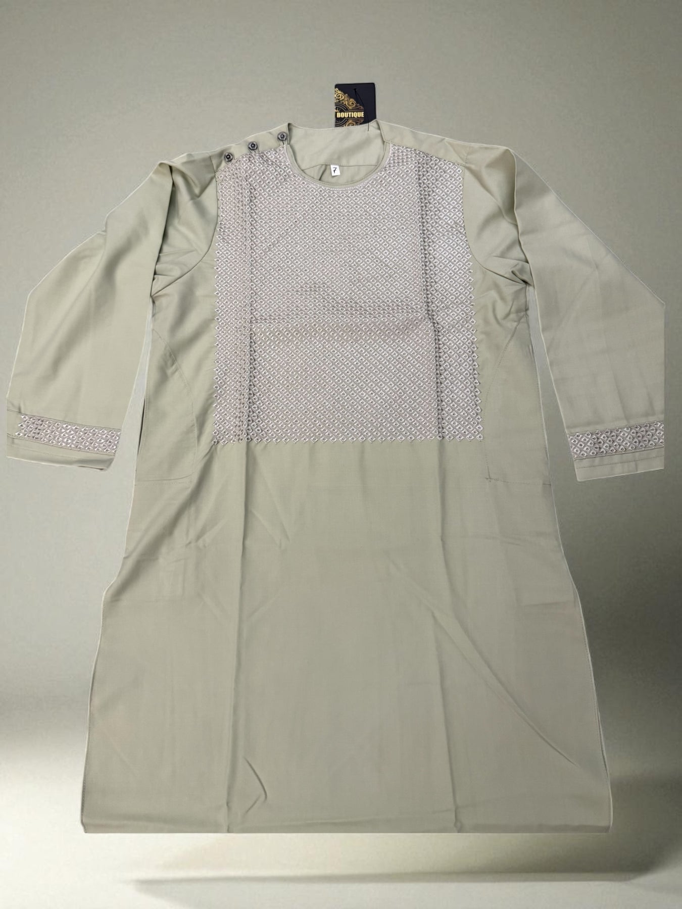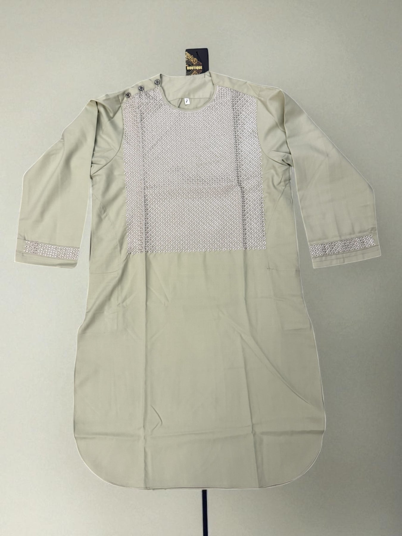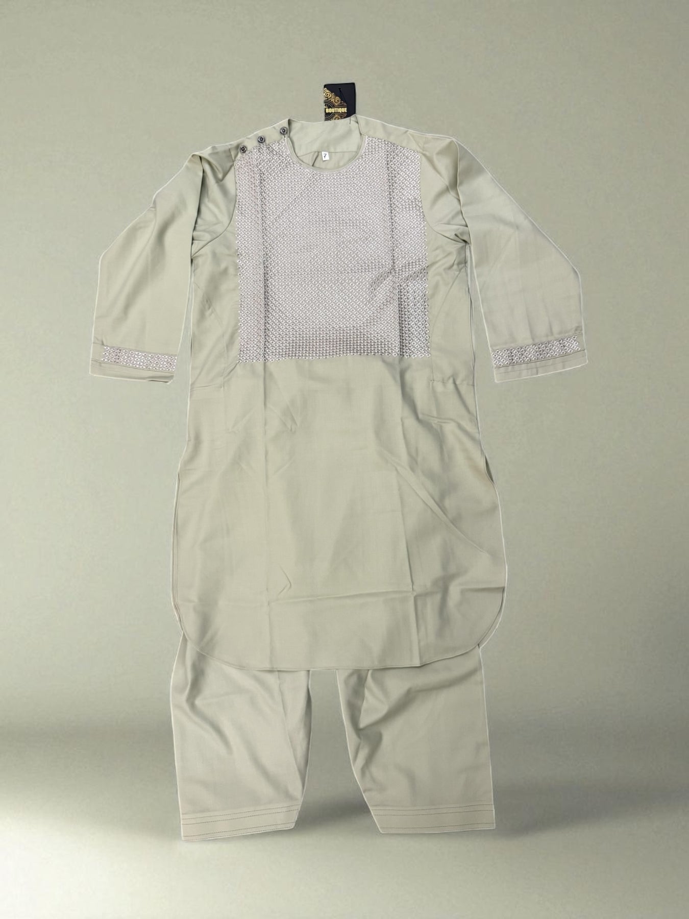 Dress your little one in elegance and comfort with the 7-Year-Old Boys Pistachio Parahan from Luqmaan Boutique. Crafted with care from a soft cotton-polyester blend, this outfit offers a perfect balance of breathability and durability, making it ideal for festive occasions, family gatherings, and special celebrations. The soothing pistachio color adds a fresh and vibrant touch to your child’s wardrobe, ensuring he stands out with charm and sophistication.
