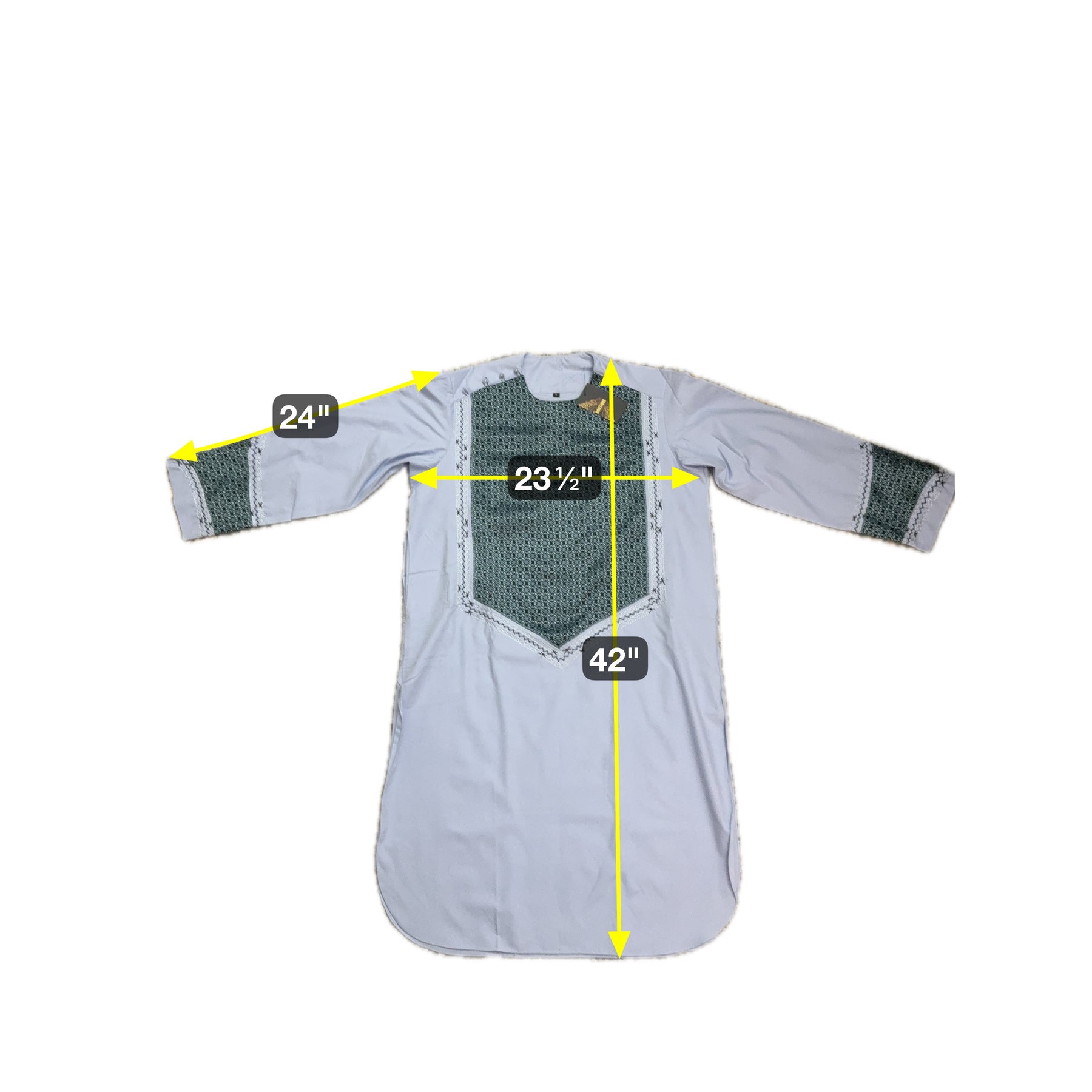 Chest Width: 23.5 in.Shoulder Width: 18.0 in.Body Length: 42.0 in.Sleeve Length: 24.0 in.Sleeve Opening Width: 7.0 in.Pants/tumban: 38.5 in.
