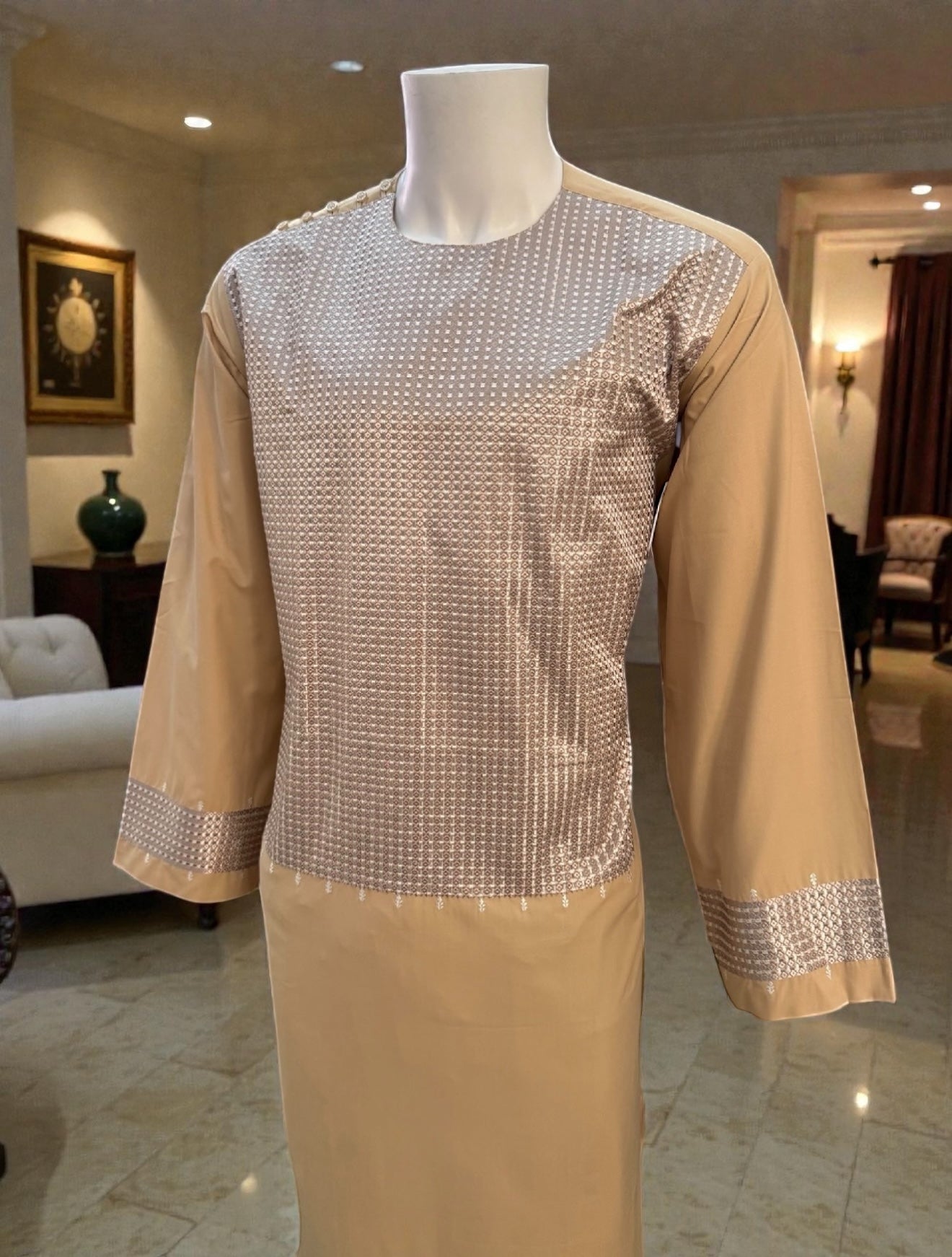 Designed for long wear and easy movement, this tan embroidered outfit is a great option for anyone looking for a traditional Afghan set with neutral, earthy color tones.