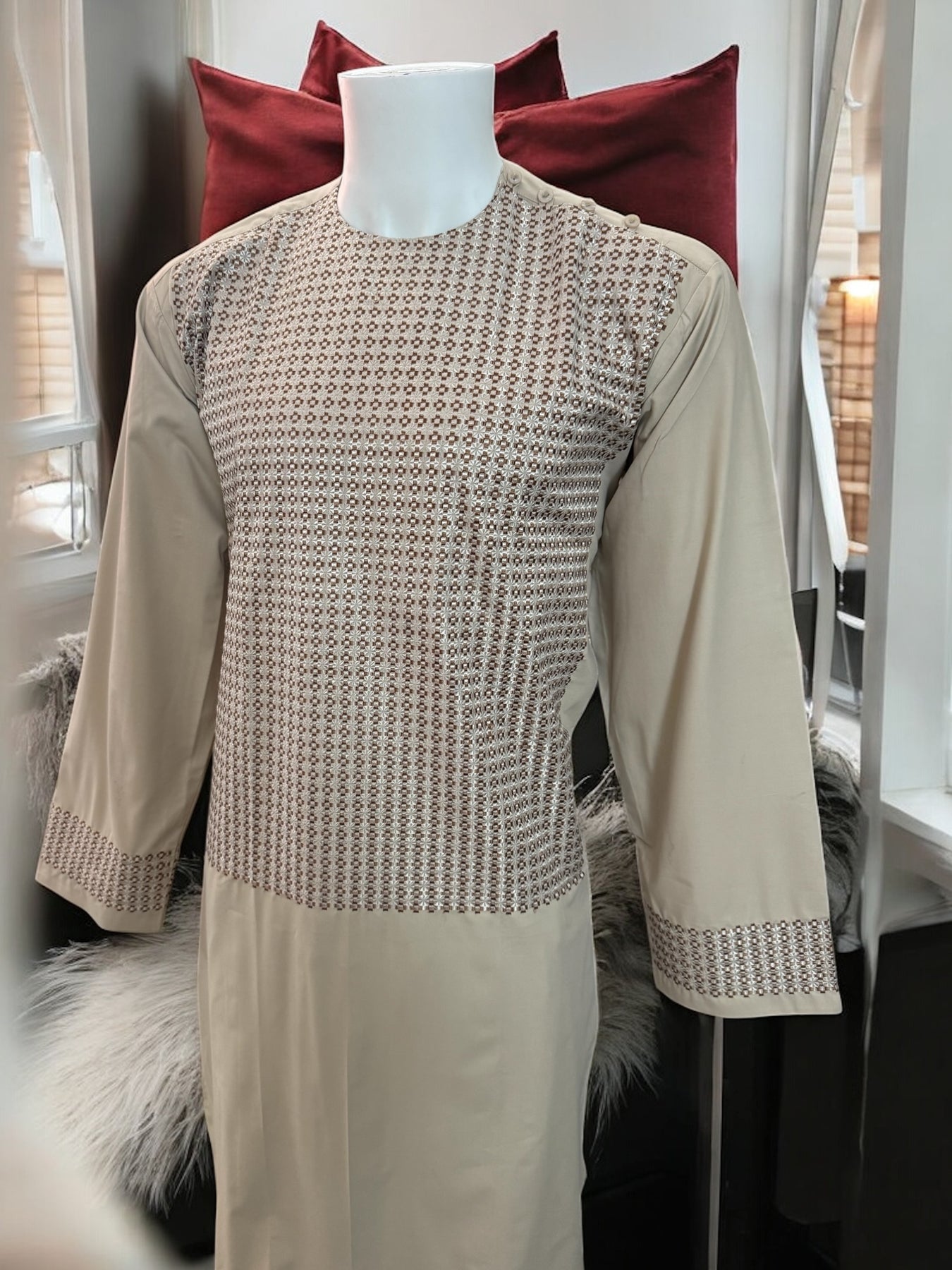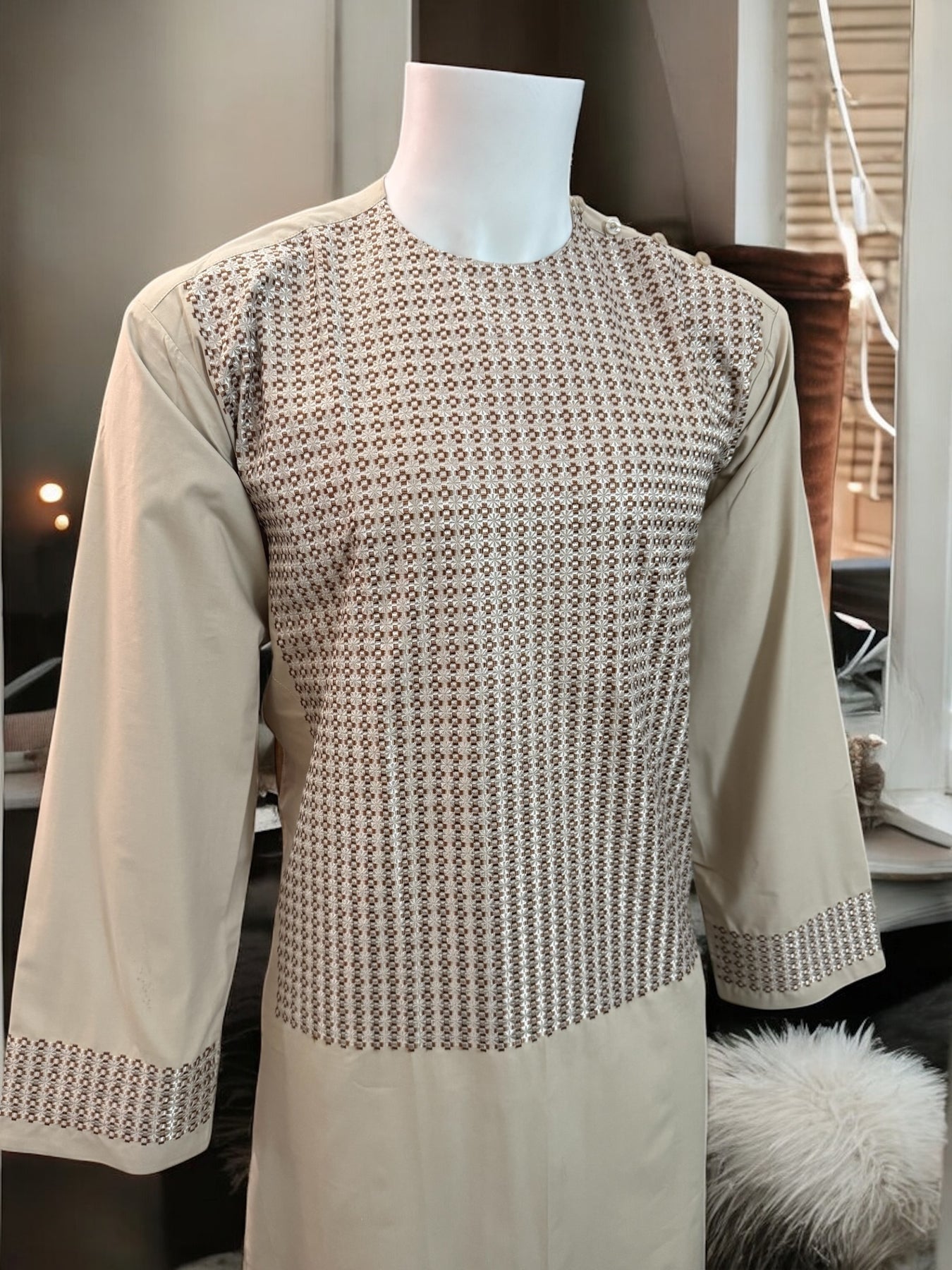 This elegant Afghan traditional kameese shalwar features refined machine khamakdozi embroidery across the front panel and sleeve cuffs, offering a clean and sophisticated look. Designed for comfort and everyday elegance, the outfit showcases a relaxed fit with smooth tailoring, making it ideal for cultural events, Friday wear, Ramadan, and Eid occasions.