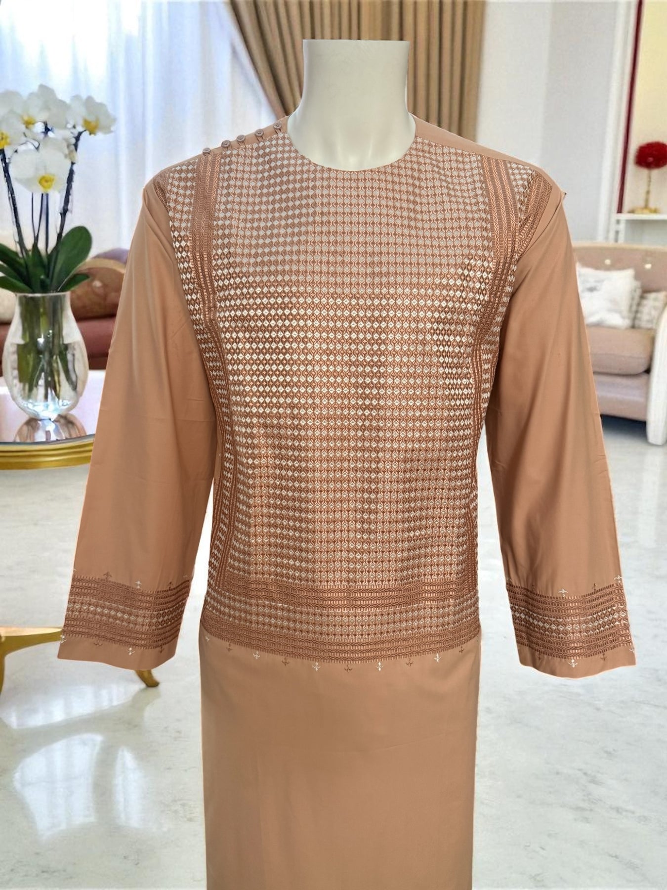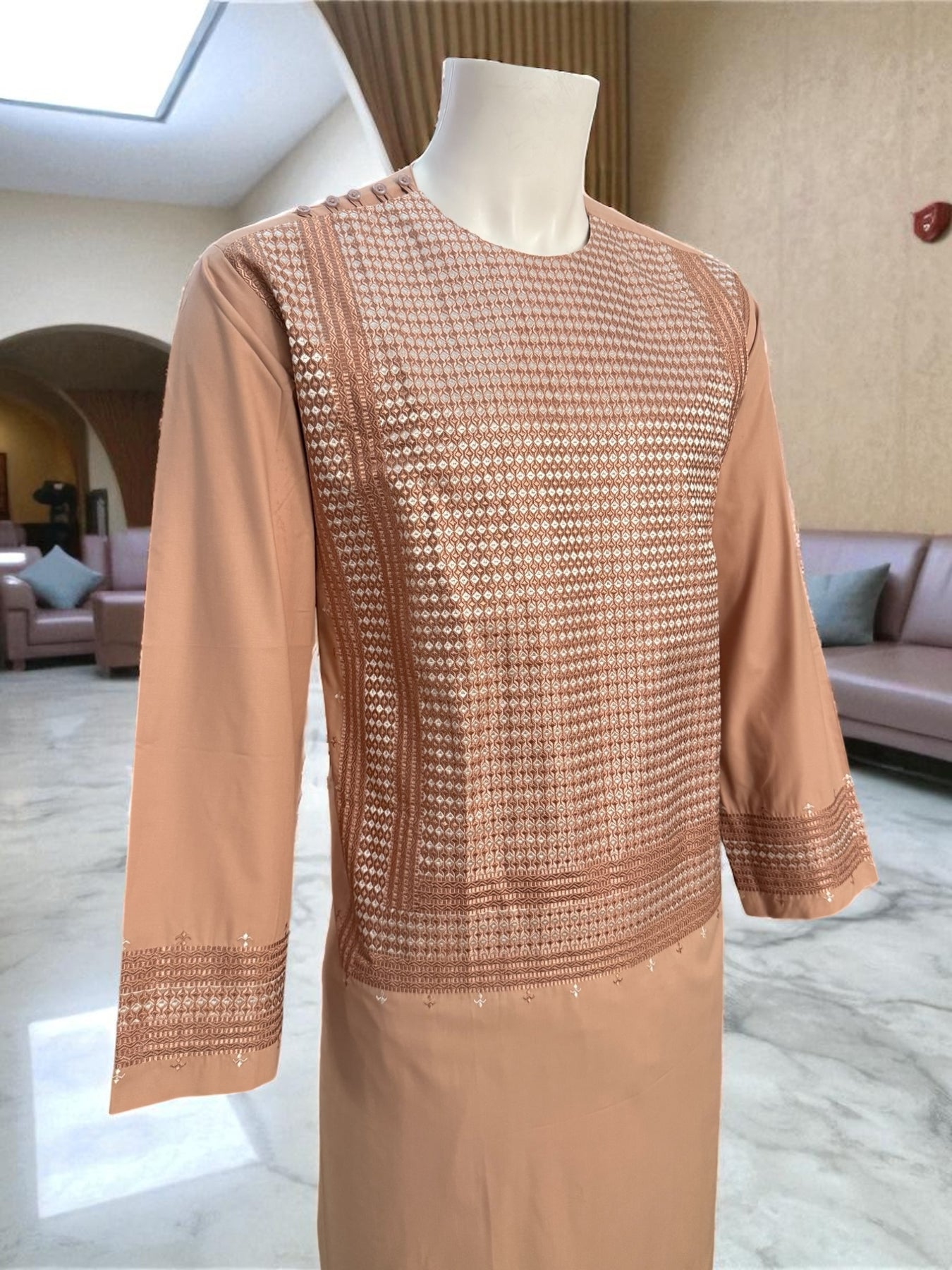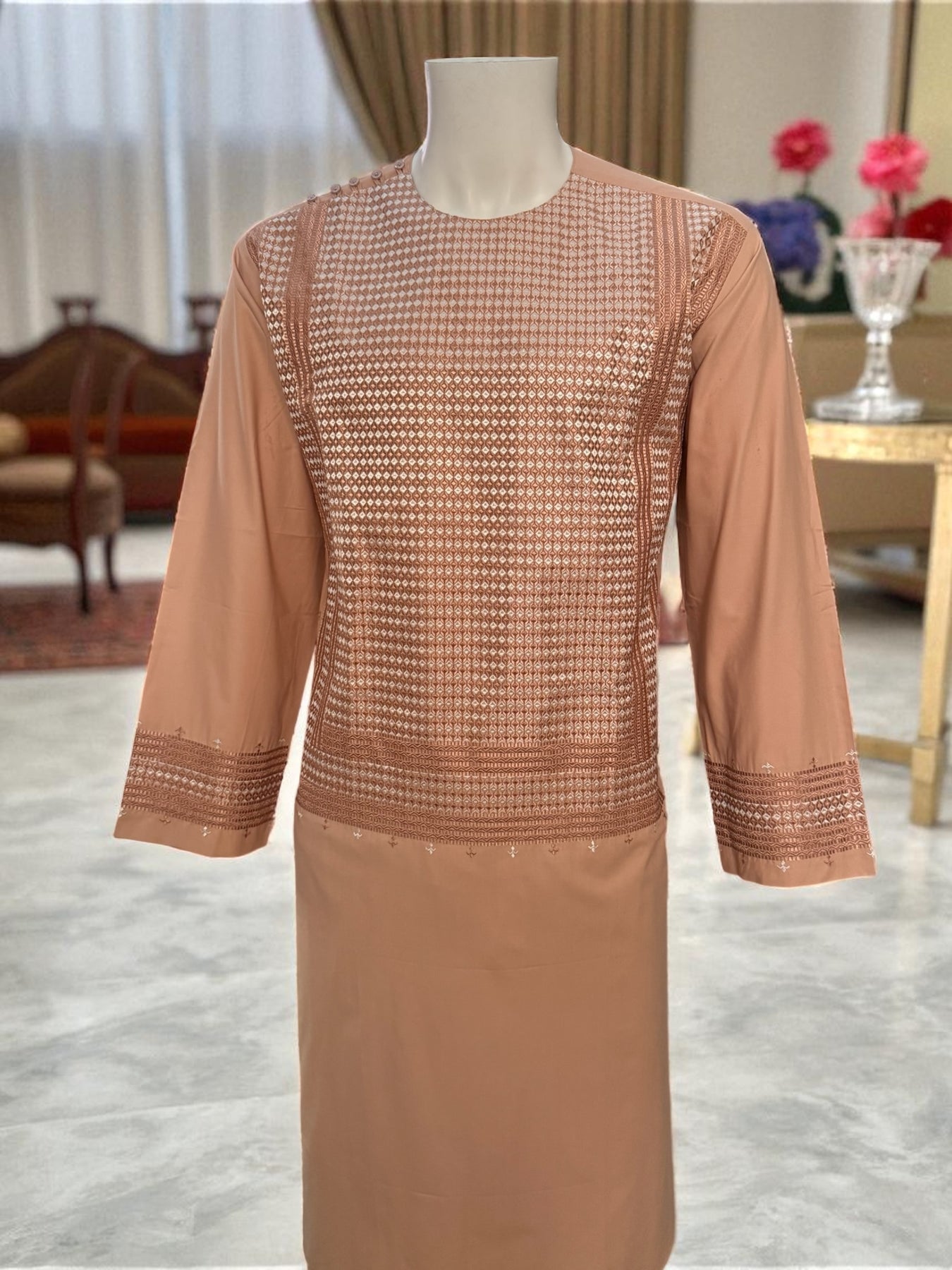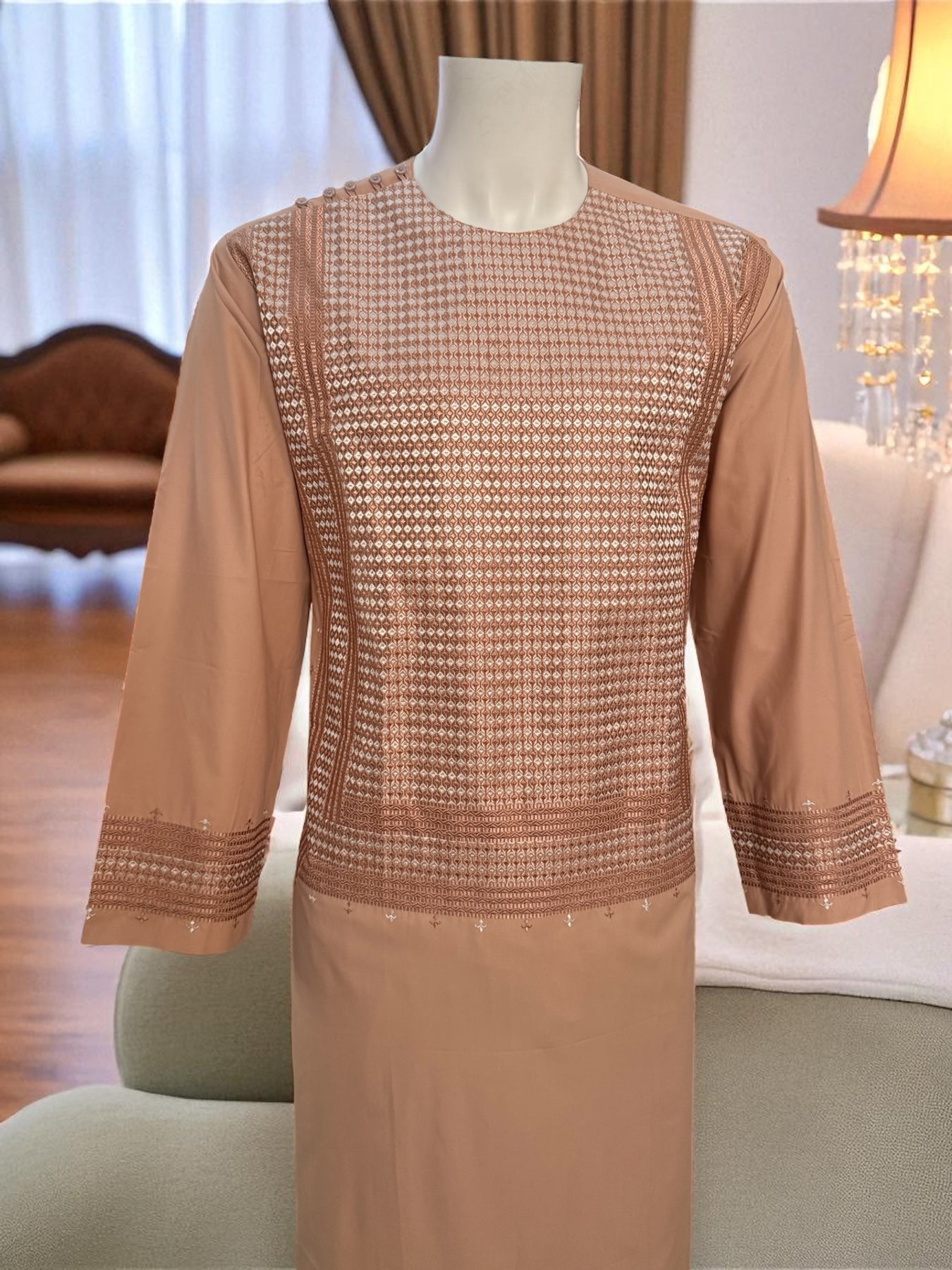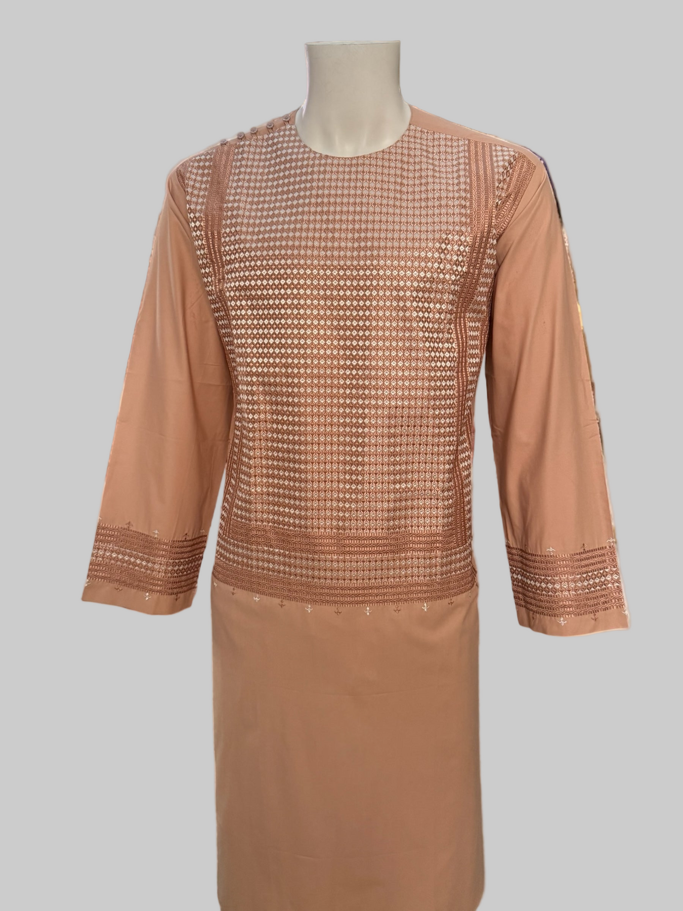 This XL Afghan men’s kameez is made from premium rosewood beige fabric and finished with high-quality matching embroidery across the chest and sleeves. The soft, smooth material offers comfort, while the coordinated embroidery adds an elegant traditional look.
